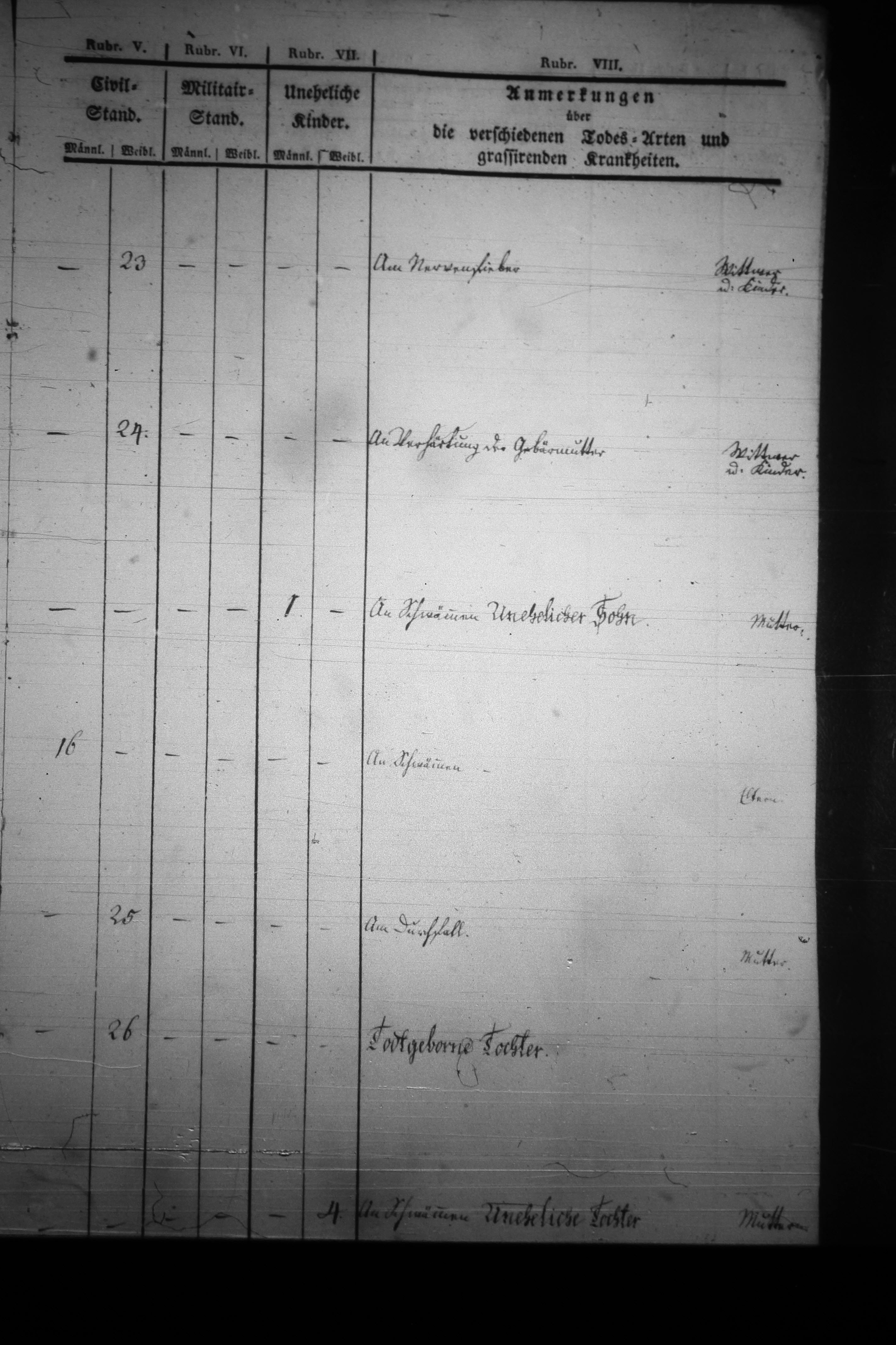 | Text | Quellenscan: http://bilder.goldberg-haynau.de/Kauffung/Sterbef%C3%A4lle/1836/mom_1176.JPG http://bilder.goldberg-haynau.de/Kauffung/Sterbef%C3%A4lle/1836/mom_1177.JPG [color=#FF0000]Quelle B315, [/color] Begräbnisse Kauffung 1836-07 Pag 7 Nr. 41 den 28. Juli 1836 Wurde auf den hiesigen Kirchhof begragen des Ehrenfried Langer, Gärtner in Ober Kauffung-Stimpel Ehefrau namens Johanne Beate geborene Hübner, welche den 26. des Monats früh um 4:00 Uhr am Nervenfieber gestorben. Alt: 37 Jahre und 4 Monate. Nr. 42 den 29. Juli 1836 Wurde auf den hiesigen Kirchhof begragen des Meisters Johann Gottlob Gebauer, Freihäusler und Tischler in Mittel Kauffung Ehefrau namens Johanne Juliane geborene Blümel, welche den 25. des Monats nachmittags um 5:30 Uhr an Verhärtung der Gebärmutter gestorben. Alt: 51 Jahre, 8 Monate und 2 Tage. Nr. 43 den 4. August 1836 Wurde auf den hiesigen Kirchhof begragen der Johanne Eleonore Langer, des weiland Johann Gottfried Langer, gewesener Inwohner in Ober Kauffung-Stöckel nachgelassenen 4. Tochter unehelich geborener Sohn namens Johann Carl Wilhelm, welcher den 31. Juli mittags um 11:30 Uhr an Schwämmen gestorben. Alt: 6 Monate. Nr. 44 den 6. August 1836 Wurde auf den hiesigen Kirchhof begragen des Johann Gottlieb Blümel, Häusler und Bergmann in Ober Kauffung jüngster Sohn namens Ernst Heinrich, welcher den 3. des Monats abends um 10:00 Uhr an den Schwämmen gestorben. Alt: 16 Tage Nr. 45 den 7. August 1836 Wurde auf den hiesigen Kirchhof begragen des weiland Johann Gottlob Friebe, gewesener Hofehäusler in Ober Kauffung-Lest nachgelassene jüngste Tochter namens Johanne Christiane, welche den 3. des Monats nachts um 12:00 Uhr am Durchfall gestorben. Alt: 3 Jahre und 7 Monate. Nr. 46 den 8. August 1836 Wurde auf den hiesigen Kirchhof begragen des Johann Carl Mäuer (Meuer), Freigärtner und Kretschmer in Mittel Kauffung, von seiner Ehefrau Johanne Christiane geborene Freche den 6. des Monats nachmittags um 5:00 Uhr tot geborene Tochter. Nr. 47 den 9. August 1836 Wurde auf den hiesigen Kirchhof begragen der Johanne Christiane Schwarzer, des Ernst Benjamin schwarzer, Hofegärtner in Ober Kauffung-Lest jüngsten Tochter eheliche Tochter namens Christiane Henriette, welche den 6. des Monats nachmittags um 3:00 Uhr an den Schwämmen gestorben. Alt: 4 Monate und 22 Tage. | |