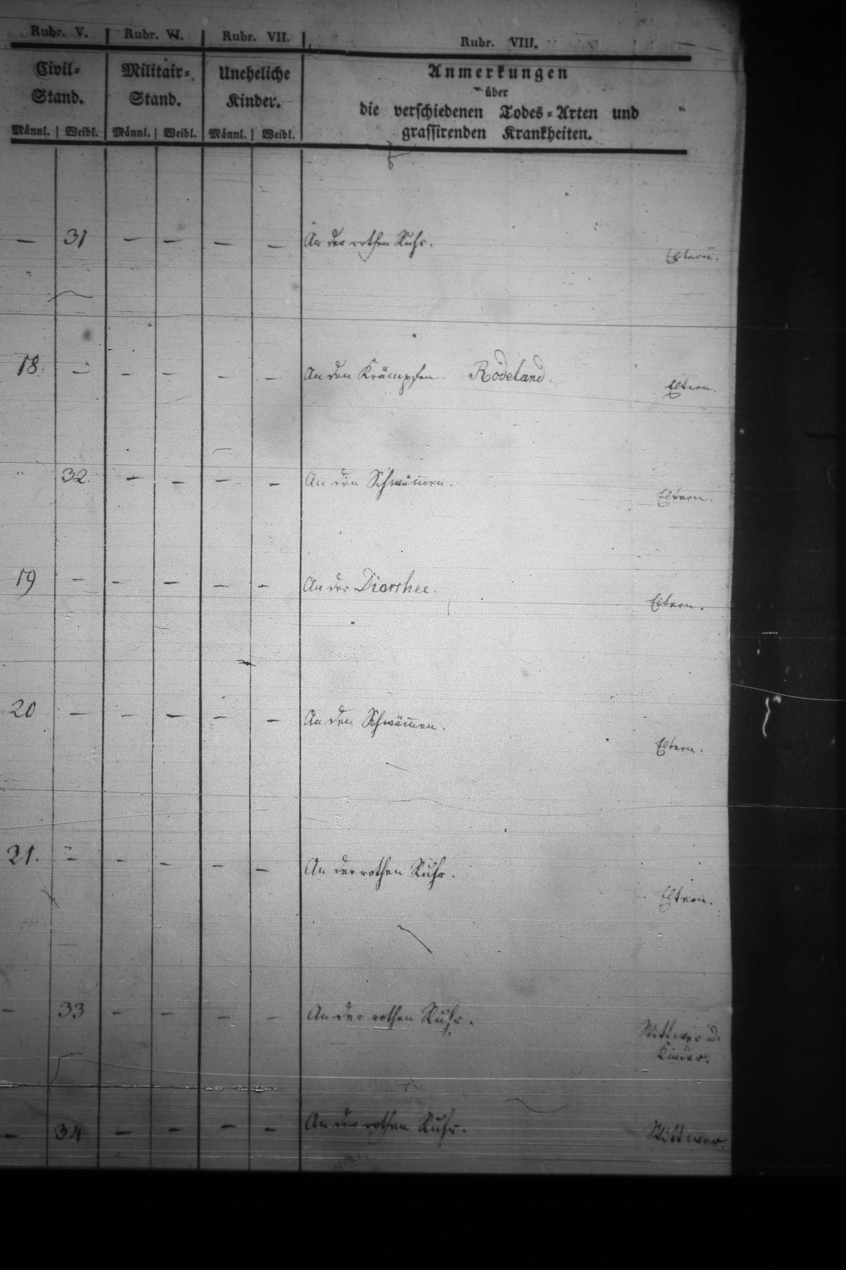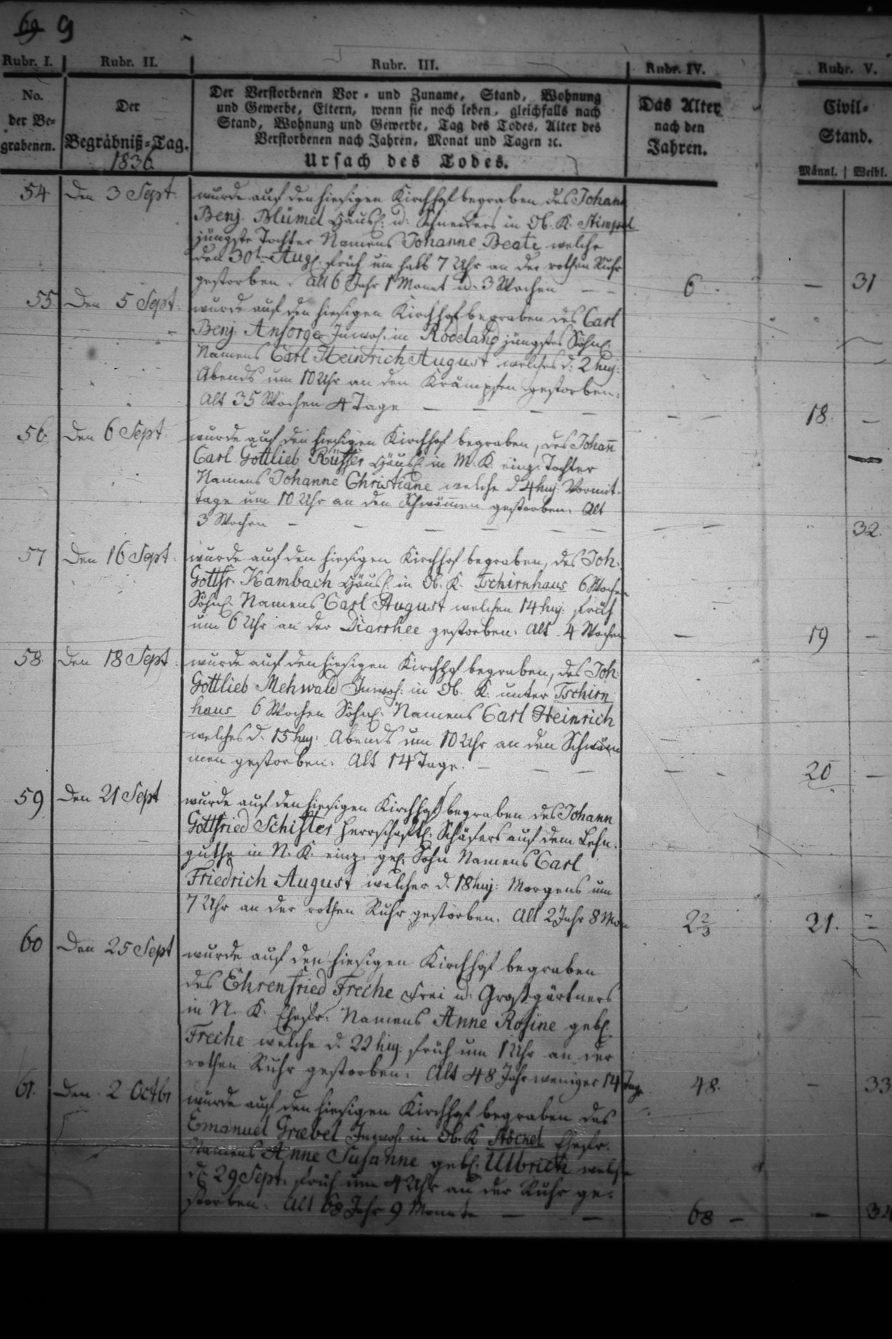 Text | Quellenscan: http://bilder.goldberg-haynau.de/Kauffung/Sterbef%C3%A4lle/1836/mom_1180.JPG http://bilder.goldberg-haynau.de/Kauffung/Sterbef%C3%A4lle/1836/mom_1181.JPG [color=#FF0000]Quelle B317[/color] Begräbnisse Kauffung 1836-09 Pag 9 Nr. 54 den 3. September 1836 Wurde auf den hiesigen Kirchhof begragen des Johann Benjamin Blümel, Häusler und Schneider in Ober Kauffung-Stimpel, jüngste Tochter namens Johanne Beate, welche den 30. August früh um 6:30 Uhr an der Roten Ruhr gestorben Alt: 6 Jahre, ein Monat und 3 Wochen. Nr. 55 den 5. September 1836 Wurde auf den hiesigen Kirchhof begragen des Carl Benjamin Ansorge, Inwohner in Kauffung-Rodeland jüngster Sohn namens Carl Heinrich August, welcher den 2. des Monats abends um 10:00 Uhr an den Krämpfen gestorben Alt: 35 Wochen und 4 Tage. Nr. 56 den 6. September 1836 Wurde auf den hiesigen Kirchhof begragen des Johann Carl Gottlieb Rüffer, Häusler in Mittel Kauffung einzige Tochter namens Johanne Christiane, welche den 4. des Monats vormittags um 10:00 Uhr an den Schwämmen gestorben. Alt: 3 Wochen. Nr. 57 den 16. September 1836 Wurde auf den hiesigen Kirchhof begragen des Johann Gottfried Kambach, Häusler in Ober Kauffung-Tschirnhaus 6 Wochen Söhnlein namens Carl August, welches den 14. des Monats früh um 6:00 Uhr an der Diarrhee gestorben. Alt: 4 Wochen Nr. 58 den 18. September 1836 Wurde auf den hiesigen Kirchhof begragen des Johann Gottlieb Mehwald, Inwohner in Ober Kauffung unter Tschirnhaus 6 Wochen Söhnlein namens Carl Heinrich, welches den 15. des Monats abends um 10:00 Uhr an den Schwämmen gestorben. Alt: 14 Tage. Nr. 59 den 21. September Wurde auf den hiesigen Kirchhof begragen des Johann Gottfried Schifter, herrschaftlicher Schäfer auf dem Lehngute in Nieder Kauffung einziger Sohn namens Carl Friedrich August, welcher den 18. des Monats morgens um 7:00 Uhr an der Rotenburg gestorben. Alt: 2 Jahre und 8 Monate Nr. 60 den 25. September 1836 Wurde auf den hiesigen Kirchhof begragen des Ehrenfried Freche, Frey-und Großgärtner in Nieder Kauffung Ehefrau namens Anne Rosine geborene Freche, welche den 22. des Monats früh um 12:00 Uhr an der Roten Ruhr gestorben. Alt: 48 Jahre weniger 14 Tage. Nr. 61 den 2. Oktober 1836 Begraben des Immanuel Griebel, Inwohner in Ober Kauffung-Stöckel Ehefrau namens Anne Susanne geborene Ulbrich, welche den 29. September früh um 4:00 Uhr an der Ruhr gestorben. Alt: 68 Jahre und 9 Monate. | |