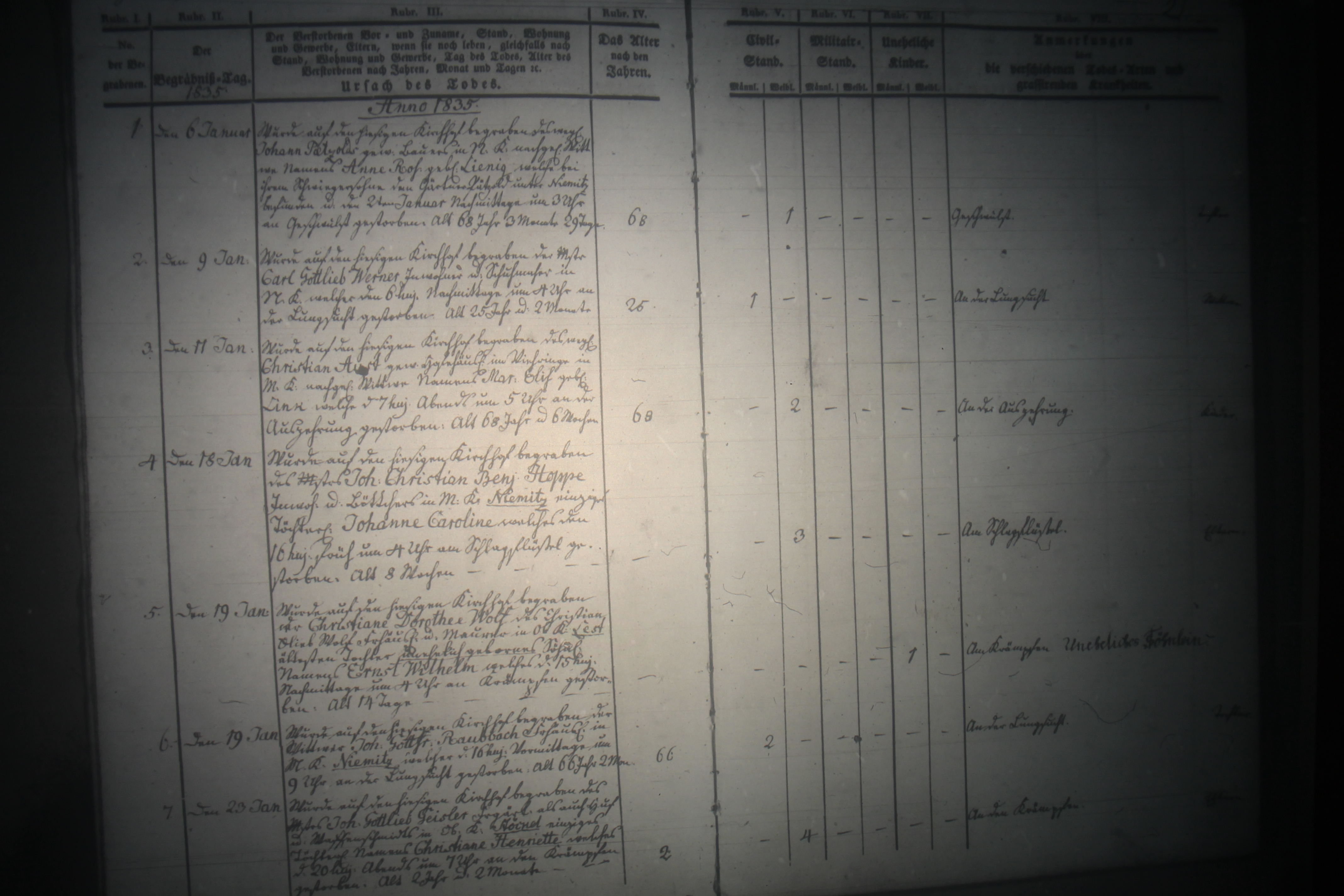 Text | Quellenscan: http://bilder.goldberg-haynau.de/Kauffung/Sterbef%c3%a4lle/mormonen1%20363.JPG [color=#FF0000]Quelle B321[/color] Begräbnisse 1835-01 Nr. 1 den 6. Januar 1835 wurde auf dem hiesigen Kirchhof begraben des weiland Johann Pätzold, gewesener Bauer in Nieder Kauffung, nachgelassene Witwe namens Anne Rosine geborene Lienig, welche bei dem Schwiegersohn, dem Gärtner Pätzold unter Niemitz gefunden und den 2. Januar nachmittags 3:00 Uhr an Geschwulst gestorben Alter: 68 Jahre, 3 Monate und 29 Tage Nr. 2 den 9. Januar 1835 Wurde auf dem hiesigen Kirchhof begraben der Meister Carl Gottlieb Werner, Inwohner und Schumacher in Nieder Kauffung, welcher den 6. des Monats nachmittags um 4:00 Uhr an der Lungensucht gestorben. Alter: 25 Jahre und 2 Monate. Nr. 3 den 11. Januar 1835 wurde auf dem hiesigen Kirchhof begraben des weiland Christian Aust, gewesener Hofehäusler in Kauffung Viehring in Mittel Kauffung, nachgelassene Witwe namens Maria Elisabeth geborene Link, welche den 7. des Monats abends um 5:00 Uhr an der Auszehrung gestorben Alter: 68 Jahre und 6 Wochen Nr. 4 den 18. Januar 1835 wurde auf den hiesigen Kirchhof begraben der Meister Johann Christian Benjamin Hoppe,Hohner und Böttcher in Mittel Kauffung Niemitz einziges Töchterlein Johanne Karoline, welches den 16. des Monats früh um 4:00 Uhr am Schlagflüssel gestorben. Alter: 8 Wochen Nr. 5 den 19. Januar 1835 wurde auf dem hiesigen Kirchhof begraben der Christiane Dorothee Wolf, des Christian Gottlieb Wolf, Freihäusler und Maurer in Ober Kauffung lässt ältester Tochter unehelich geborenes Söhnlein namens Ernst Wilhelm, welches den 15. des Monats nachmittags um 4:00 Uhr an Krämpfen gestorben Alter: 14 Tage Nr 6 den 19. Januar 1835 wurde auf dem hiesigen Kirchhof begraben der Wittwer Johann Gottfried Raubbach, Freihäusler in Mittel Kauffung Niemitz, welcher den 16. des Monats vormittags um 9:00 Uhr an der Lungensucht gestorben. Alter: 66 Jahre und 2 Monate Nr. 7 den 23. Januar 1835 Wurde auf dem hiesigen Kirchhof begraben des Meisters Johann Gottlieb Geisler, Freigärtner als auch Huf-und Waffenschmidt in Ober Kauffung Stöckel einziges Töchterchen namens Christiane Henriette, welches den 20. des Monats abends um 7:00 Uhr an den Krämpfen gestorben. Alter: 2 Jahre und 2 Monate | |