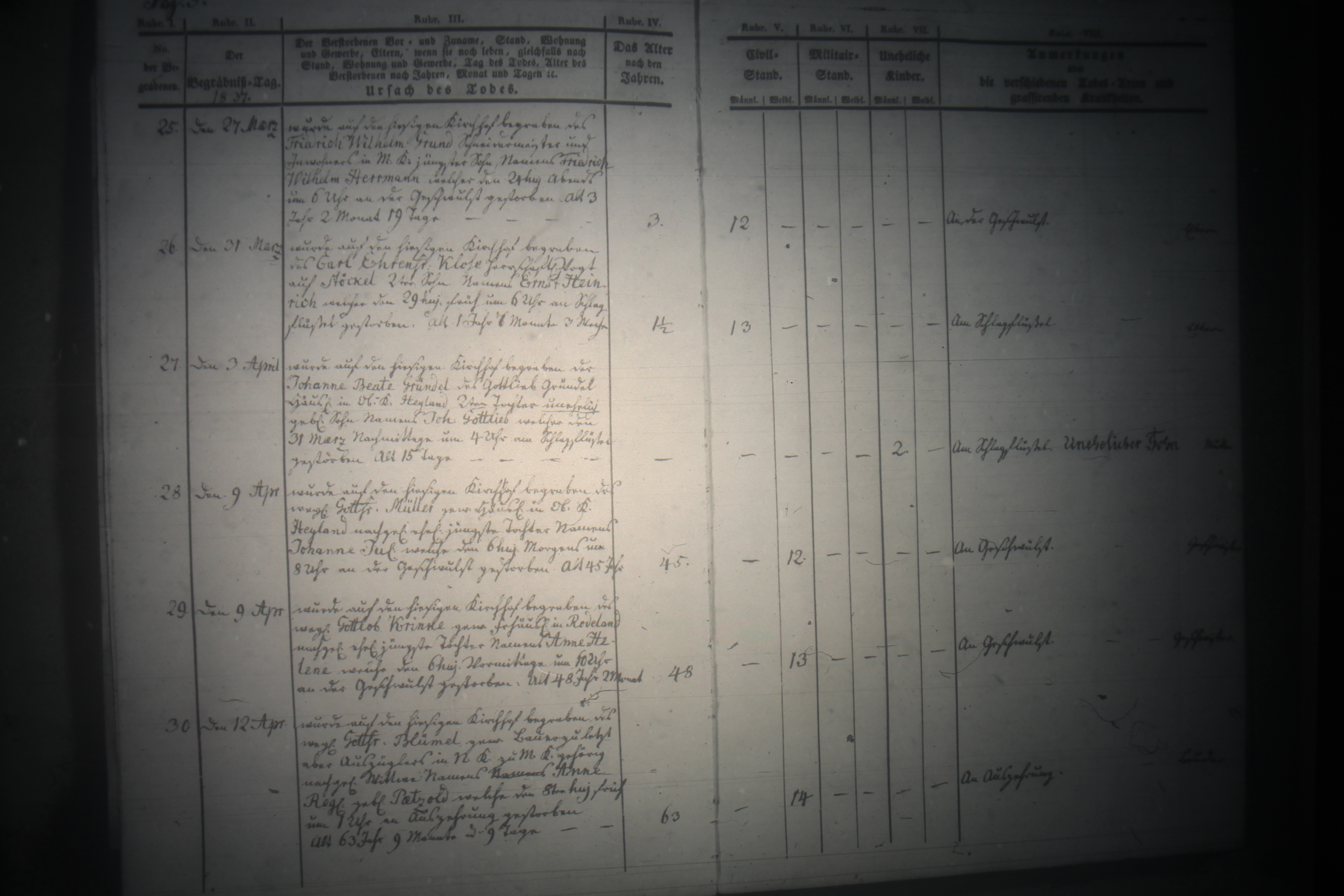 Text | Quellenscan: http://bilder.goldberg-haynau.de/Kauffung/Sterbef%C3%A4lle/1837-1841/mormonen1%20432.JPG [color=#FF0000]Quelle B336, [/color] Begräbnisse Kauffung 1837-05 Pag 5 Nr. 25 20. März 1837 Wurde auf dem hiesigen Kirchhof begraben des Friedrich Wilhelm Grund, Schreinermeister und Inwohner in Mittel Kauffung jüngster Sohn namens Friedrich Wilhelm Hermann, welcher den 24. des Monats abends um 6:00 Uhr an der Geschwulst gestorben. Alt 3 Jahre, 2 Monate und 19 Tage. Nr. 26 den 31. März 1837 Wurde auf dem hiesigen Kirchhof begraben des Carl Ehrenfried Klose, herrschaftlicher Vogt auf Stöckel 2. Sohn namens Ernst Heinrich, welcher den 29. des Monats früh um 6:00 Uhr am Schlagflüssel gestorben Alt ein Jahr, 6 Monate und 3 Wochen. Nr. 27 den 3. April 1837 Wurde auf dem hiesigen Kirchhof begraben der Johanne Beate Gründel, des Gottlieb Gründel, Häusler in Ober Kauffung-Heiland 2. Tochter unehelich geborener Sohn namens Johann Gottlieb, welcher den 31. März nachmittags um 4:00 Uhr am Schlagflüssel gestorben. Alt 15 Tage. Nr. 28 den 9. April 1837 wurde auf dem hiesigen Kirchhof begraben des weiland Gottfried Müller, gewesener Häusler in Ober Kauffung-Heiland, nachgelassene eheliche jüngste Tochter namens Johanne Juliane, welche den 6. des Monats morgens um 8:00 Uhr an der Geschwulst gestorben. Alt: 45 Jahre Nr. 29 den 9. April 1837 wurde auf dem hiesigen Kirchhof begraben des weiland Gottlob Krinke, gewesener Freihäusler in Kauffung-Rodeland nachgelassene eheliche jüngste Tochter namens Anne Helene, welche den 6. des Monats vormittags um 10:00 Uhr an der Geschwulst gestorben. Alt 48 Jahre und 2 Monate. Nr. 30 12. April 1837 Wurde auf dem hiesigen Kirchhof begraben des weiland Gottfried Blümel, gewesener Bauer, zuletzt aber Auszügler in Nieder Kauffung zu Mittel Kauffung gehörig, nachgelassene Witwe namens Anne Regine geborene Pätzold, welche den 8. des Monats früh um 1:00 Uhr an Auszehrung gestorben. Alt 63 Jahre, 9 Monate und 9 Tage. | |