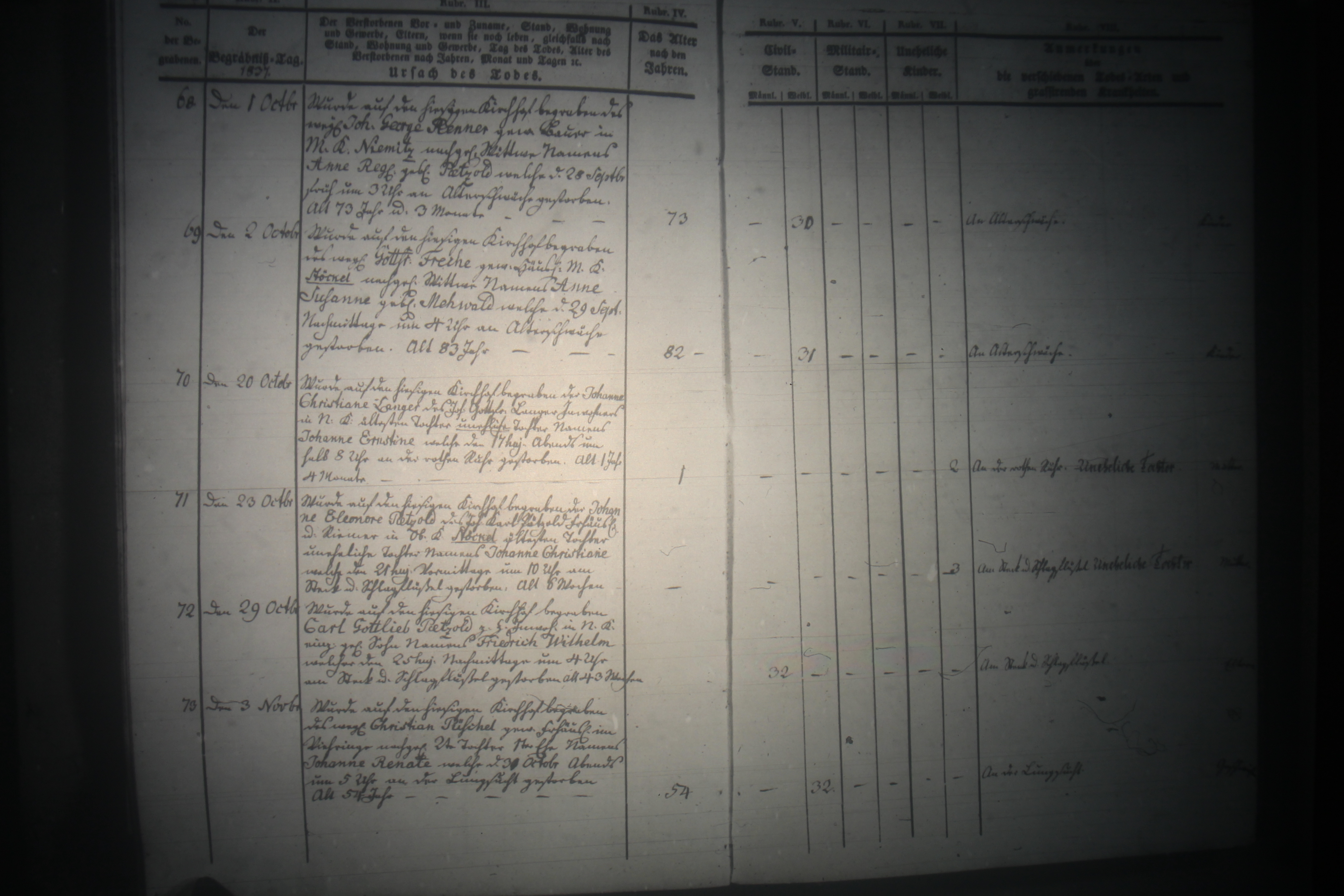 Text | Quellenscan: http://bilder.goldberg-haynau.de/Kauffung/Sterbef%C3%A4lle/1837-1841/mormonen1%20440.JPG [color=#FF0000]B343, [/color] Begräbnisse Kauffung 1837-12 Pag 12 Nr. 68 den 1. Oktober 1837 Wurde auf dem hiesigen Kirchhof begraben des weiland Johann George Renner, gewesener Bauer in Mittel Kauffung-Niemitz nachgelassene Witwen namens Anne Regine geborene Pätzold, welche den 28. September früh um 3:00 Uhr an Altersschwäche gestorben. Alt 73 Jahre und 3 Monate. Nr. 69 den 2. Oktober 1837 Wurde auf dem hiesigen Kirchhof begraben des weiland Gottfried Freche, gewesener Häusler in Mittel Kauffung-Stöckel nachgelassene Witwe namens Anne Susanne geborene Mehwald, den 29. September nachmittags um 4:00 Uhr an Altersschwäche gestorben. Alt 83 Jahre. Nr. 70 den 20. Oktober 1837 Wurde auf den hiesigen Kirchhof begraben der Johanne Christiane Langer, des Johann Gottfried Langer, Inwohner in Nieder Kauffung ältesten Tochter uneheliche Tochter namens Johanne Ernstine, welche den 17. des Monats abends um 7:30 Uhr an der roten Ruhr gestorben. Alt ein Jahr und 4 Monate. Nr. 71 den 23. Oktober 1837 Wurde auf den hiesigen Kirchhof begraben der Johanne Eleonore Pätzold, des Johann Carl Pätzold, Häusler und Riemer in Ober Kauffung-Stöckel älteste Tochter uneheliche Tochter namens Johanne Christiane, welche den 21. des Monats vormittags um 10:00 Uhr am Steckfluß Schlagflüssel gestorben. Alt 6 Wochen. Nr. 72 den 29. Oktober 1837 Wurde auf den hiesigen Kirchhof begraben Carl Gottlieb Pätzold, zur Zeit Inwohner in Nieder Kauffung einziger geliebter Sohn namens Friedrich Wilhelm, welcher den 25. des Monats nachmittags um 4:00 Uhr am Stick und Schlagflüssel gestorben. Alt 43 worden. Nr. 73 den 3. November 1837 Wurde auf den hiesigen Kirchhof begraben des weiland Christian Püschel, gewesener Freihäusler im Viehringe (Mittel Kauffung) nachgelassene 2. Tochter 1. Ehe namens Johanne Renate, welche den 30. Oktober abends um 5:00 Uhr an der Lungensucht gestorben. Alt 50 Jahre | |