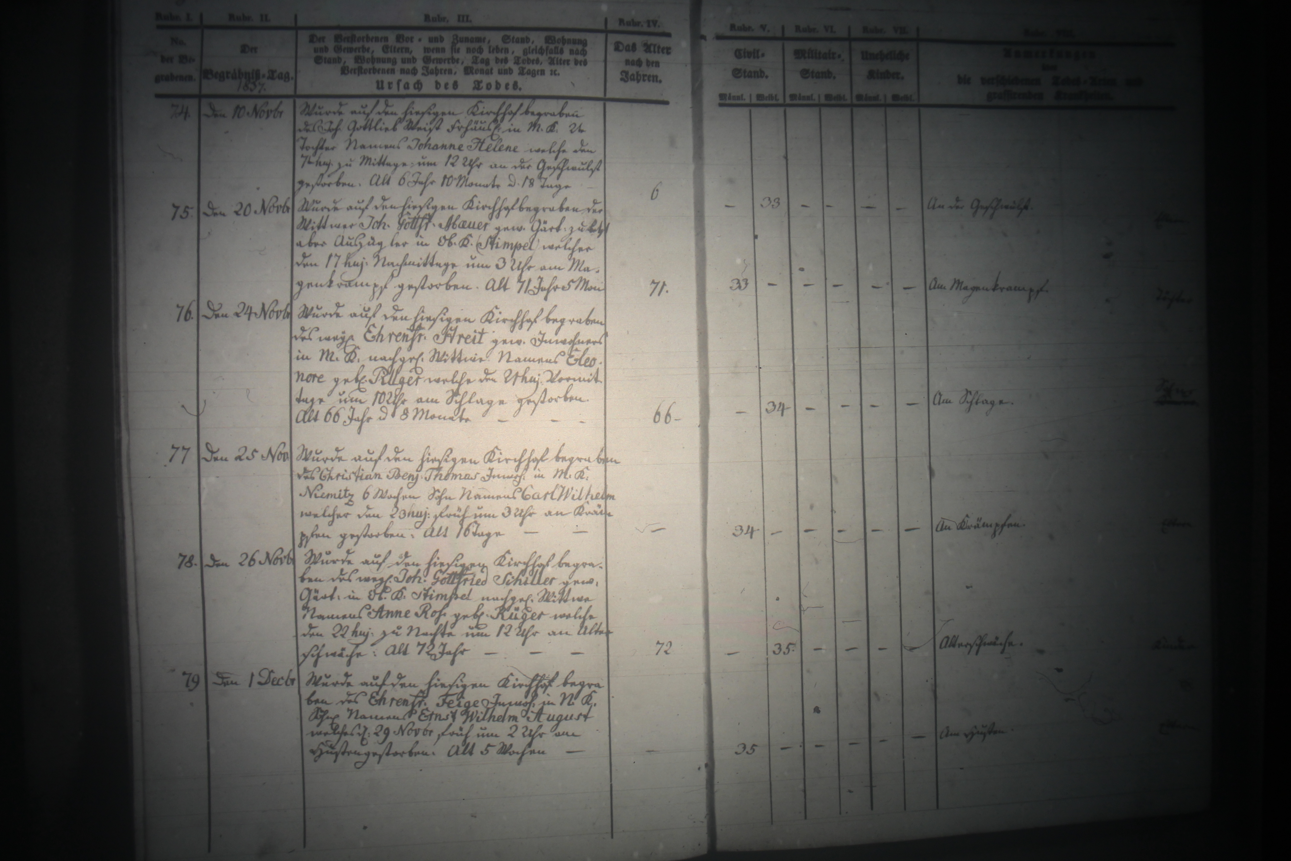 Text | Quellenscan: http://bilder.goldberg-haynau.de/Kauffung/Sterbef%C3%A4lle/1837-1841/mormonen1%20441.JPG [color=#FF0000]Quelle B344, [/color] Begräbnisse Kauffung 1837-13 Pag 13 Nr. 74 den 10. November 1837 Wurde auf den hiesigen Kirchhof begraben des Johann Gottlieb Weist, Freihäusler in Mittel Kauffung 2. Tochter namens Johanne Helene, welche den 7. des Monats zu mittags um 12:00 Uhr an der Geschwulst gestorben. Alt 6 Jahre, 10 Monate und 18 Tage. Nr. 75 den 20. November 1837 Wurde auf den hiesigen Kirchhof begraben der Wittwer Johann Gottfried Mäuer (Meuer) gewesener Gärtner, zuletzt aber Auszügler in Ober Kauffung-Stimpel, welcher den 17. des Monats nachmittags um 3:00 Uhr am Magenkrampf gestorben. Alt 71 Jahre und 5 Monate. Nr. 76 den 24. November 1837 Wurde auf den hiesigen Kirchhof begraben des weiland Ehrenfried Streit, gewesener Inwohner in Mittel Kauffung nachgelassene Witwe namens Eleonore geborene Pillger, welche den 21. des Monats vormittags um 10:00 Uhr am Schlage gestorben. Alt 66 Jahre und 8 Monate. Nr. 77 den 25. November 1837 Wurde auf den hiesigen Kirchhof begraben des Christian Benjamin Thomas, Inwohner in Mittel Kauffung-Niemitz 6 Wochen Sohn namens Carl Wilhelm, welcher den 23. des Monats früh um 3:00 Uhr an Krämpfen gestorben. Alt 16 Tage. Nr. 78 den 26. November 1837 Wurde auf den hiesigen Kirchhof begraben des weiland Johann Gottfried Schiller, gewesener Gärtner in Ober Kauffung-Stimpel nachgelassene Witwe namens Anne Rosine geborene Rüger, welche den 22. des Monats zu Nacht um 12:00 Uhr an Altersschwäche gestorben. Alt 72 Jahre. Nr. 79 den 1. Dezember 1837 Wurde auf den hiesigen Kirchhof begraben des Ehrenfried Feige, Inwohner in Nieder Kauffung Sohn namens Ernst Wilhelm August, welcher den 29. November früh um 2:00 Uhr am Husten gestorben. Alt 5 Wochen. | |