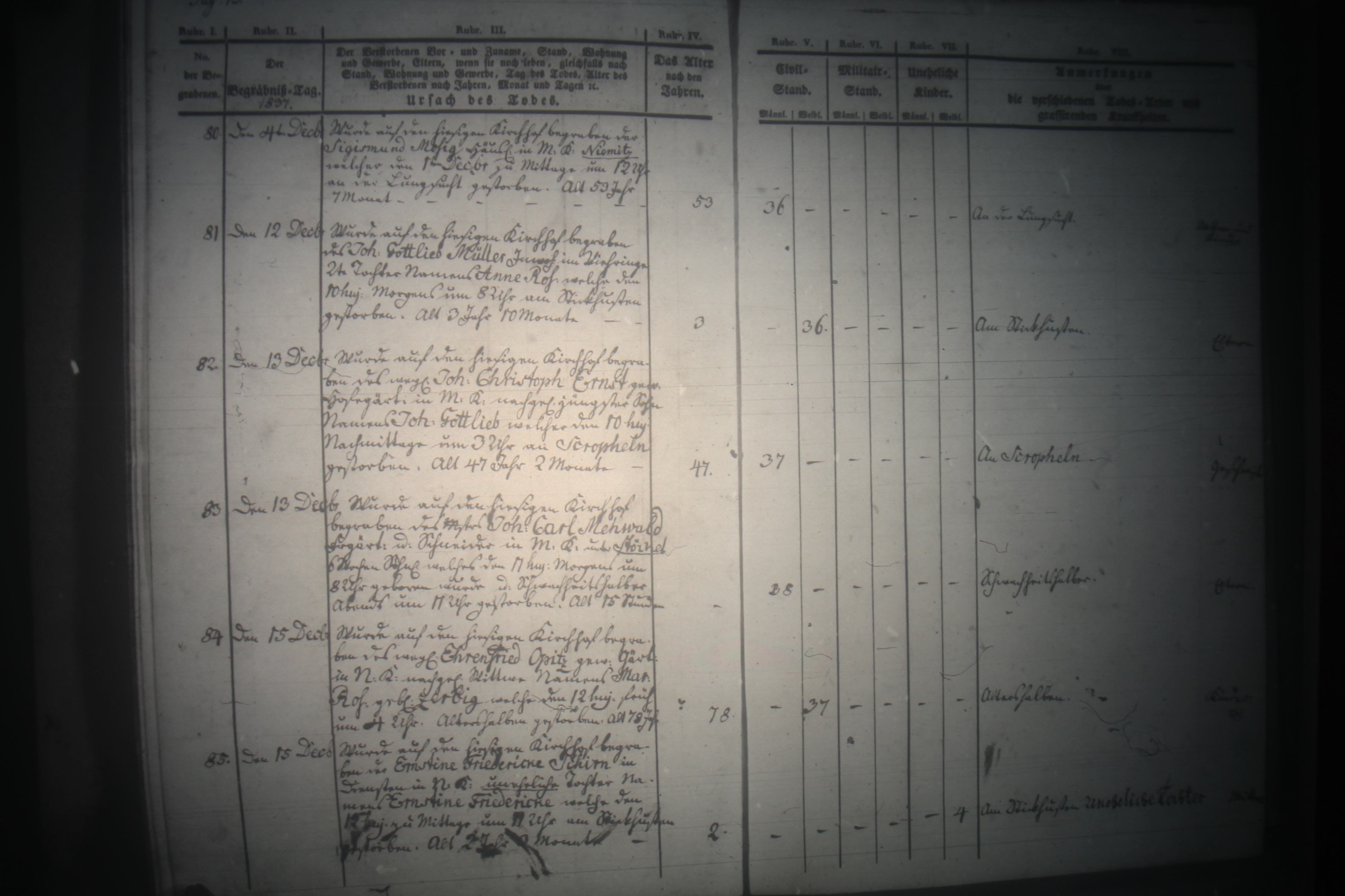 Text | Quellenscan: http://bilder.goldberg-haynau.de/Kauffung/Sterbef%C3%A4lle/1837-1841/mormonen1%20442.JPG [color=#FF0000]Quelle B345, [/color] Begräbnisse Kauffung 1837-14 Pag 14 Nr. 80 den 4. Dezember 1837 Wurde auf den hiesigen Kirchhof begraben der Sigismund Mosig, Häusler in Mittel Kauffung-Niemitz, welche den 1. Dezember zum Mittag um 12:00 Uhr an der Lungensucht gestorben. Alt 53 Jahre und 7 Monate Nr. 81 den 12. Dezember 1837 Wurde auf den hiesigen Kirchhof begraben des Johann Gottlieb Müller, Inwohner in Viehring (Mittel Kauffung) 2. Tochter namens Anne Rosine, welcher den 10. des Monats morgens um 8:00 Uhr am Stickhusten gestorben. Alt 3 Jahre und 10 Monate. Nr. 82 den 13. Dezember 1837 Wurde auf den hiesigen Kirchhof begraben des weiland Johann Christoph Ernst, gewesener Hofegärtner in Mittel Kauffung nachgelassener jüngster Sohn namens Johann Gottlieb, welcher den 10. des Monats nachmittags um 3:00 Uhr an Scropheln gestorben Alt 47 Jahre und 2 Monate. Nr. 83 den 13. Dezember 1837 Wurde auf den hiesigen Kirchhof begraben des Meister Johann Carl Mehwald, Freigärtner und Schneider in Mittel Kauffung unter Stöckel, 6 Wochen Söhnlein, welches den 11. des Monats morgens um 8:00 Uhr geborene wurde und schwachheitshalber abends um 11:00 Uhr gestorben. Alt 15 Stunden. Nr. 84 den 15. Dezember 1837 Wurde auf den hiesigen Kirchhof begraben des weiland Ehrenfried Opitz, gewesener Gärtner in Nieder Kauffung nachgelassene Witwe namens Maria Rosine geborene Zerbig, welche den 12. des Monats früh um 4:00 Uhr altershalber gestorben. Alt 78 Jahre. Nr. 85 den 15. Dezember 1837 Wurde auf dem hiesigen Kirchhof begraben der Ernstine Friedericke Tchirn ??, in Diensten in Nieder Kauffung uneheliche Tochter namens Ernstine Friedericke, welche den 12. des Monats zu Mittag um 11:00 Uhr am Stickhusten gestorben. Alt 2 Jahre und 3 Monate? | |
