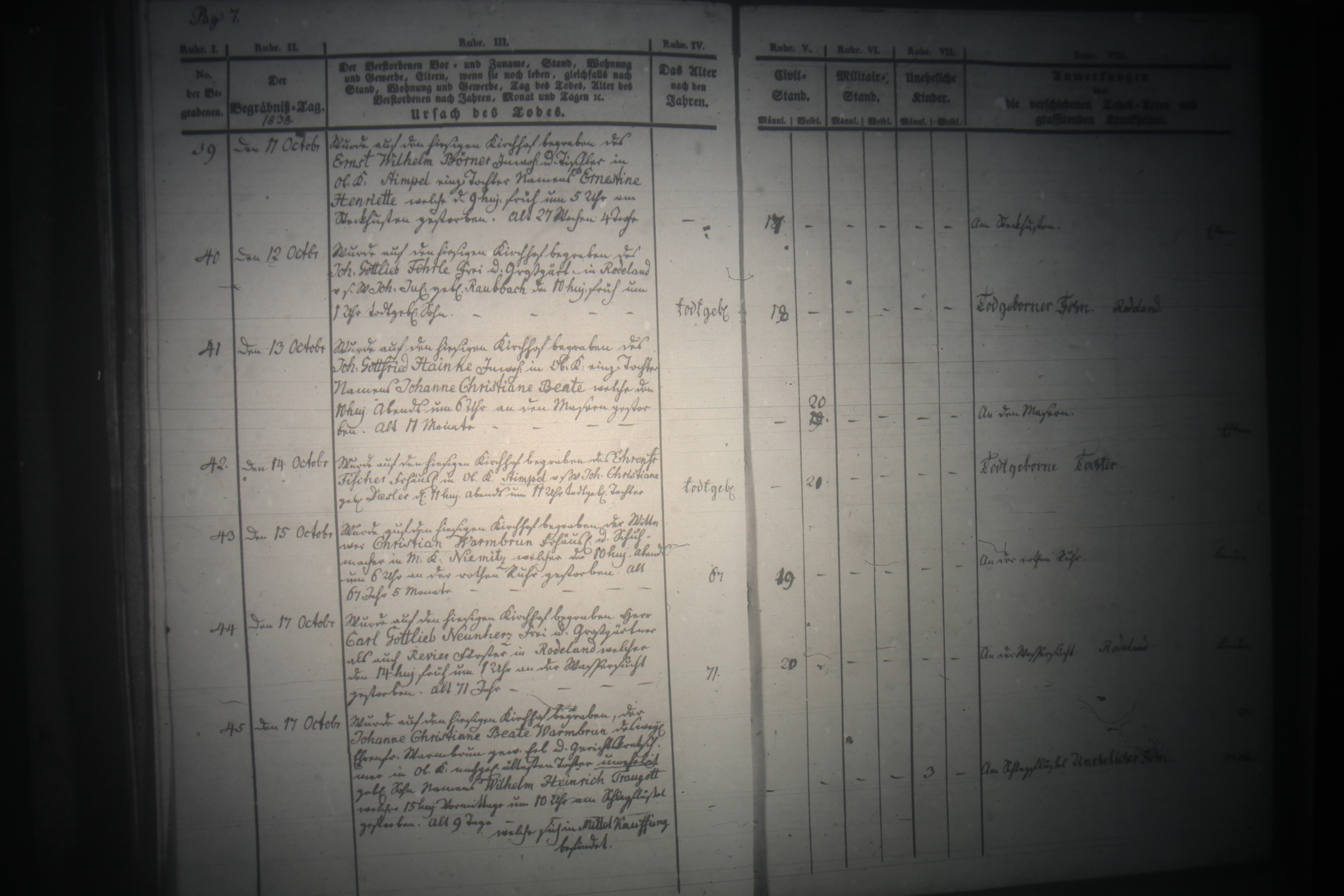 | Text | Quellenscan: http://bilder.goldberg-haynau.de/Kauffung/Sterbef%C3%A4lle/1837-1841/mormonen1%20452.JPG [color=#FF0000]Quelle B353, [/color] Begräbnisse Kauffung 1838-07 Pag 7 Nr. 39 den 11. Oktober 1838 Wurde auf den hiesigen Kirchhof begragen des Ernst Wilhelm Börner, Inwohner und Tischler in Ober Kauffung-Stimpel einzige Tochter namens Ernestine Henriette, welche den 9. des Monats früh um 5:00 Uhr am Stickhusten gestorben. Alt 27 Wochen und 4 Tage Nr. 40 den 12. Oktober 1838 Wurde auf den hiesigen Kirchhof begragen des Johann Gottlieb Fehrle, Frey-und Großgärtner in Kauffung-Rodeland, von seinem Weibe Johanne Juliane geborene Raubbach den 10. des Monats früh um 1:00 Uhr tot geborene Sohn. Nr. 41 den 13. Oktober 1838 Wurde auf den hiesigen Kirchhof begragen des Johann Gottfried Hainke, Inwohner in Ober Kauffung einzige Tochter namens Johanne Christiane Beate, welche den 10. des Monats abends um 6:00 Uhr an den Masern gestorben. Alt 11 Monate. Nr. 42 den 14. Oktober 1838 Wurde auf den hiesigen Kirchhof begragen des Ehrenfried Fischer, Freihäusler in Ober Kauffung-Stimpel von seinem Weibe Johanne Christiane geborene Däsler den 11. des Monats abends um 11:00 Uhr geborene Tochter. Nr. 43 den 15. Oktober 1838 Wurde auf den hiesigen Kirchhof begragen der Wittwer Christian Warmbrunn, Freihäusler und Schumacher in Mittel Kauffung-Niemitz, welcher den 10. des Monats abends um 6:00 Uhr an der Roten Ruhr gestorben. Alt 67 Jahre und 5 Monate. Nr. 44 den 17. Oktober 1838 Wurde auf den hiesigen Kirchhof begragen Herr Carl Gottlieb Neunherz, Frey-und Großgärtner als auch Revier Förster in Kauffung-Rodeland, welcher den 14. des Monats früh um 1:00 Uhr an der Wassersucht gestorben Alt: 71 Jahre Nr. 45 den 17. Oktober 1838 Wurde auf den hiesigen Kirchhof begragen der Johanne Christiane Beate Warmbrunn, des weiland Ehrenfried Warmbrunn, gewesener Erb-und Gerichtskretschmer in Ober Kauffung, nachgelassener älteste Tochter unehelich geborener Sohn namens Wilhelm Heinrich Traugott, welcher den 15. des Monats vormittags um 10:00 Uhr am Schlagflüssel gestorben. (Einfügung: welcher sich in Mittel Kauffung befindet) Alt 9 Tage | |
