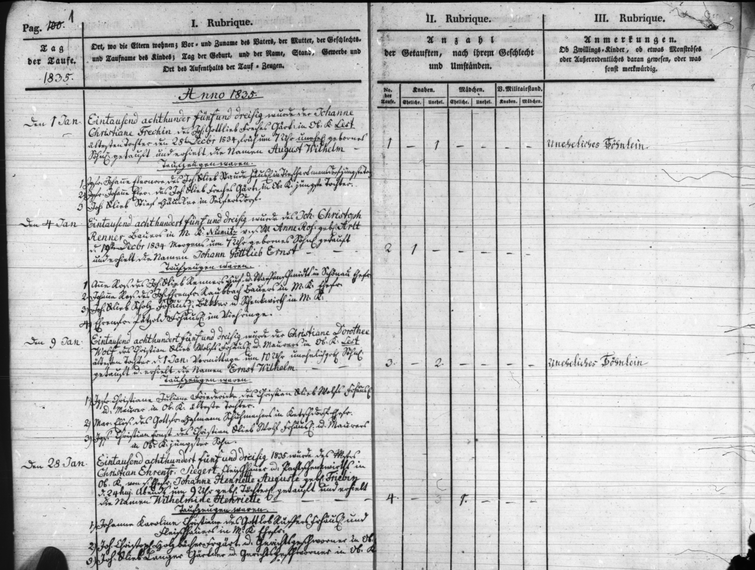 Text | Quellenscan: http://bilder.goldberg-haynau.de/Kauffung/Taufen/Taufen%201835-1836%20u%20Trauungen-Begraebnisse/t_0644.jpg [b][color=#FF4000]Quelle: S628, [/color][/b] Taufen Kauffung 1835 Pag 1 Nr 1 den 1. Januar 1835 Wurde der Johanne Christiane Freche, des Johann Gottlieb Freche, Gärtner in Ober Kauffung unter Lest älteste Tochter den 28. Dezember 1834 früh um 7:00 Uhr unehelich geborene Söhnlein getauft und erhielt die Namen August Wilhelm. Taufzeugen waren: 1. Jungfer Johanne Eleonore, des Johann Gottlieb Staude, Häusler in Tiefhartmansdorf jüngste Tochter. 2. Jungfer Johanne Eleonore, des Johann Gottlieb Freche, Gärtner in Ober Kauffung jüngste Tochter. 3. Johann Gottlieb Stief?, Häusler in Seiffersdorf. Nr 2 den 4. Januar 1835 wurde des Johann Christoph Renner, Bauer in Mittel Kauffung-Niemitz, von seinem Weibe Anne Rosine geborene Arlt den 19. Dezember 1834 morgens um 7:00 Uhr geborene Söhnlein getauft, und erhielt die Namen Johann Gottlieb Ernst. Taufen Zeugen waren: 1. Anne Rosine, des Johann Gottlieb Sommer, Vogt-und Waffenschmidt in Schönau Ehefrau. 2. Johanne Rosine, des Johann Ehrenfried Raubbach, Bauer in Mittel Kauffung Ehefrau. 3. Johann Gottlieb Scholz, Bäcker und Schenkwirth in Mittel Kauffung. 4. Ehrenfried Pätzold, Freihäusler in Viehring. (Mittel Kauffung) Nr 3 den 9. Januar 1835 wurde der Christiane Dorothea Wolf, des Christian Gottlieb Wolf, Freihäusler und Maurer in Ober Kauffung unter Lest ältesten Tochter den 1. Januar 1835 vormittags um 10:00 Uhr unehelich geborene Söhnlein getauft, und erhielt die Namen Ernst Wilhelm. Taufzeugen waren: 1. Jungfer Christiane Juliane Friedericke, des Christian Gottlieb Wolf, Freihäusler und Maurer in Ober Kauffung älteste Tochter. 2. Maria Elisabeth, des Gottfried Bruchmann, Schumacher in Ketschdorf Ehefrau. 3. Junggesell Christian Ernst, des Christian Gottlieb Wolf, Freihäusler und Maurer in Ober Kauffung jüngster Sohn. Nr. 4 den 28. Januar 1835 Wurde des Meister Christian Ehrenfried Siegert, Fleischhauer und Pacht Schenkwirth in Ober Kauffung, von seiner Ehefrau Johanne Henriette Auguste geborene Friebe den 24. des Monats abends um 9:00 Uhr geborene Töchterlein getauft, und erhielt die Namen Wilhelmin Henriette. Taufzeugen waren: 1. Johanne Caroline Christiane, des Gottlob Rüffer, Freihäusler und Fleischhauer in Mittel Kauffung Ehefrau. 2. Johann Christoph Hölzbächer (Hölzbecher) Freigärtner und Gerichtsgeschworener in Ober Kauffung. 3. Johann Gottlieb Langer, Gärtner und Gerichtsgeschworener in Ober Kauffung. | |