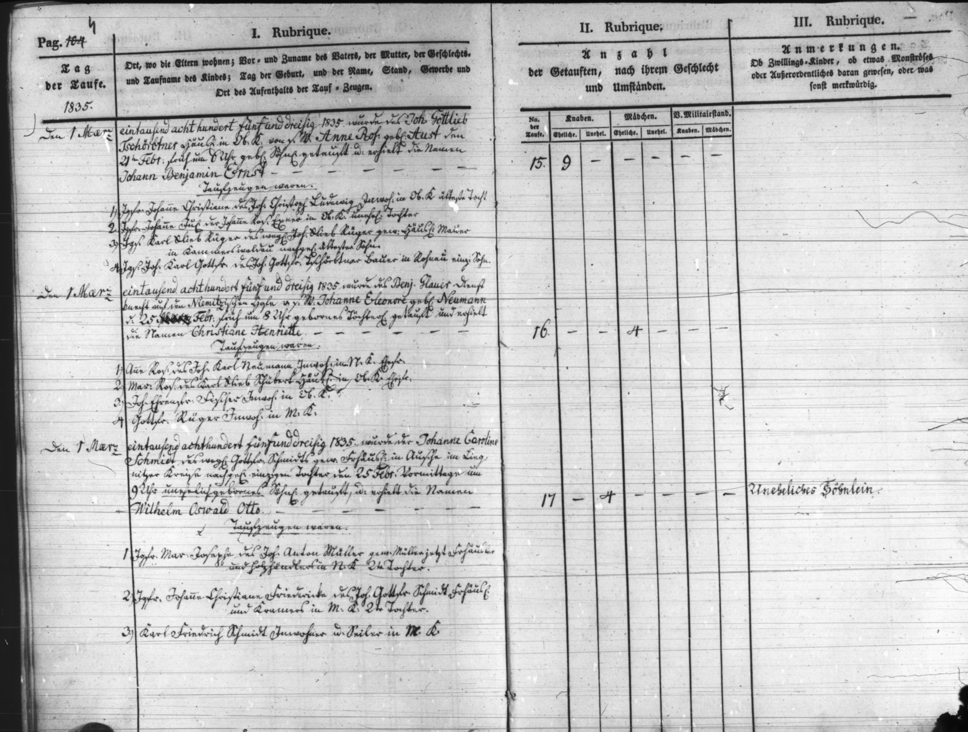 Text | Quellenscan: http://bilder.goldberg-haynau.de/Kauffung/Taufen/Taufen%201835-1836%20u%20Trauungen-Begraebnisse/t_0648.jpg Taufen Kauffung 1835 Pag 4 Nr. 15 den 1. März 1835 Wurde des Johann Gottlieb Tschörptner (Tschörbtner), Häusler in Ober Kauffung von seinem Weibe Anne Rosine geborene Aust, den 21. Februar früh um 6:00 Uhr geborene Sohn getauft, und erhielt die Namen Johann Benjamin Ernst Taufzeugen waren: 1. Jungfer Johanne Christiane, des Johann Christoph Ludwig, Inwohner in Ober Kauffung älteste Tochter. 2. Jungfer Johanne Juliane, der Johanne Rosine Exner in Ober Kauffung uneheliche Tochter. 3. Junggesell Carl Gottlieb Rüger, des weiland Johann Gottlieb Rüger, gewesener Häusler und Maurer in Kammerswaldau nachgelassene älteste Sohn. 4. Junggesell Johann Carl Gottfried, des Johann Gottfried Tschörptner,(Tschörbtner) Bauer in Rohnau einziger Sohn. Nr. 16 den 1. März 1835 Wurde des Benjamin Glauer, Knecht auf dem Niemitzischen Hofe von seinem Weibe Johanne Eleonore geborene Neumann, den 25. Februar früh um 8:00 Uhr geborenes Töchterlein getauft, und erhielt die Namen Christiane Henriette. Taufzeugen waren: 1. Anne Rosine, des Johann Carl Neumann, Inwohner in Nieder Kauffung Ehefrau. 2. Maria Rosine, des Karl Gottlieb Schubert, Häusler in Ober Kauffung Ehefrau. 3. Johann Ehrenfried Fischer, Inwohner in Ober Kauffung. 4. Gottfried Rüger, Inwohner in Mittel Kauffung. Nr. 16 den 1. März 1835 wurde der Johanne Caroline Schmidt, des weiland Gottfried Schmidt, gewesener Freihäusler in Ausche im Liegnitzer Kreise nachgelassene einzige Tochter, den 25. Februar vormittags um 9:00 Uhr unehelich geborene Söhnlein getauft, und erhielt die Namen Wilhelm Oswald Otto. Taufzeugen waren: 1. Jungfer Maria Josephe, des Johann Anton Müller, gewesener Müller jetzt Freihäusler und Holzhändler in Nieder Kauffung 2. Tochter. 2. Jungfer Johanne Christiane Friedericke, des Johann Gottfried Schmidt, Freihäusler und Kramer in Mittel Kauffung 2. Tochter. 3. Carl Friedrich Schmidt, Inwohner und Seiler in Mittel Kauffung. | |