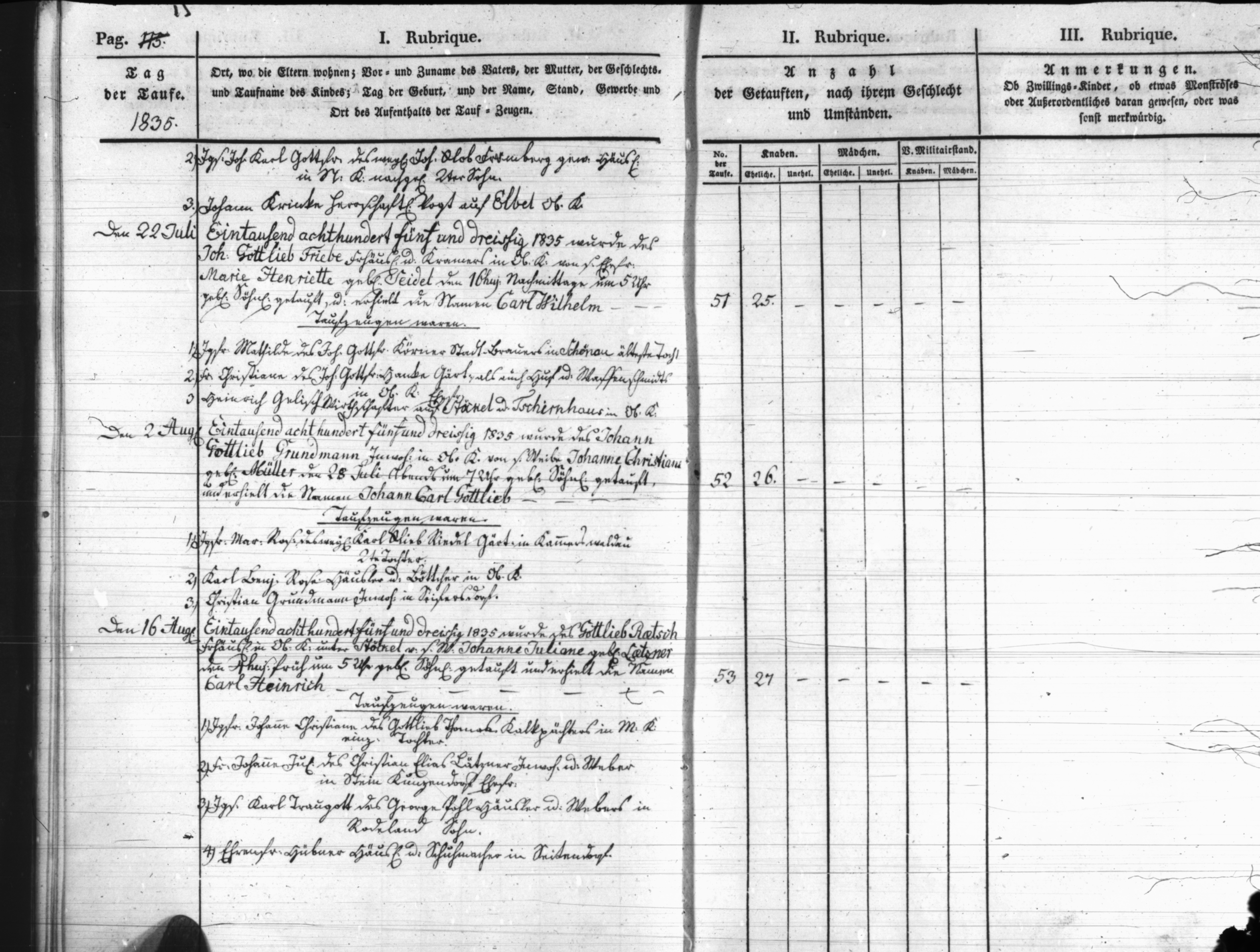 Text | Quellenscan: http://bilder.goldberg-haynau.de/Kauffung/Taufen/Taufen%201835-1836%20u%20Trauungen-Begraebnisse/t_0661.jpg [color=#FF0000]Quelle 645, [/color] Taufen Kauffung 1835 Pag 15 (Fortsetzung vom Pag 14) 2. Junggesell Johann Carl Gottfried, des weiland Johann Gottlob Frömberg, gewesener Häusler in Nieder Kauffung nachgelassener 2. Sohn. 3. Johann Krinke, herrschaftlicher Vogt auf Elbel in Ober Kauffung. Nr. 51 den 22. Juli 1835 wurde des Johann Gottlieb Friebe, Freihäusler und Kramer in Ober Kauffung, von seiner Ehefrau Marie Henriette geborene Seidel den 16. des Monats nachmittags um 5:00 Uhr geborene Söhnlein getauft, und erhielt die Namen Carl Wilhelm. Taufzeugen waren: 1. Jungfer Mathilde, des Johann Gottfried Körner, Stadt Brauer in Schönau älteste Tochter. 2. Frau Christiane, des Johann Gottfried Hanke (Hainke)?, Gärtner als auch Huf-und Waffenschmidt in Ober Kauffung. 3.Heinrich Gelisch, Wirtschafter auf Stöckel und Tschirnhaus in Ober Kauffung. Nr. 52 den 2. August 1835 Wurde des Johann Gottlieb Grundmann, Inwohner in Ober Kauffung, von seinem Weibe Johanne Christiane geborene Müller den 28. Juli abends um 7:00 Uhr geborene Söhnlein getauft, und erhielt die Namen Johann Carl Gottlieb. Aufzeigen waren: 1. Jungfer Maria Rosine, des weiland Karl Gottlieb Riedel, Gärtner in Kammerswaldau 2. Tochter. 2. Carl Benjamin Rose, Häusler und Böttcher in Ober Kauffung. 3. Christian Grundmann, Inwohner in Seiffersdorf. Nr. 53 den 16. August 1835 Wurde des Gottlieb Rätsch, (Retsch) Freihäusler in Ober Kauffung unter Stöckel, von seinem Weibe Johanne Juliane geborene Letzner, (Lätzner) den 4. des Monats früh um 5:00 Uhr geborene Söhnlein getauft, und erhielt die Namen Carl Heinrich. Taufzeugen waren: 1. Jungfer Johanne Christiane, des Gottlieb Thoms, Kalkpächter in Mittel Kauffung einzige Tochter. 2. Frau Johanne Juliane, des Christian Elias Lätzner, (Letzner?) Inwohner und Weber in Stein Kunzendorf Ehefrau. 3. Junggesell Karl Traugott, des George Pohl, Häusler und Weber in Kauffung-Rodeland Sohn. 4. Ehrenfried Hübner, Häusler und Schumacher in Seitendorf. | |