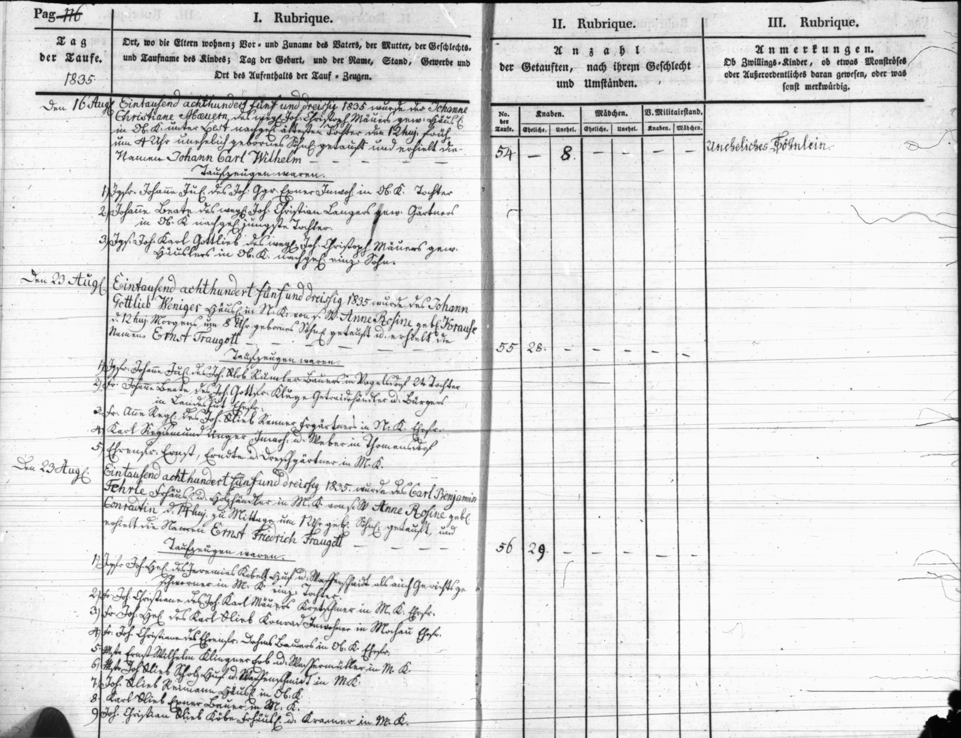 Text | Quellenscan: http://bilder.goldberg-haynau.de/Kauffung/Taufen/Taufen%201835-1836%20u%20Trauungen-Begraebnisse/t_0662.jpg [color=#FF0000]Quelle 646, [/color] Taufen Kauffung 1835 Pag 16 Nr. 54 den 16. August 1835 Wurde der Johanne Christiane Mäuer (Meuer), des weiland Johann Christoph Mäuer, gewesener Häusler in Ober Kauffung unter Lest nachgelassene älteste Tochter, den 12. des Monats früh um 4:00 Uhr unehelich geborenes Söhnlein getauft, und erhielt die Namen Johann Carl Wilhelm. Taufzeugen waren: 1. Jungfer Johanne Juliane, des Johann George Exner, Inwohner in Ober Kauffung Tochter. 2. Johanne Beate, des weiland Johann Christian Langer, gewesener Gärtner in Ober Kauffung nachgelassene jüngste Tochter. 3. Junggesell Johann Carl Gottlieb, des weiland Johann Christoph Mäuer, gewesener Häusler in Ober Kauffung nachgelassener einziger Sohn. Nr. 55 den 23. August 1835 Wurde des Johann Gottlieb Weniger, Häusler in Nieder Kauffung, von seinem Weibe Anne Rosine geborene Krause den 12. des Monats morgens um 8:00 Uhr geborene Söhnlein getauft, und erhielt den Namen Ernst Traugott. Taufzeugen waren: 1. Jungfer Johanne Juliane, des Johann Gottlob Rumler (Rummler?), Bauer in Vogelsdorf 2. Tochter 2. Frau Johanne Beate, des Johann Gottfried Kluge, Getreidehändler und Bürger in Landeshut Ehefrau. 3. Frau Anne Regine, des Johann Gottlieb Renner, Freigärtner in Nieder Kauffung Ehefrau. 4. Karl Sigismund Unger, Inwohner und Weber in Thomansdorf 5. Ehrenfried Ernst, Erndt-und Dreschgärtner in Mittel Kauffung. Nr. 56 den 23. August 1835 Wurde des Carl Benjamin Fehrle, Freihäusler und Holzhändler in Mittel Kauffung, von seinem Weibe Anne Rosine geborene Konrad (Conradt) den 14. des Monats zum Mittag um 1:00 Uhr geborene Söhnlein getauft, und erhielt die Namen Ernst Friedrich Traugott. Taufzeugen waren: 1. Jungfer Johanne Helene, des Jeremias Kobelt, Huf-und Waffenschmidt als auch Gerichtsgeschworener in Mittel Kauffung einzige Tochter. 2. Frau Johanne Christiane, des Johann Carl Mäuer, Kretschmer in Mittel Kauffung Ehefrau. 3. Frau Johanne Helene, des Karl Gottlieb Konrad, Inwohner in Mochau Ehefrau. 4. Frau Johanne Christiane, des Ehrenfried Dohm (Thoms?), Bauer in Ober Kauffung Ehefrau. 5. Meister Ernst Wilhelm Klinger, Erb-und Wassermüller in Mittel Kauffung. 6. Meister Johann Gottlieb Scholz, Huf-und Waffenschmidt in Mittel Kauffung. 7. Johann Gottlieb Reimann, Häusler in Ober Kauffung. 8. Carl Gottlieb Exner, Bauer in Mittel Kauffung. 9. Johann Christian Gottlieb Köbe, Freihäusler und Kramer in Mittel Kauffung. | |
