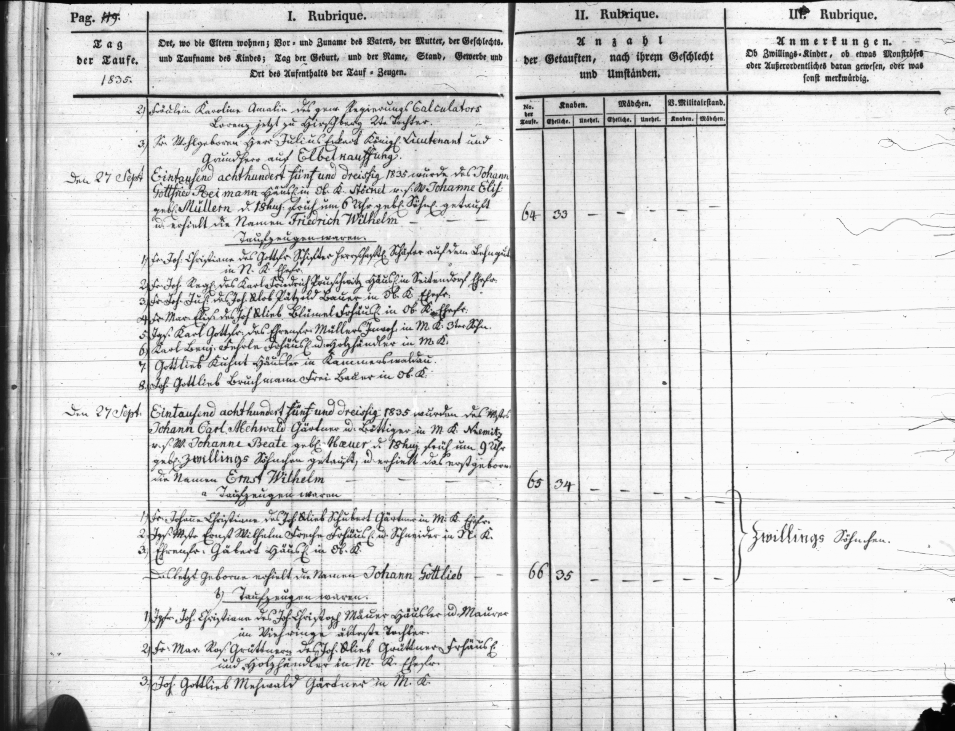 Text | Quellenscan: http://bilder.goldberg-haynau.de/Kauffung/Taufen/Taufen%201835-1836%20u%20Trauungen-Begraebnisse/t_0665.jpg [color=#FF0000]Quelle 649, [/color] Taufen Kauffung 1835 Pag 19 Fortsetzung von Pag 18 2. Fräulein Caroline Amalie, des gewesenen Regierungs Calculators Lorenz, jetzt zu Hirschberg, 2. Tochter. 3.Sr. Wohlgeboren Herr Julius Eckart, königlicher Leutnant und Grundherr auf Elbel-Kauffung. Nr. 64 am 20. September 1835 Wurde des Johann Gottfried Reimann, Häusler in Ober Kauffung-Stöckel, von seinem Weibe Johanne Elisabeth geborene Müller den 18. des Monats früh um 6:00 Uhr geborene Söhnlein getauft, und erhielt die Namen Friedrich Wilhelm. Taufzeugen waren: 1. Frau Johanne Christiane, des Gottfried Schifter, herrschaftlicher Schäfer auf dem Lehngute in Nieder Kauffung Ehefrau. 2. Frau Johanne Regine, des Karl Friedrich Pruschwitz, Häusler in Seitendorf Ehefrau. 3. Frau Johanne Juliane, des Johann Gottlob Pätzold, Bauer in Ober Kauffung Ehefrau. 4. Frau Maria Elisabeth, des Johann Gottlieb Blümel, Freihäusler in Ober Kauffung Ehefrau. 5. Junggesell Carl Gottfried, des Ehrenfried Müller, Inwohner in Mittel Kauffung 3. Sohn. 6. Karl Benjamin Fehrle, Freihäusler und Holzhändler in Mittel Kauffung. 7. Gottlieb Kuhnt, Häusler in Kammerswaldau. 8. Johann Gottlieb Bruchmann, Freibauer in Ober Kauffung. Nr. 65 den 27. September 1835 Wurden des Meisters Johann Carl Mehwald, Gärtner und Böttcher in Mittel Kauffung-Niemitz, von seinem Weibe Johanne Beate geborene Hauer??, den 18. des Monats früh um 9:00 Uhr geborene Zwillingssöhnchen getauft und erhielt das Erstgeborenen die Namen Ernst Wilhelm Taufzeugen waren: 1. Frau Johanne Christiane, des Johann Gottlieb Schubert, Gärtner in Mittel Kauffung Ehefrau. 2. Junggesell Meister Ernst Wilhelm Freche, Freihäusler und Schneider in Nieder Kauffung. 3. Ehrenfried Gaebert (Gebert),Häusler in Ober Kauffung Nr. 66 das letzt geborenen erhielt die Namen Johann Gottlieb Taufzeugen waren: 1. Jungfer Johanne Christiane, des Johann Christoph Mäuer (Meuer), Häusler und Maurer in Viehring (Mittel Kauffung) älteste Tochter 2. Frau Maria Rosine Grüttner, des Johann Gottlieb Grüttner, Freihäusler und Holzhändler in Mittel Kauffung Ehefrau. 3. Johann Gottlieb Mehwald, Gärtner in Mittel Kauffung. | |