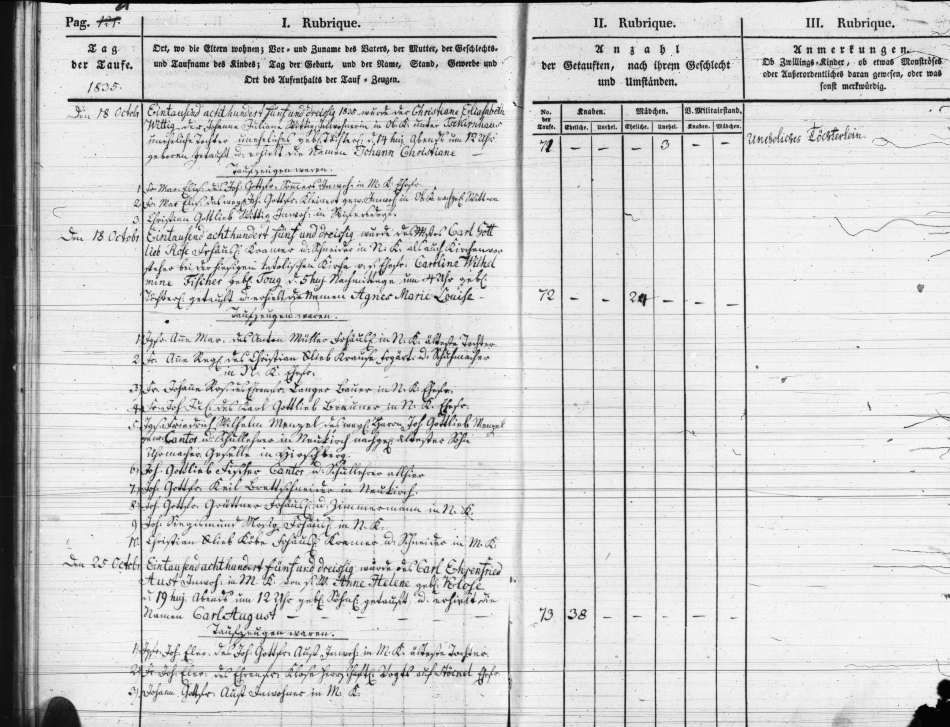 Text | Quellenscan: http://bilder.goldberg-haynau.de/Kauffung/Taufen/Taufen%201835-1836%20u%20Trauungen-Begraebnisse/t_0668.jpg [color=#FF0000]Quelle 651. [/color] Taufen Kauffung 1835 Pag 21 Nr. 71 den 18. Oktober 1835 Wurde der Christiane Elisabeth Wittich, der Johanne Juliane Wittig, Inwohner in Ober Kauffung unter Tschirnhaus eheliche Tochter, uneheliches geborene Töchterlein den 14. des Monats abends um 12:00 Uhr geborene, getauft und erhielt die Namen Johanne Christiane. Taufzeugen waren 1. Frau Maria Elisabeth, des Johann Gottfried Sommer, Inwohner in Mittel Kauffung Ehefrau. 2. Frau Maria Elisabeth, des weiland Johann Gottfried Kleinert, gewesener Inwohner in Ober Kauffung nachgelassene Witwe. 3. Christian Gottlieb Wittig, Inwohner in Seiffersdorf. Nr. 72 den 18. Oktober 1830 Wurde des Meisters Carl Gottlieb Rose, Freihäusler, Kramer und Schneider in Nieder Kauffung, als auch Kirchenvorsteher der hiesigen katholischen Kirche, von seiner Ehefrau Caroline Wilhelmine Fischer geborene Toug, den 5. des Monats nachmittags um 4:00 Uhr geborene Töchterlein getauft, und erhielt die Namen Agnes Marie Louise. Taufzeugen waren: 1. Jungfer Anne Marie, des Anton Müller, Freihäusler in Nieder Kauffung älteste Tochter. 2. Frau Anne Regine, des Christian Gottlieb Krause, Freigärtner und Schumacher in Nieder Kauffung Ehefrau. 3. Frau Johanne Rosine, des Ehrenfried Langer, Bauer in Nieder Kauffung Ehefrau. 4. Frau Johanne Juliane, des Karl Gottlieb Brauner in Nieder Kauffung Ehefrau. 5. Junggesell Friedrich Wilhelm Menzel, des weiland Herrn Johann Gottlieb Menzel, gewesener Kantor und Schullehrer in Neukirch nachgelassener ältester Sohn, Uhrmachergeselle in Hirschberg. 6. Johann Gottlieb Fischer, Kantor und Schullehrer allhier. 7. Johann Gottfried Keil, Brett Schneider in Neukirch. 8. Johann Gottfried Grüttner, Freihäusler und Zimmermann in Nieder Kauffung. 9. Johann Sigismund Mosig, Freihäusler in Nieder Kauffung. 10. Christian Gottlieb Köbe, Freihäusler, Kramer und Schneider in Mittel Kauffung. Nr. 73 den 25. Oktober 1835 Wurde des Carl Ehrenfried Aust, Inwohner in Mittel Kauffung, von seinem Weibe Anne Helene geborene Klose den 19. des Monats abends um 12:00 Uhr geborene Söhnlein getauft, und erhielt die Namen Carl August. Taufzeugen waren: 1. Jungfer Johanne Eleonore, des Johann Gottfried Aust, Inwohner in Mittel Kauffung älteste Tochter. 2. Frau Johanne Eleonore, Ehrenfried Klose, herrschaftlicher Vogt auf Stöckel Ehefrau. 3. Johann Gottfried Aust, Inwohner in Mittel Kauffung. | |