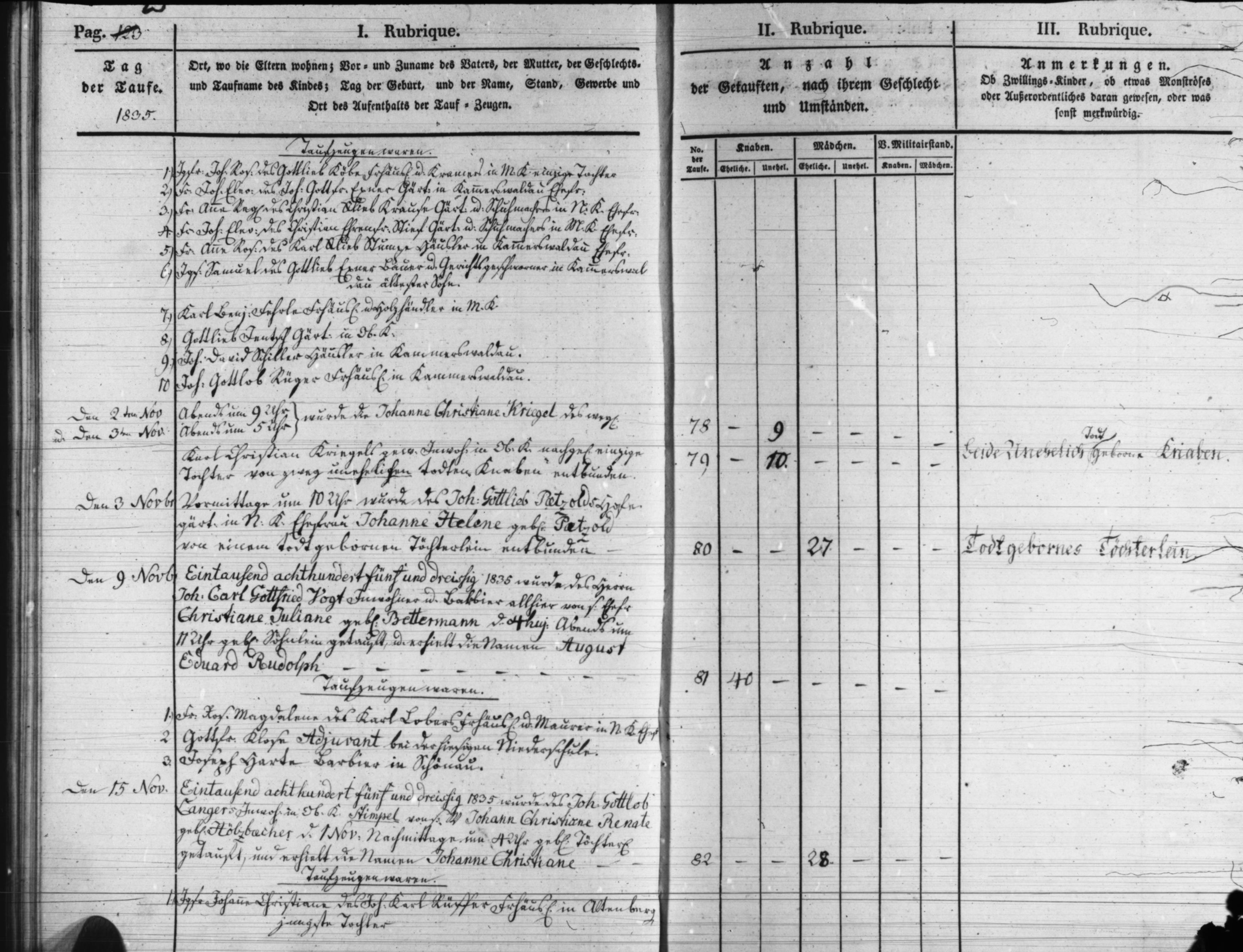 Text | Quellenscan: http://bilder.goldberg-haynau.de/Kauffung/Taufen/Taufen%201835-1836%20u%20Trauungen-Begraebnisse/t_0670.jpg Taufen Kauffung 1835 [color=#FF0000]Quelle S653, [/color] Pag 23 Fortsetzung von Pag 22 Taufzeugen waren: 1. Jungfer Johanne Rosine, des Gottlieb Köbe, Freihäusler und Kramer in Mittel Kauffung einzige Tochter. 2. Frau Johanne Eleonore, des Johann Gottfried Exner, Gärtner in Kammerswaldau Ehefrau. 3. Frau Anne Regine, des Christian Gottlieb Krause, Gärtner und Schumacher in Nieder Kauffung Ehefrau. 4. Frau Johanne Eleonore, des Christian Ehrenfried Stief, Gärtner und Schumacher in Mittel Kauffung Ehefrau. 5. Frau Anne Rosine, des Carl Gottlieb Stumpe, Häusler in Kammerswaldau Ehefrau. 6. Junggesell Samuel, des Gottlieb Exner, Bauer und Gerichtsgeschworener in Kammerswaldau ältester Sohn. 7. Carl Benjamin Fehrle, Freihäusler und Holzhändler in Mittel Kauffung. 8. Gottlieb Jentsch, Gärtner in Ober Kauffung. 9. Johann David Schiller, Häusler in Kammerswaldau 10. Johann Gottlob Rüger, Freihäusler in Kammerswaldau. Nr. 78 den 2. November 1835 abends um 9:00 Uhr Nr. 79 den 3. November abends um 5:00 Uhr wurde der Johanne Christiane Kriegel, des weiland Karl Christian Kriegel, gewesener Inwohner in Ober Kauffung nachgelassene einzige Tochter von 2 unehelichen tot geborenen Knaben entbunden. Nr. 80 den 3. November 1830 Vormittags um 10:00 Uhr wurde des Johann Gottlieb Pätzold, Hofegärtner in Nieder Kauffung Ehefrau Johanne Helene geborene Pätzold, von einem tot geborene Töchterlein entbunden. Nr. 81 den 9. November 1835 Wurde des Herrn Johann Carl Gottfried Vogt, Inwohner und Papier allhier, von seiner Ehefrau Christiane Juliane geborene Bettermann den 4. des Monats abends um 11:00 Uhr geborene Söhnlein getauft, und erhielt die Namen August Eduard Rudolph. Taufzeugen waren: 1. Frau Rosine Magdalene, des Karl Lober, Freihäusler und Maurer in Nieder Kauffung Ehefrau. 2. Gottfried Klose, Adjuvant bei der hiesigen Niederschule. 3. Josef Harte, Barbier in Schönau. Nr. 82 den 15. November 1835 Wurde des Johann Gottlob Langer, Inwohner in Ober Kauffung-Stimpel, von seinem Weibe Johanne Christiane Renate geborene Hölzbächer (Hölzbecher, Holzbecher), den 1. November nachmittags um 4:00 Uhr geborene Töchterlein getauft, und erhielt die Namen Johanne Christiane. Taufzeugen waren: 1. Jungfer Johanne Christiane, des Johann Carl Rüffer, Freihäusler in Altenberg jüngste Tochter. (Fortsetzung nächste Seite) | |