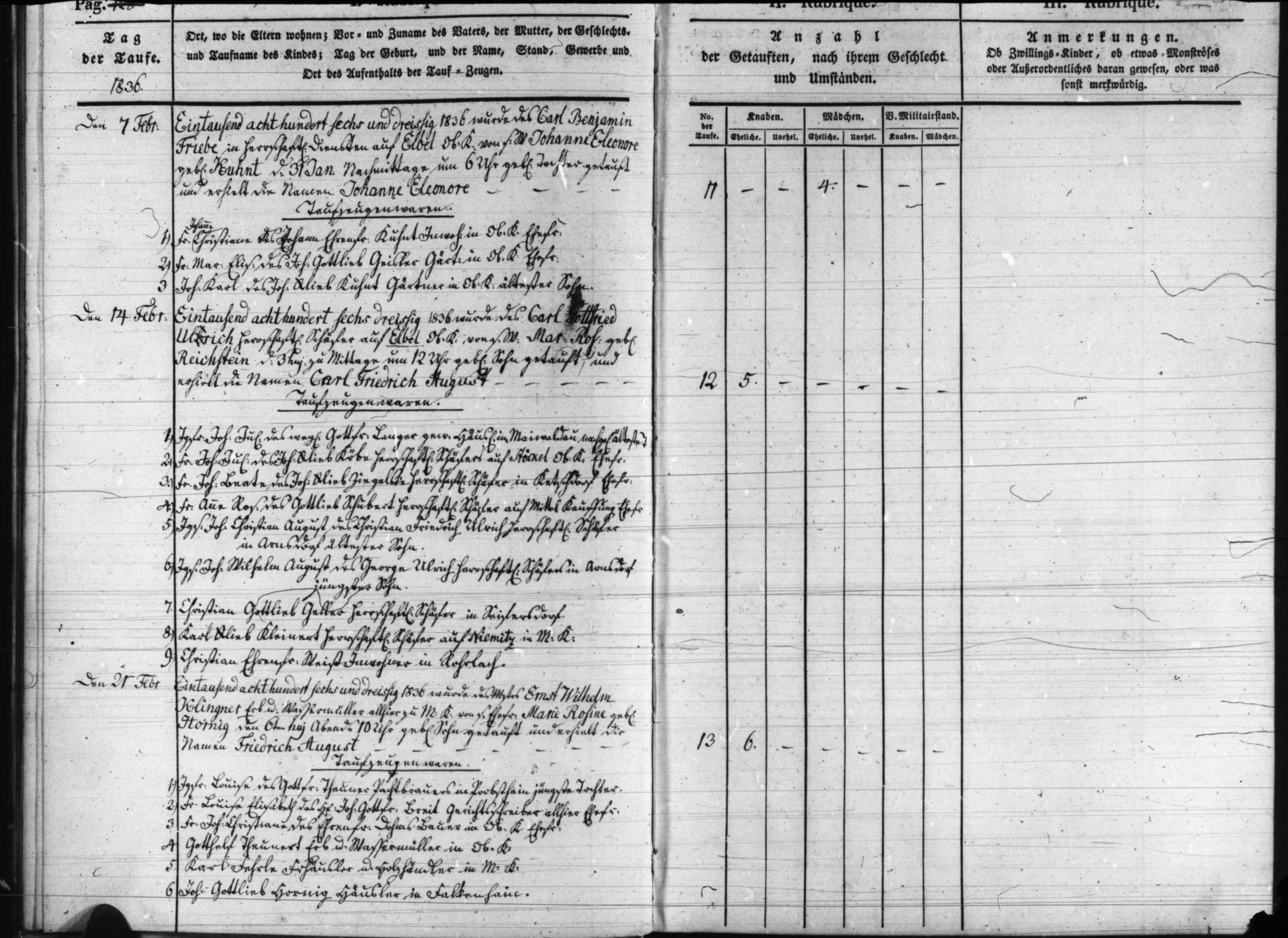 Text | Quellenscan: http://bilder.goldberg-haynau.de/Kauffung/Taufen/Taufen%201835-1836%20u%20Trauungen-Begraebnisse/t_0701.jpg Taufen Kauffung 1836 [color=#FF0000]Quelle S659, [/color] Pag 26 Nr. 11 den 7. Februar 1836 Wurde des Carl Benjamin Friebe, in herrschaftlichen Diensten auf Elbel in Ober Kauffung, von seinem Weibe Johanne Eleonore geborene Kuhnt den 31. Januar nachmittags um 6:00 Uhr geborene Tochter getauft, und erhielt die Namen Johanne Eleonore. Taufzeugen waren: 1. Frau Johanne Christiane, Johann Ehrenfried Kuhnt, Inwohner in Ober Kauffung Ehefrau. 2. Frau Maria Elisabeth, des Johann Gottlieb Geisler, Gärtner in Ober Kauffung Ehefrau. 3. Johann Carl, des Johann Gottlieb Kuhnt, Gärtner in Ober Kauffung ältester Sohn. Nr. 12 den 14. Februar 1836 Wurde des Carl Gottfried Ulbrich, (Ulrich)( es sieht so aus als sei hier das "b" in Ulbrich von Hand durchgestrichen worden, sodass der Name Ulrich heißen muss) , herrschaftlicher Schäfer auf Ober Kauffung-Elbel, von seinem Weibe Maria Rosine geborene Reichstein den 3. des Monats zu Mittage um 12:00 Uhr geborene Sohn getauft, und erhielt die Namen Carl Friedrich August. Taufzeugen waren: 1. Jungfer Johanne Juliane, des weiland Gottfried Langer, gewesener Häusler in Maiwaldau nachgelassene älteste Tochter. 2. Frau Johanne Juliane, des Johann Gottlieb Köbe, herrschaftlicher Schäfer auf Stöckel Ober Kauffung Ehefrau. 3. Frau Johanne Beate, des Johann Gottlieb Ziegelke, herrschaftlicher Schäfer in Ketschdorf Ehefrau. 4. Frau Anne Rosine, des Gottlieb Schubert, herrschaftlicher Schäfer auf Mittel Kauffung Ehefrau. 5. Junggesell Johann Christian August, des Christian Friedrich Ulrich, herrschaftlicher Schäfer in arnsdorfältester Sohn. 6. Junggesell Johann Wilhelm August, des George Ulrich, herrschaftlicher Schäfer in Arnsdorf jüngster Sohn. 7. Christian Gottlieb Geller, herrschaftlicher Schäfer in Seiffersdorf. 8. Carl Gottlieb Kleinert, herrschaftlicher Schäfer auf Niemitz in Mittel Kauffung. 9. Christian Ehrenfried Weist, Inwohner in Rohrlach. Nr. 13 den 21. Februar 1836 Wurde des Meisters Ernst Wilhelm Klingner, Erb-und Wassermüller allhier zu Mittel Kauffung, von seiner Ehefrau Marie Rosine geborene Hornig, den 6. des Monats abends um 10:00 Uhr geborene Sohn getauft, und erhielt die Namen Friedrich August. Taufzeugen waren: 1. Jungfer Luise, des Gottfried Theuner, (Theunert? ) Pacht Brauer in Probsthain jüngste Tochter. 2. Frau Luise Elisabeth, des Herrn Johann Gottfried breit, Gerichtsschreiber allhier Ehefrau. 3. Frau Johanne Christiane, des Ehrenfried Dohms (Thoms?), Bauer in Ober Kauffung Ehefrau. 4. Gotthelf Theunert, Erb-und Wassermüller in Ober Kauffung. 5. Carl Fehrle, Freihäusler und Holzhändler in Mittel Kauffung. 6. Johann Gottlieb Hornig, Häusler in Falkenhain. | |