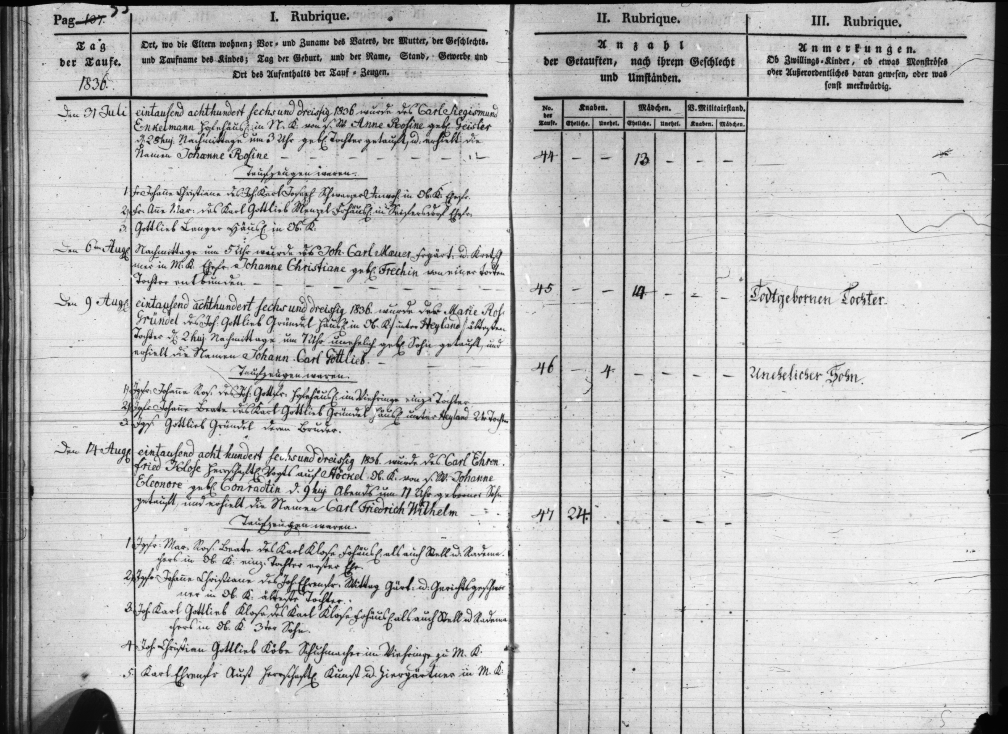 Text | Quellenscan: http://bilder.goldberg-haynau.de/Kauffung/Taufen/Taufen%201835-1836%20u%20Trauungen-Begraebnisse/t_0710.jpg [color=#FF0000]Quelle 668, [/color] Taufen Kauffung 1836-13 Pag 35 Nr. 44 den 31. Juli 1836 Wurde des Carl Sigismund Enkelmann, Hofehäusler in Nieder Kauffung, von seinem Weibe Anne Rosine geborene Geisler den 28. des Monats nachmittags um 3:00 Uhr geborene Tochter getauft, und erhielt die Namen Johanne Rosine. Taufzeugen waren: 1. Frau Johanne Christiane, des Johann Karl Joseph Schwarzer, Inwohner in Ober Kauffung Ehefrau Frau Anne Maria, des Karl Gottlieb Menzel, Freihäusler in Seiffersdorf Ehefrau. 3. Gottlieb Langer, Häusler in Ober Kauffung. Nr. 45 den 6. August 1836 Nachmittags um 5:00 Uhr wurde des Johann Carl Mäuer (Meuer), Freigärtner und Kretschmer in Mittel Kauffung Ehefrau Johanne Christiane geborene Freche von einer 2. Tochter entbunden. Nr. 46 den 9. August 1836 Wurde der Maria Rosine Gründel, des Johann Gottlieb Gründel, Häusler in Ober Kauffung unter Heiland älteste Tochter den 2. des Monats nachmittags um 7:00 Uhr unehelich geborene Sohn getauft, und erhielt die Namen Johann Carl Gottlieb. Taufzeugen waren: 1. Jungfer Johanne Rosine, des Johann Gottfried, Hofehäusler in Viehring (Mittel Kauffung) einzige Tochter 2. Jungfer Johanne Beate, des Karl Gottlieb Gründel, Häusler unter Heiland 2. Tochter. 3. Junggesell Gottlieb Gründel, dessen Bruder. Nr. 47 den 14. August 1836 wurde des Carl Ehrenfried Klose, herrschaftlicher Vogt auf Stöckel-Ober Kauffung, von seinem Weibe Johanne Eleonore geborene Conradt/ Konrad den 9. des Monats abends um 11:00 Uhr geborene Sung getauft, und erhielt die Namen Carl Friedrich Wilhelm. Taufzeugen waren: 1. Jungfer Maria Rosine Beate, des Karl Klose, Freihäusler als auch Gestell-und Rademacher in Ober Kauffung einzige Tochter 1. Ehe. 2. Jungfer Johanne Christiane, des Johann Ehrenfried Mittag, (Wittig?), Gärtner und Gerichtsgeschworener in Ober Kauffung älteste Tochter. 3. Johann Carl Gottlieb Klose, des Karl Klose, Freihäusler als auch Gestell-und Rademacher in Ober Kauffung 3. Sohn. 4. Johann Christian Gottlieb Köbe, Schumacher in Viehring zu Mittel Kauffung gehörig. 5. Carl Ehrenfried Aust, herrschaftlicher Kunst-und Ziergärtner in Mittel Kauffung. | |