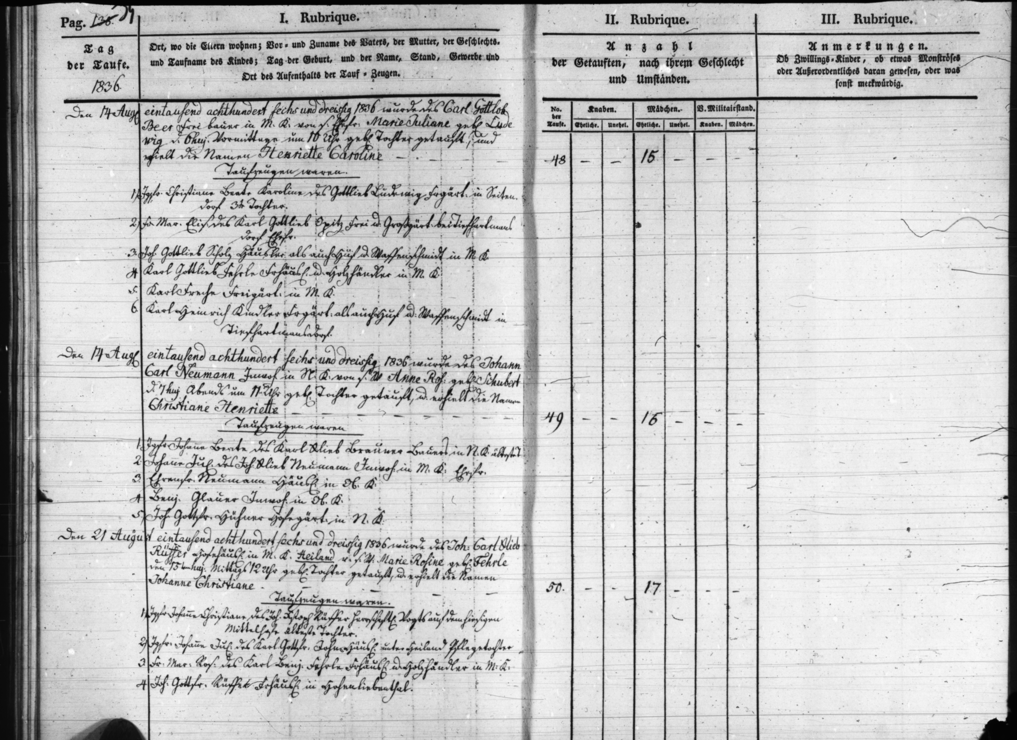 Text | Quellenscan: http://bilder.goldberg-haynau.de/Kauffung/Taufen/Taufen%201835-1836%20u%20Trauungen-Begraebnisse/t_0711.jpg [color=#FF0000]Quelle S669, [/color] Taufen Kauffung 1836-14 Pag 36 Nr. 48 den 14. August 1836 Wurde des Carl Gottlob Beer, Freibauer in Mittel Kauffung, von seiner Ehefrau Marie Juliane geborene Ludewig VI des Monats vormittags um 10:00 Uhr geborene Tochter getauft, und erhielt die Namen Henriette Caroline. Taufzeugen waren: 1. Jungfer Christiane Beate Karoline, des Gottlieb Ludewig, Freigärtner in Seitendorf 3. Tochter. 2. Frau Maria Elisabeth, des Karl Gottlieb Opitz, Frey-und Großgärtner bei Tiefhartmansdorf Ehefrau. 3. Johann Gottlieb Scholz, Häusler als auch Huf-und Waffenschmidt in Mittel Kauffung. 4. Carl Gottlieb Fehrle, Freihäusler und Holzhändler in Mittel Kauffung. 5. Carl Freche, Freigärtner in Mittel Kauffung. 6. Karl Heinrich Kindler, Freigärtner als auch Huf-und Waffenschmidt in Tiefhartmansdorf. Nr. 49 den 14. August 1836 Wurde des Johann Carl Neumann, Inwohner in Nieder Kauffung, von seinem Weibe Anne Rosine geborene Schubert den 7. des Monats abends um 11:00 Uhr geborene Tochter getauft, und erhielt die Namen Christiane Henriette. Taufzeugen waren: 1. Jungfer Johanne Beate, des Karl Gottlieb Brauner, Bauer in Nieder Kauffung älteste Tochter. 2. Johanne Juliane, des Johann Gottlieb Neumann, Inwohner in Mittel Kauffung Ehefrau. 3. Ehrenfried Neumann, Häusler in Ober Kauffung. 4. Benjamin Glauer, Inwohner in Ober Kauffung. 5. Johann Gottfried Hüner,(Hühner) Hofegärtner in Nieder Kauffung. Nr. 50 den 21. August 1836 Wurde des Johann Carl Gottlieb Rüffer, Hofehäusler in Mittel Kauffung-Heiland, von seinem Weibe Marie Rosine geborene Fehrle den 15. des Monats mittags um 12:00 Uhr geborene Tochter getauft, und erhielt die Namen Johanne Christiane. Taufzeugen waren: 1. Jungfer Johanne Christiane, des Johann Christoph Rüffer, herrschaftlicher Vogt auf dem hiesigen Mittelhofe älteste Tochter. 2. Jungfer Johanne Juliane, des Carl Gottfried John, Häusler unter Heiland Pflegetochter. 3. Frau Maria Rosine, des Carl Benjamin Fehrle, Freihäusler und Holzhändler in Mittel Kauffung. 4. Johann Gottfried Rüffer, Freihäusler in Hohenliebenthal. | |