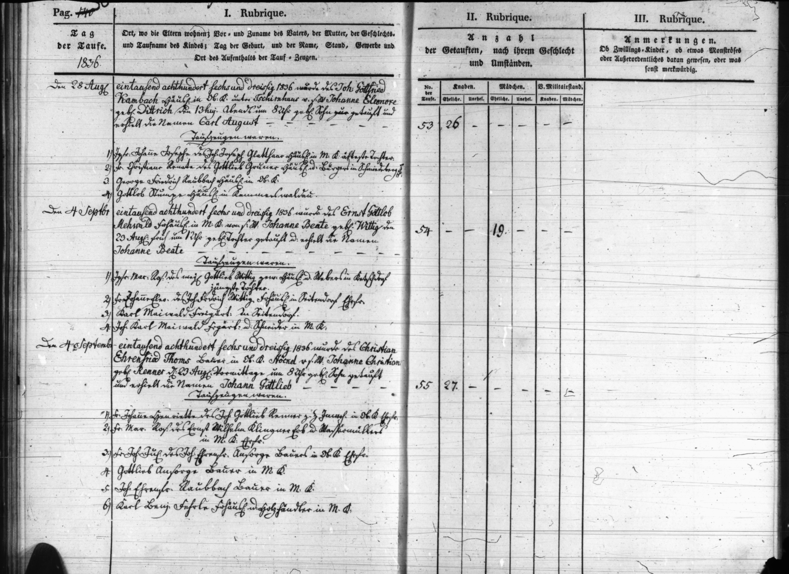 Text | Quellenscan: http://bilder.goldberg-haynau.de/Kauffung/Taufen/Taufen%201835-1836%20u%20Trauungen-Begraebnisse/t_0713.jpg [color=#FF0000]Quelle S671, [/color] Taufen Kauffung 1836-15 Pag 38 Nr. 53 den 28. August 1836 Wurde des Johann Gottfried Kambach, Häusler in Ober Kauffung unter Tschirnhaus, von seinem Weibe Johanne Eleonore geborene Dittrich XIII des Monats abends um 8:00 Uhr geborene Sohn getauft, und erhielt die Namen Carl August. Taufzeugen waren: 1. Jungfer Johanne Josephe, des Johann Joseph Glatthaar, Häusler in Mittel Kauffung älteste Tochter. 2. Frau Christiane Renate, des Gottlieb Gruner, Häusler und Bürger in Schmiedeberg. 3. George Friedrich Raubbach, Häusler in Ober Kauffung. 4. Gottlob Stumpe, Häusler in Kammerswaldau. Nr. 54 den 4. September 1836 Wurde des Ernst Gottlob Mehwald, Freihäusler in Mittel Kauffung, von seinem Weibe Johanne Beate geborene Wittig den 23. August früh um 1:00 Uhr geborene Tochter getauft, und erhielt die Namen Johanne Beate. Taufzeugen waren: 1. Jungfer Maria Rosine, des weiland Gottlieb Wittig, gewesener Häusler und Weber in Ketschdorf jüngste Tochter. 2. Frau Johanne Eleonore, des Johann Friedrich Wittig, Freihäusler in Seitendorf Ehefrau. 3. Karl Maiwald, Freigärtner in Seitendorf. 4. Johann Karl Maiwald, Freigärtner und Schneider in Mittel Kauffung. Nr. 55 den 4. September 1836 Wurde des Christian Ehrenfried Thoms, (Doms, Dohms) Bauer in Ober Kauffung-Stöckel, von seinem Weibe Johanne Christiane geborene Renner, den 23. August vormittags um 8:00 Uhr geborene Sohn getauft, und erhielt die Namen Johann Gottlieb. Taufzeugen waren: 1. Frau Johanne Henriette, des Johann Gottlieb Renner, zur Zeit Inwohner in Ober Kauffung Ehefrau. 2. Frau Maria Rosine, des Ernst Wilhelm Klinger, Erb-und Wassermüller in Mittel Kauffung Ehefrau. 3. Frau Johanne Juliane, des Johann Ehrenfried Ansorge, Bauer in Ober Kauffung Ehefrau. 4. Gottlieb Ansorge, Bauer in Mittel Kauffung. 5. Johann Ehrenfried Raubbach, Bauer in Mittel Kauffung. 6. Karl Benjamin Fehrle, Freihäusler und Holzhändler in Mittel Kauffung. | |