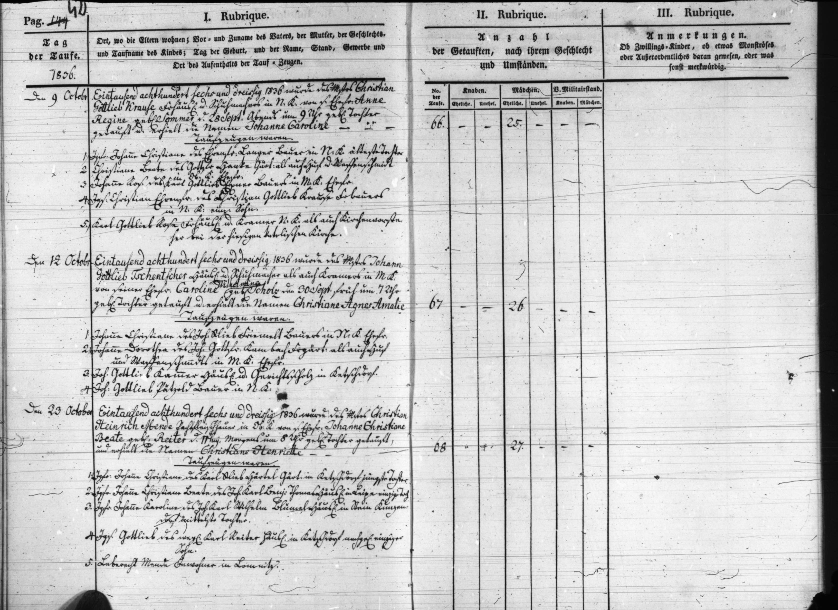 Text | Quellenscan: http://bilder.goldberg-haynau.de/Kauffung/Taufen/Taufen%201835-1836%20u%20Trauungen-Begraebnisse/t_0717.jpg [color=#FF0000]Quelle S675, [/color] Taufen Kauffung 1836-19 Pag 42 Nr. 66 den 9. Oktober 1836 Wurde des Meisters Christian Gottlieb Krause, Freihäusler und Schumacher in Nieder Kauffung, von seiner Ehefrau Anne Regine geborene Sommer den 28. September abends um 9:00 Uhr geborene Tochter getauft, und erhielt die Namen Johanne Caroline. Taufzeugen waren: 1. Jungfer Johanne Christiane, des Ehrenfried Langer, Bauer in Nieder Kauffung älteste Tochter. 2. Christiane Beate, des Gottfried Hanke, Gärtner als auch Huf-und Waffenschmidt in Ober Kauffung Ehefrau. 3. Johanne Rosine, des Karl Gottlieb Exner?, Bauer in Mittel Kauffung Ehefrau. 4. Junggesell Christian Ehrenfried, des Christian Gottlieb Krause, Freibauer? In Nieder Kauffung einziger Sohn. 5. Karl Gottlieb Rose, Freihäusler und Kramer in Nieder Kauffung als auch Kirchenvorsteher bei der hiesigen katholischen Kirche. Nr. 67 den 12. Oktober 1836 Wurde des Meisters Johann Gottlieb Tschentscher, Häusler und Schumacher als auch Kramer in Mittel Kauffung, von seiner Ehefrau Caroline Wilhelmine geborene Scholz den 30. September früh um 7:00 Uhr geborene Tochter getauft, und erhielt die Namen Christiane Agnes Amalie. Taufzeugen waren: 1. Johanne Christiane, des Johann Gottlieb Friemelt, Bauer in Nieder Kauffung Ehefrau. 2. Johanne Dorothea, des Johann Gottfried Kambach, Freigärtner als auch Huf-und Waffenschmidt in Mittel Kauffung Ehefrau. 3. Johann Gottlieb Kammer, Häusler und Gerichtsscholz in Ketschdorf. 4. Johann Gottlieb Pätzold, Bauer in Nieder Kauffung. Nr. 68 den 23. Oktober 1836 Wurde des Meisters Christian Heinrich Mendel?, Pacht Fleischhauer in Ober Kauffung, von seiner Ehefrau Johanne Christiane Beate geborene Reiter den 11. des Monats morgens um 8:00 Uhr geborene Tochter getauft, und erhielt die Namen Christiane Henriette. Taufzeugen waren: 1. Jungfer Johanne Christiane, des Karl Gottlieb Härtel Gärtner in Ketschdorf jüngste Tochter. 2. Jungfer Johanne Christiane Beate, des Johann Karl Benjamin Thomas, Häusler in Leipe einzige Tochter. 3. Jungfer Johanne Karoline, des Johann Karl Wilhelm Blümel, Häusler in Stein Kunzendorf mittelste Tochter. 4. Junggesell Gottlieb, des weiland Karl Reiter, Häusler in Ketschdorf nachgelassener einziger Sohn. 5. Leberecht Mendel, Inwohner in Lomnitz. | |