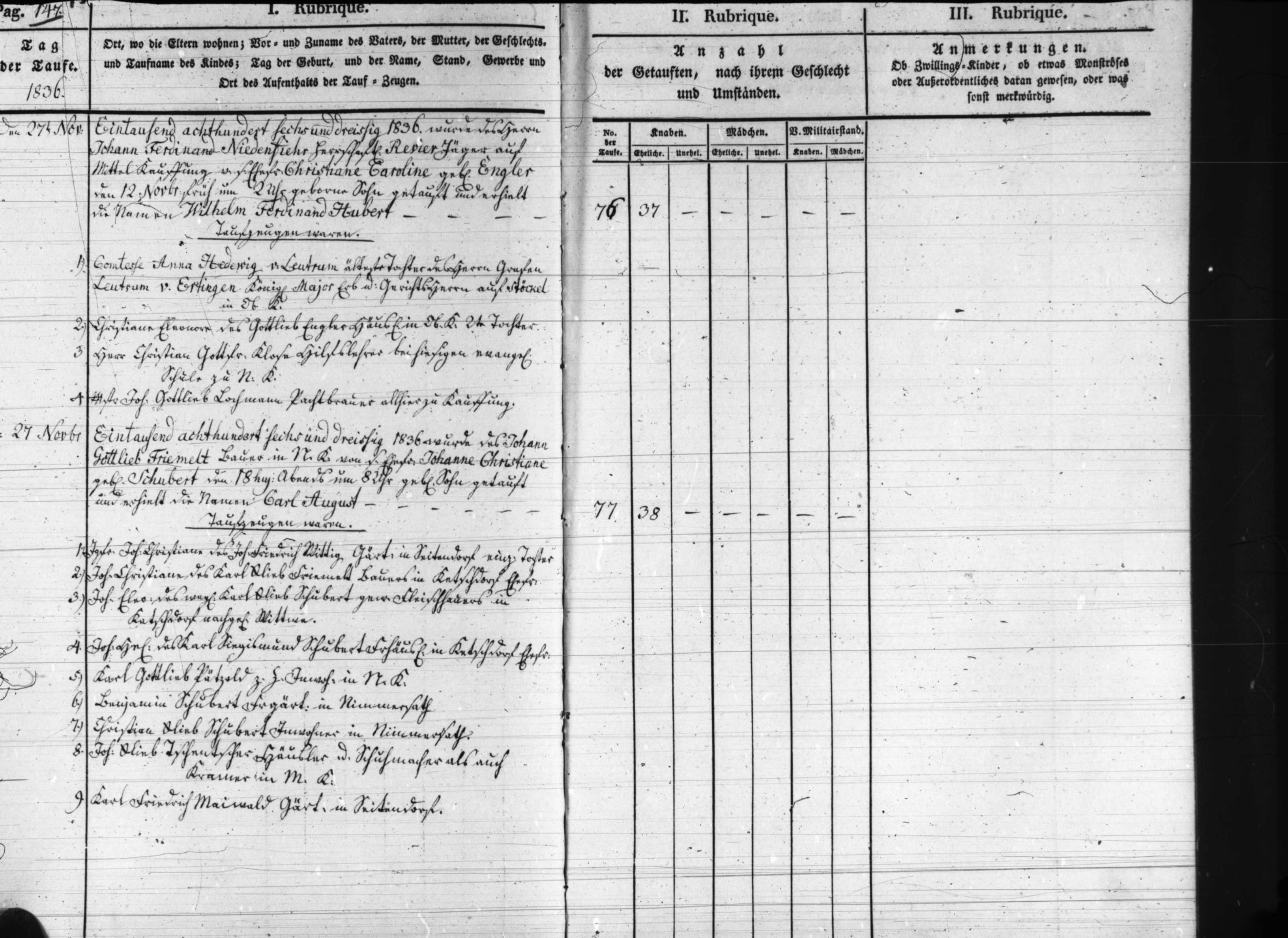 Text | Quellenscan: http://bilder.goldberg-haynau.de/Kauffung/Taufen/Taufen%201835-1836%20u%20Trauungen-Begraebnisse/t_0720.jpg [color=#FF0000]Quelle S678, [/color] Taufen Kauffung 1836-22 Pag 45 Nr. 76 den 27. November 1836 Wurde des Herrn Johann Ferdinand Niedenfiehr, herrschaftlicher Revierjäger auf Mittel Kauffung, von seiner Ehefrau Christiane Caroline geborene Engler den 12. November früh um 2:00 Uhr geborene Sohn getauft, und erhielt die Namen Wilhelm Ferdinand Hubert. Taufzeugen waren: 1. Comtesse Anna Hedewig von Leutrum, älteste Tochter des Herrngrafen Leutrum von Ertingen, königlicher Major, Erb-und Gerichtsherr auf Stöckel in Ober Kauffung. 2. Christiane Eleonore, des Gottlieb Engler, Häusler in Ober Kauffung 2. Tochter. 3. Herr Christian Gottfried Klose, Hilfslehrer bei hiesigen evangelischen Schule zu Nieder Kauffung. 4. Meister Johann Gottlieb Lochmann, Pachtbrauer allhier zu Kauffung. Nr. 77 den 27. November 1836 wurde des Johann Gottlieb Friemelt, Bauer in Nieder Kauffung, von seiner Ehefrau Johanne Christiane geborene Schubert den 18. des Monats abends um 8:00 Uhr geborene Sohn getauft, und erhielt die Namen Carl August. Taufzeugen waren: 1. Jungfer Johanne Christiane, des Johann Friedrich Wittig, Gärtner in Seitendorf einzige Tochter. 2. Johanne Christiane, des Karl Gottlieb Friemelt, Bauer in Ketschdorf Ehefrau. 3. Johanne Eleonore, des weiland Karl Gottlieb Schubert, gewesener Fleischhauer in Ketschdorf nachgelassene Witwe. 4. Johanne Helene, des Karl Sigismund Schubert, Freihäusler in Ketschdorf Ehefrau. 5. Karl Gottlieb Pätzold, zur Zeit Inwohner in Nieder Kauffung. 6. Benjamin Schubert, Freigärtner in Nimmersatt. 7. Christian Gottlieb Schubert, Inwohner in Nimmersatt. 8. Johann Gottlieb Tschentscher, Häusler und Schumacher als auch Kramer in Mittel Kauffung. 9. Karl Friedrich Maiwald, Gärtner in Seitendorf. | |