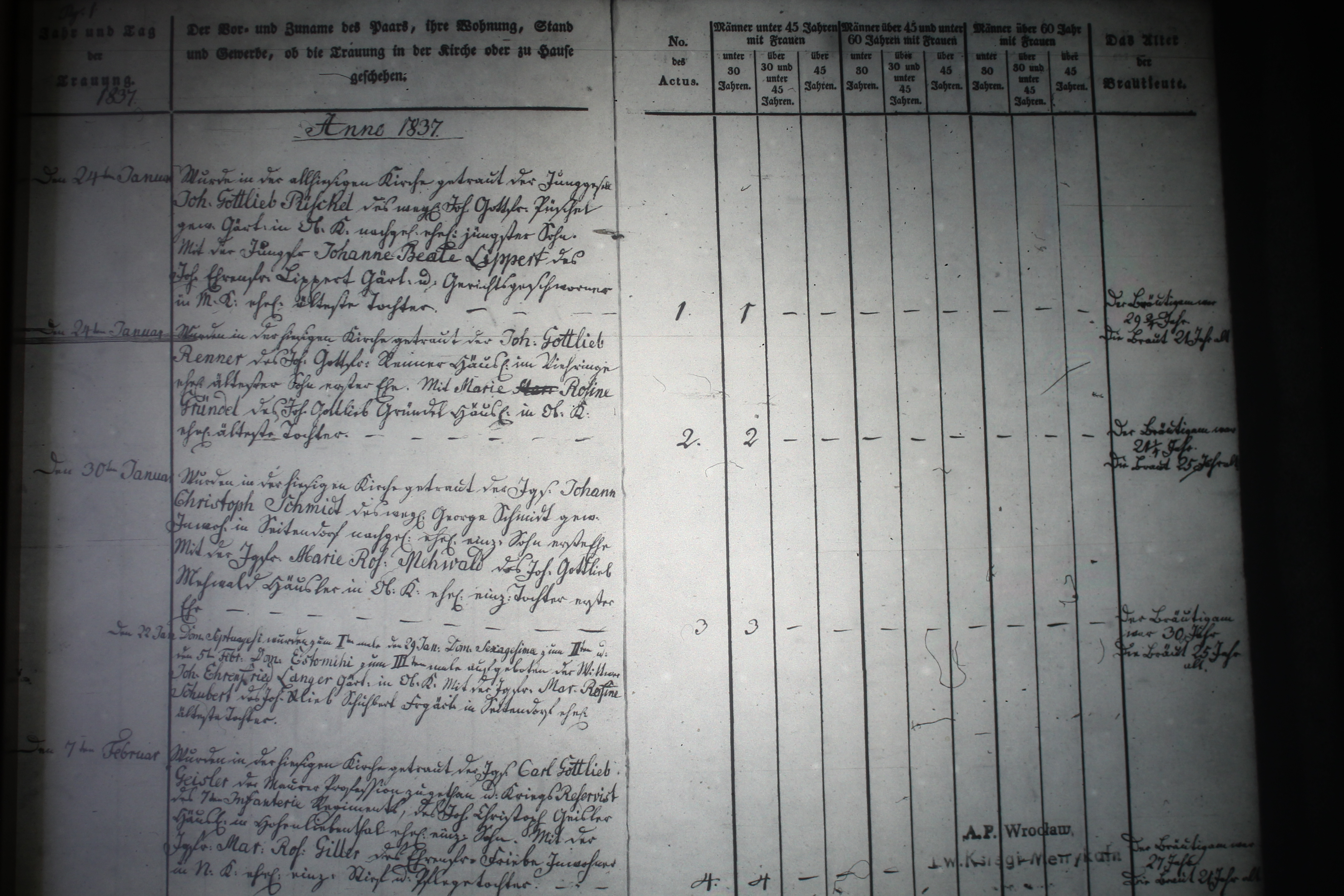 Text | Quellenscan: http://bilder.goldberg-haynau.de/Kauffung/Eheschliessungen/Ehen%201837-1841/mormon%20207.JPG [color=#FF0000]Quzelle S681, [/color] Ehen 1837-01 Pag1 Nr. 1 den 24. Januar 1837 Wurde in der hiesigen Kirche getraut der Junggesell Johann Gottlieb Püschel, des weiland Johann Gottfried Püschel, gewesener Gärtner in Ober Kauffung nachgelassener ehelicher jüngster Sohn, mit der Jungfer Johanne Beate Lippert,des Johann Ehrenfried Lippert,Gärtner und Gerichtsgeschworener in Mittel Kauffung eheliche älteste Tochter.der Bräutigam war 29 dreiviertel die Braut 21 Jahre alt. Nr. 2 den 24. Januar 1837 Wurde in der hiesigen Kirche getraut der Johann Gottlieb Renner, des Johann Gottfried Renner, Häusler in Kauffung Viehring ehelicher ältester Sohn 1. Ehe. Mit Marie Rosine Gründel, des Johann Gottlieb Gründel, Häusler in Ober Kauffung eheliche älteste Tochter. Der Bräutigam war 21 einviertel die Braut 25 Jahre alt. Nr. 3 den 30. Januar 1837 Wurde in der hiesigen Kirche getraut der Junggesell Johann Christoph Schmidt, des weiland George Schmidt, gewesener Inwohner in Seitendorf nachgelassener ehelicher einziger Sohn 1. Ehe. mit der Jungfer Marie Rosine Mehwald, des Johann Gottlieb Mehwald, Häusler in Ober Kauffung eheliche einzige Tochter 1. Ehe. Der Bräutigam war 30 die Braut 25 Jahre alt. Aufgebot den 22. Januar Dom. Septuagesiwurde zum 1. Male, den 29. Januar Dom. Sexagesimi zum 2. Mal und den 5. Februar Dom. Estomihizum 3. Male aufgeboten der Wittwer Johann Ehrenfried Langer, Gärtner in Ober Kauffung, mit der Jungfer Marie Rosine Schubert, des Johann Gottlieb Schubert, Freigärtner in Seitendorf eheliche älteste Tochter. Nr. 4 den 7. Februar 1837 Wurde in der hiesigen Kirche getraut der Junggesell Carl Gottlieb Geisler, der Maurer Profession zugetan und Kriegsreservist des 7.Infanterieregiment, des Johann Christoph Geisler, Häusler in Hohenliebenthal ehelicher einziger Sohn. Mit der Jungfer Marie Rosine Giller, des Ehrenfried Friebe, Inwohner in Nieder Kauffung eheliche einzige Stieftochter und Pflegetochter der Bräutigam war 27 die Braut 21 Jahre alt | |