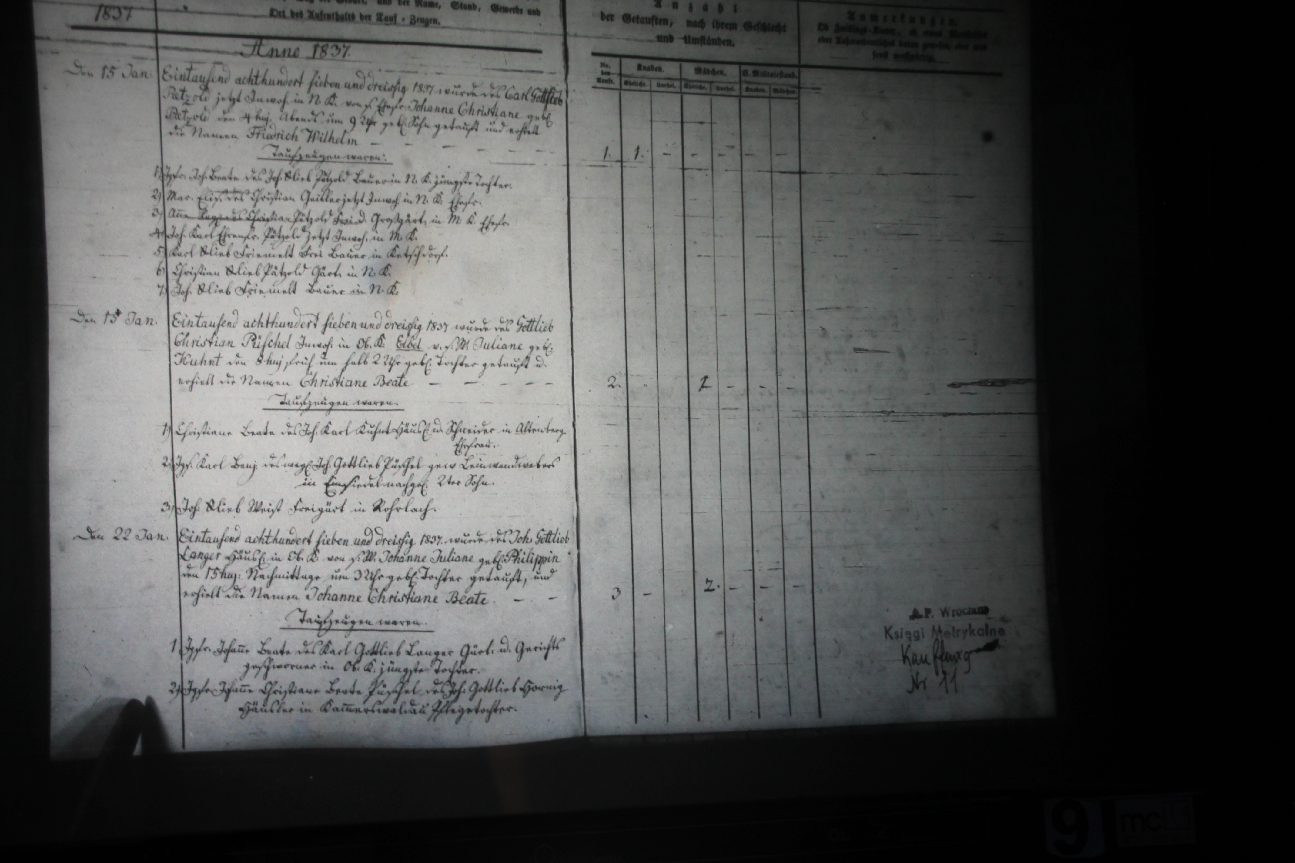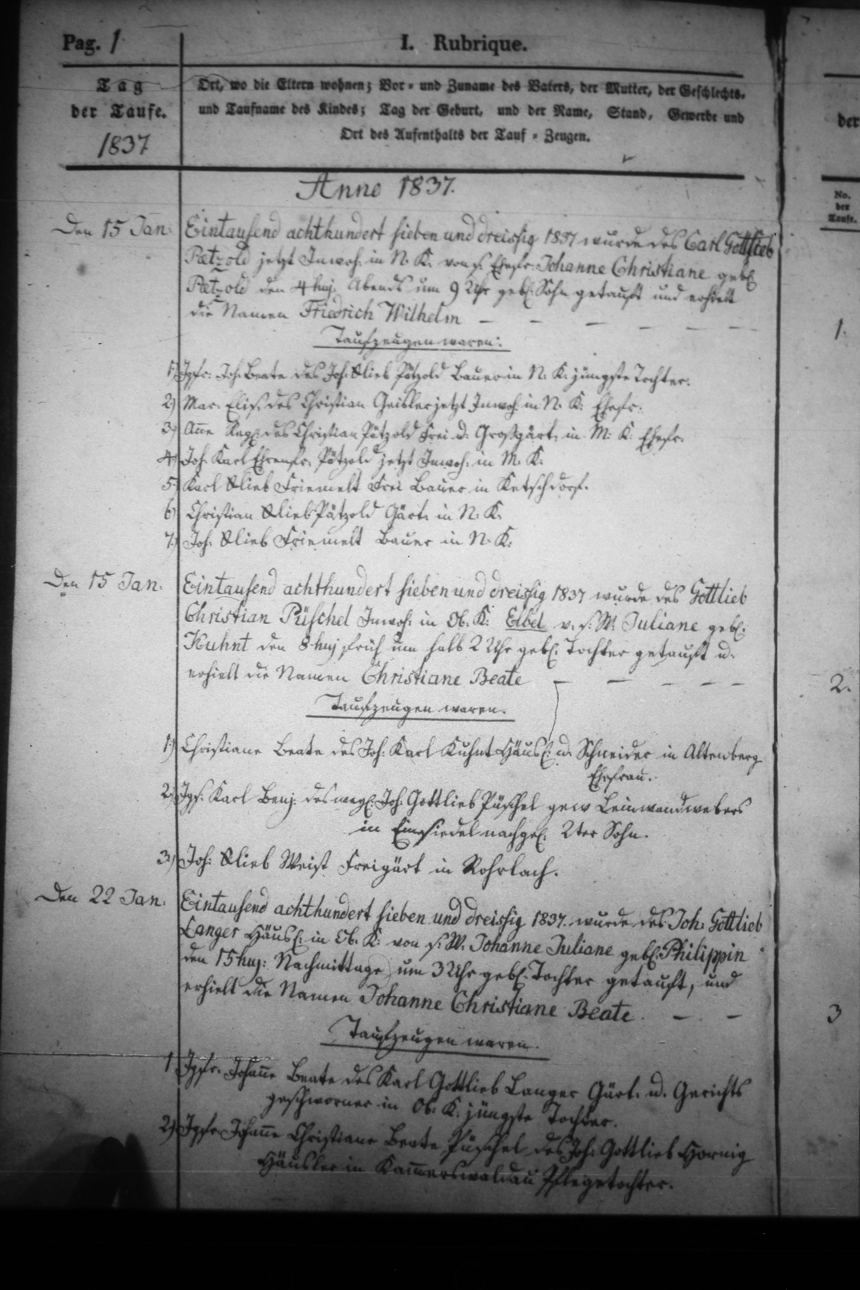 Text | Quellenscan: http://bilder.goldberg-haynau.de/Kauffung/Taufen/Taufen%201837-1839/IMG_4987.JPG http://bilder.goldberg-haynau.de/Kauffung/Taufen/Taufen%201837-1839/ersatzbilder/mom_1227.JPG [color=#FF0000]Quelle S682, [/color] Taufen Kauffung 1837-01 Pag 1 Nr 1 den 15. Januar 1837 Wurde des Carl Gottlieb Pätzold, jetzt Inwohner in Nieder Kauffung, von seiner Ehefrau Johanne Christiane geborene Pätzold den 4. des Monats abends um 9:00 Uhr geborene Sohn getauft, und erhielt die Namen Friedrich Wilhelm. Taufzeugen waren: 1. Jungfer Johanne Beate, des Johann Gottlieb Pätzold, Bauer in Nieder Kauffung jüngste Tochter. 2. Marie Elisabeth, des Christian Geisler, jetzt Inwohner in Nieder Kauffung Ehefrau. 3. Anne Regine, des Christian Pätzold, Frey-und Großgärtner in Mittel Kauffung Ehefrau. 4. Johann Karl Ehrenfried Pätzold, jetzt Inwohner in Mittel Kauffung. 5. Karl Gottlieb Friemelt, Freibauer in Ketschdorf. 6. Christian Gottlieb Pätzold, Gärtner in Nieder Kauffung. 7. Johann Gottlieb Friemelt, Bauer in Nieder Kauffung. Nr 2 den 15. Januar 1837 wurde des Gottlieb Christian Püschel, Inwohner in Ober Kauffung-Elbel, von seinem Weibe Juliane geborene Kuhnt den 8. des Monats früh um 1:30 Uhr geborene Tochter getauft, und erhielt die Namen Christiane Beate. Taufzeugen waren: 1. Christiane Beate, des Johann Karl Kuhnt, Häusler und Schneider in Altenberg Ehefrau. 2. Junggesell Karl Benjamin, des weiland Johann Gottlieb Püschel, gewesener Leinwand Weber in Einsiedel nachgelassener 2. Sohn. 3. Johann Gottlieb Weist, Freigärtner in Rohrlach. Nr.3 den 22. Januar 1837 wurde des Johann Gottlieb Langer, Häusler in Ober Kauffung, von seinem Weibe Johanne Juliane geborene Philipp XV des Monats nachmittags um 3:00 Uhr geborene Tochter getauft, und erhielt die Namen Johanne Christiane Beate. Taufzeugen waren: 1. Jungfer Johanne Beate, des Karl Gottlieb Langer, Gärtner und Gerichtsgeschworener in Ober Kauffung jüngste Tochter. 2. Jungfer Johanne Christiane Beate Püschel, des Johann Gottlieb nicht, Häusler in Kammerswaldau Pflegetochter. (Fortsetzung nächste Seite) | |