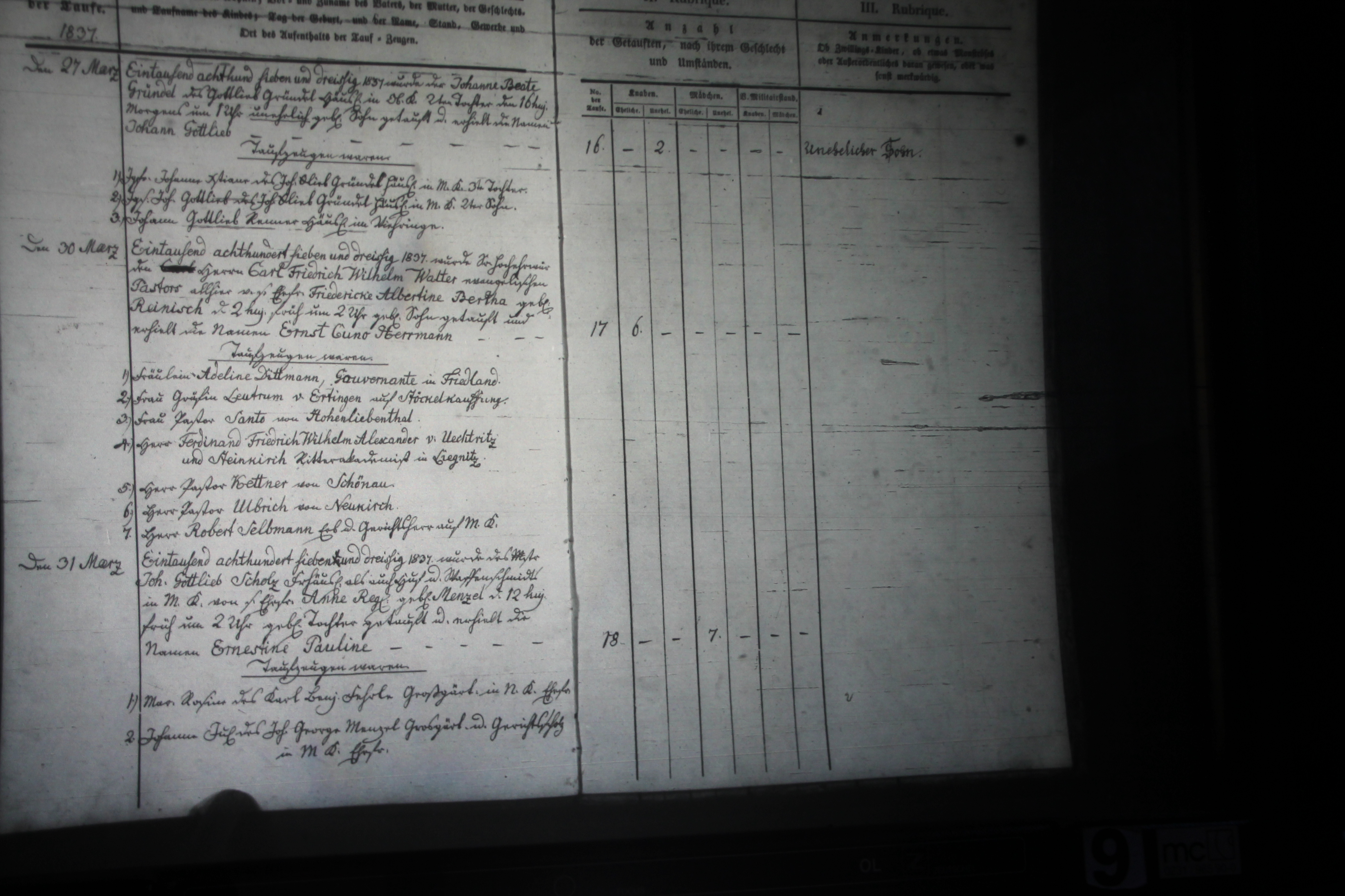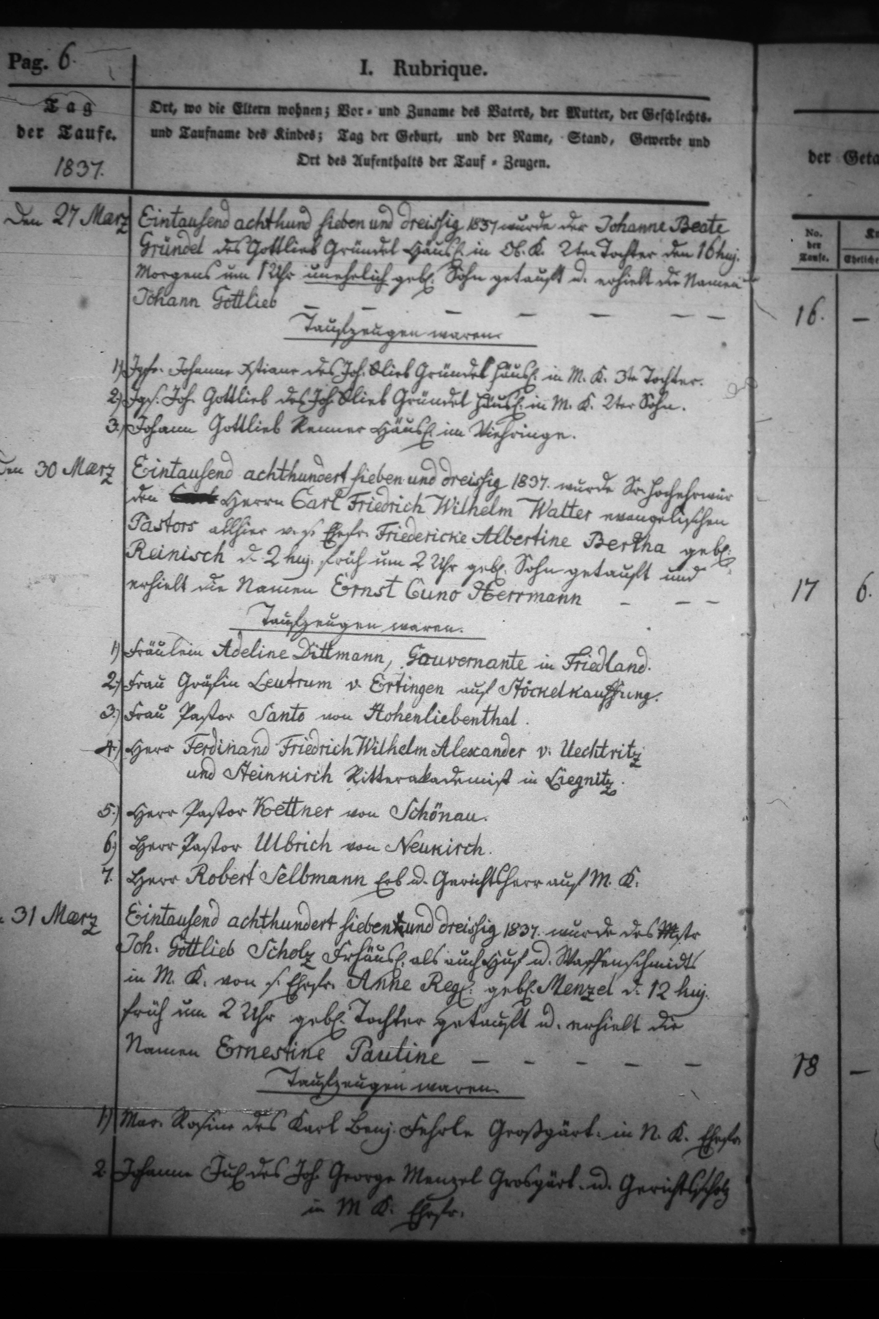 Text | Quellenscan: http://bilder.goldberg-haynau.de/Kauffung/Taufen/Taufen%201837-1839/IMG_4992.JPG http://bilder.goldberg-haynau.de/Kauffung/Taufen/Taufen%201837-1839/ersatzbilder/mom_1232.JPG [color=#FF0000]Quelle S687, [/color] Taufen Kauffung 1837-06 Pag 6 Nr. 16 den 27. März 1837 wurde der Johanne Beate Gründel, des Johann Gottfried Gründel, Häusler in Ober Kauffung 2. Tochter den 16. des Monats um 1:00 Uhr unehelich geborener Sohn getauft, und erhielt die Namen Johann Gottlieb. Taufzeugen waren: 1. Jungfer Johanne Christiane, des Johann Gottlieb Gründel, Häusler in Mittel Kauffung 3. Tochter. 2. Junggesell Johann Gottlieb, des Johann Gottlieb Gründel, Häusler in Mittel Kauffung 2. Sohn. 3. Johann Gottlieb Renner, Häusler in Viehring-Mittel Kauffung. Nr. 17 den 30. März 1837 Wurde Sr. Hochwürden Herrn Carl Friedrich Wilhelm Walter, evangelischer Pastor all hier, von seiner Ehefrau Friedericke Albertine Bertha geborene Reinisch, den 2. des Monats früh um 2:00 Uhr geborene Sohn getauft, und erhielt die Namen Ernst Cuno Hermann. Taufzeugen waren: 1. Fräuleinade Adeline Dittmann, Gouvernante in Friedland 2. Frau Gräfin Leutrum von Ertingen auf Stöckel-Kauffung. 3. Frau Pastor Sante (Santo?) von Hohenliebenthal. 4. Herr Ferdinand Friedrich Wilhelm Alexander von Uechtritz und Steinkirch, Ritterakademist in Liegnitz. 5. Herr Pastor Kettner von Schönau. 6. Herr Pastor Ulbrich Front Neukirch. 7. Herr Robert Selbmann, Erb-und Gerichtsherr auf Mittel Kauffung. Nr. 18 den 31. März 1837 Wurde des Meister Johann Gottlieb Scholz, Freihäusler als auch Huf-und Waffenschmidt in Mittel Kauffung, von seiner Ehefrau Anne Regine geborene Menzel den 12. des Monats früh um 2:00 Uhr geborene Tochter getauft, und erhielt die Namen Ernestine Pauline Taufzeugen waren: 1. Maria Rosine, des Karl Benjamin Fehrle, Großgärtner in Nieder Kauffung Ehefrau. 2. Johanne Juliane, des Johann George Menzel, Großgärtner und Gerichtsscholz in Mittel Kauffung Ehefrau. (Fortsetzung nächste Seite) Pag 7 Fortsetzung von Pag 6 3. Johanne Christiane, des Ehrenfried Tschentscher, Häusler in Mittel Kauffung Ehefrau. 4. Junggesell Karl Gottlieb, des Johann Christoph Freche, Hofegärtner in Mittel Kauffung ältester Sohn. 5. Karl Gottlieb Beer, Freibauer in Mittel Kauffung. 6. Karl Gottfried Bruchmann, Gärtner in Mittel Kauffung. | |