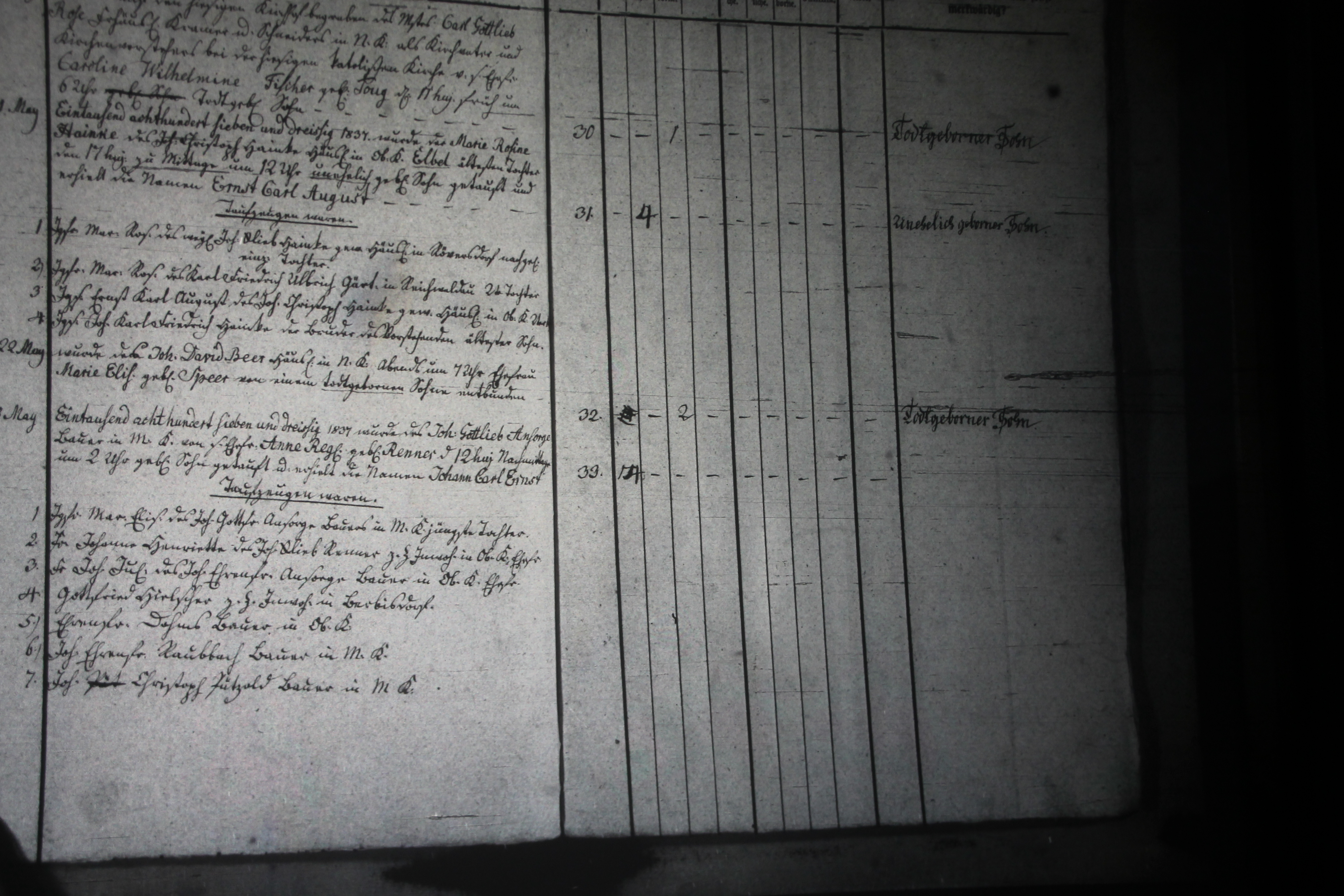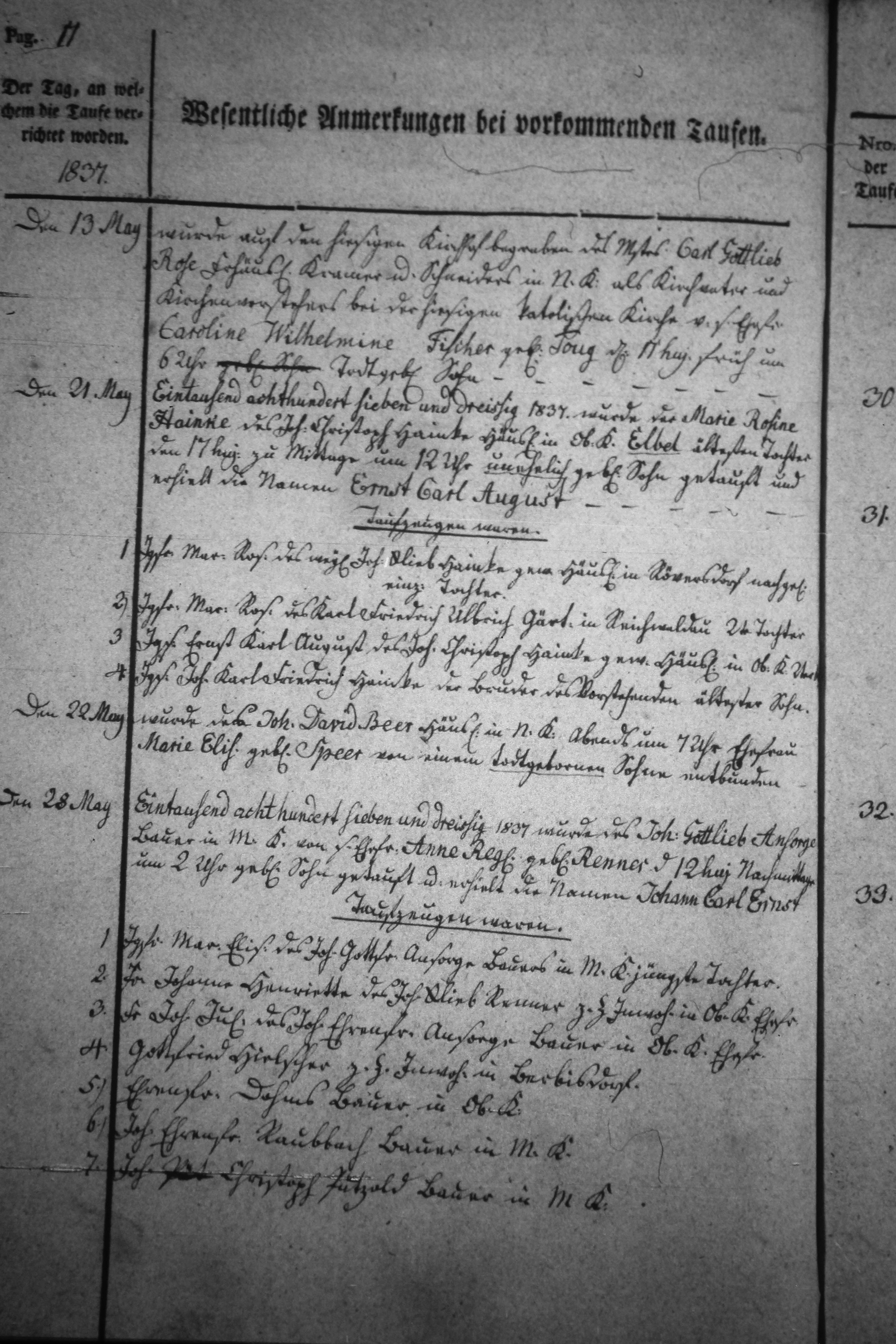 Text | Quellenscan: http://bilder.goldberg-haynau.de/Kauffung/Taufen/Taufen%201837-1839%20zweitesmal/IMG_5128.JPG http://bilder.goldberg-haynau.de/Kauffung/Taufen/Taufen%201837-1839/ersatzbilder/mom_1358.JPG [color=#FF0000]Quelle S692, [/color] Taufen Kauffung 1837-11 Pag 11 Nr. 30 den 13. Mai 1837 wurde auf dem hiesigen Kirchhof begraben des Meister Carl Gottlieb Rose, Freihäusler Kramer und Schneider in Nieder Kauffung, als auch Kirch Vater und Kirchenvorsteher bei der hiesigen katholischen Kirche, von seiner Ehefrau Caroline Wilhelmine Fischer geborene Toug, den 17. des Monats früh um 6:00 Uhr tot geborene Sohn. Nr. 31 den 21. Mai 1837 Wurde der Maria Rosina Hainke, des Johann Christoph Hainke, Häusler in Ober Kauffung-Elbel ältesten Tochter den 17. des Monats zu Mittage um 12:00 Uhr unehelich geborene Sohn getauft, und erhielt die Namen Ernst Carl August. Taufzeugen waren: 1. Jungfer Maria Rosine, des weiland Johann Gottlieb Hainke, gewesener Häusler in Röversdorf nachgelassene einzige Tochter. 2. Jungfer Maria Rosine, des Karl Friedrich Ulbrich, Gärtner in Reichwaldau 2. Tochter. 3. Junggesell Ernst Karl August, des Johann Christoph Hainke, gewesener Häusler in Ober Kauffung 2. Sohn? 4. Junggesell Johann Karl Friedrich Hainke, der Bruder des vorstehenden ältester Sohn. Nr. 32 den 22. Mai 1837 Wurde des Johann David Beer, Häusler in Nieder Kauffung, abends um 7:00 Uhr Ehefrau Marie Elisabeth geborene Speer von einem tot geborenen Sohn entbunden. Nr. 33 den 28. Mai 1837 Wurde des Johann Gottlieb Ansorge, Bauer in Mittel Kauffung, von seiner Ehefrau Anne Regine geborene Renner den 12. des Monats nachmittags um 2:00 Uhr geborene Sohn getauft, und erhielt die Namen Johann Carl Ernst. Taufzeugen waren: 1. Jungfer Marie Elisabeth, des Johann Gottfried Ansorge, Bauer in Mittel Kauffung jüngste Tochter. 2. Frau Johanne Henriette, des Johann Gottlieb Renner, zur Zeit Inwohner in Ober Kauffung Ehefrau. 3. Frau Johanne Juliane, des Johann Ehrenfried Ansorge, Bauer in Ober Kauffung Ehefrau. 4. Gottfried Hielscher?, Zur Zeit Inwohner in Berbisdorf. 5. Ehrenfried Dohms (Thoms?), Bauer in Ober Kauffung. 6. Johann Ehrenfried Raubbach, Bauer in Mittel Kauffung 7. Johann Christoph Pätzold, Bauer in Mittel Kauffung | |
