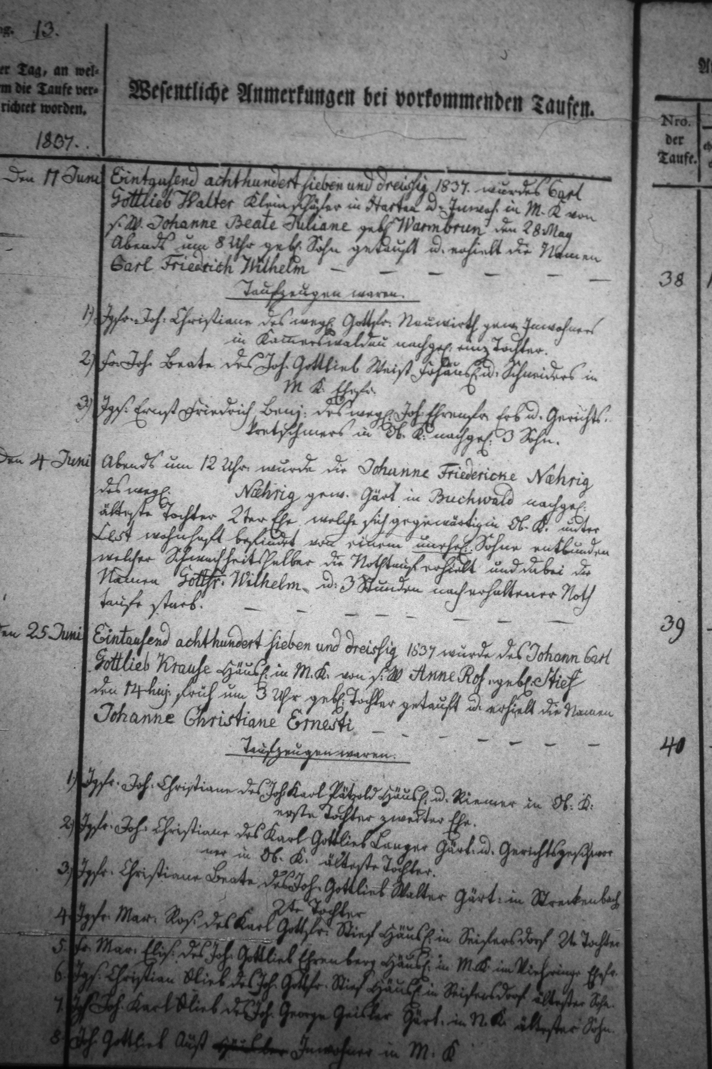 Text | Quelle Scan: http://bilder.goldberg-haynau.de/Kauffung/Taufen/Taufen%201837-1839%20zweitesmal/IMG_5130.JPG http://bilder.goldberg-haynau.de/Kauffung/Taufen/Taufen%201837-1839/ersatzbilder/mom_1360.JPG [color=#FF0000]Quelle S694, [/color] Taufen Kauffung 1837-13 Pag 13 Nr. 38 den 11. Juni 1837 Wurde des Carl Gottlieb Walter, Kleinschäfer in Hartau und Inwohner in Mittel Kauffung, von seinem Weibe Johanne Beate Juliane geborene Warmbrunn den 28. Mai abends um 8:00 Uhr geborene Sohn getauft, und erhielt die Namen Carl Friedrich Wilhelm. Taufzeugen waren: 1. Jungfer Johanne Christiane, des weiland Gottfried Neuwirth?, gewesener Inwohner in Kammerswaldau nachgelassene einzige Tochter. 2. Frau Johanne Beate, des Johann Gottlieb Weist, Freihäusler und Schneider in Mittel Kauffung Ehefrau. 3. Junggesell Ernst Friedrich Benjamin, des weiland Johann Ehrenfried, Erb-und Gerichtskretschmer in Ober Kauffung nachgelassener 3. Sohn. Nr. 39 den 4. Juni 1837 Abends um 12:00 Uhr wurde der Johanne Friedericke Nährig, des weiland Nährig, gewesener Gärtner in Buchwald nachgelassene älteste Tochter 2. Ehe, welche sich gegenwärtig in Ober Kauffung unter Lest wohnhaft befindet, von einem unehelichen Sohn entbunden, welches schwachheitshalber die Nottaufe erhielt und dabei die Namen Gottfried Wilhelm, und 3 Stunden nach erhaltener Nottaufe starb. Nr. 40 den 25. Juni 1837 Wurde des Johann Carl Gottlieb Krause, Häusler in Mittel Kauffung, von seinem Weibe Anne Rosine geborene Stief den 14. des Monats früh um 3:00 Uhr geborene Tochter getauft, und erhielt die Namen Johanne Christiane Ernestine. Taufe zeigt waren: 1. Jungfer Johanne Christiane, des Johann Karl Pätzold, Häusler und Riemer in Ober Kauffung 1. Tochter 2. Ehe. 2. Jungfer Johanne Christiane, des Karl Gottlieb Langer, Gärtner und Gerichtsgeschworener in Ober Kauffung älteste Tochter. 3. Jungfer Christiane Beate, des Johann Gottlieb Walter, Gärtner in Streckenbach 2. Tochter. 4. Jungfer Maria Rosine, des Karl Gottfried Stief, Häusler in Seiffersdorf 2. Tochter. 5. Frau Maria Elisabeth, des Johann Gottlieb Ehrenberg, Häusler in Mittel Kauffung in Viehring Ehefrau. 6. Junggesell Christian Gottlieb, des Johann Gottfried Stief, Häusler in Seiffersdorf ältester Sohn. 7. Junggesell Johann Karl Gottlieb, des Johann George Geisler, Gärtner in Nieder Kauffung ältester Sohn. 8. Johann Gottlieb Aust, Inwohner in Mittel Kauffung. | |