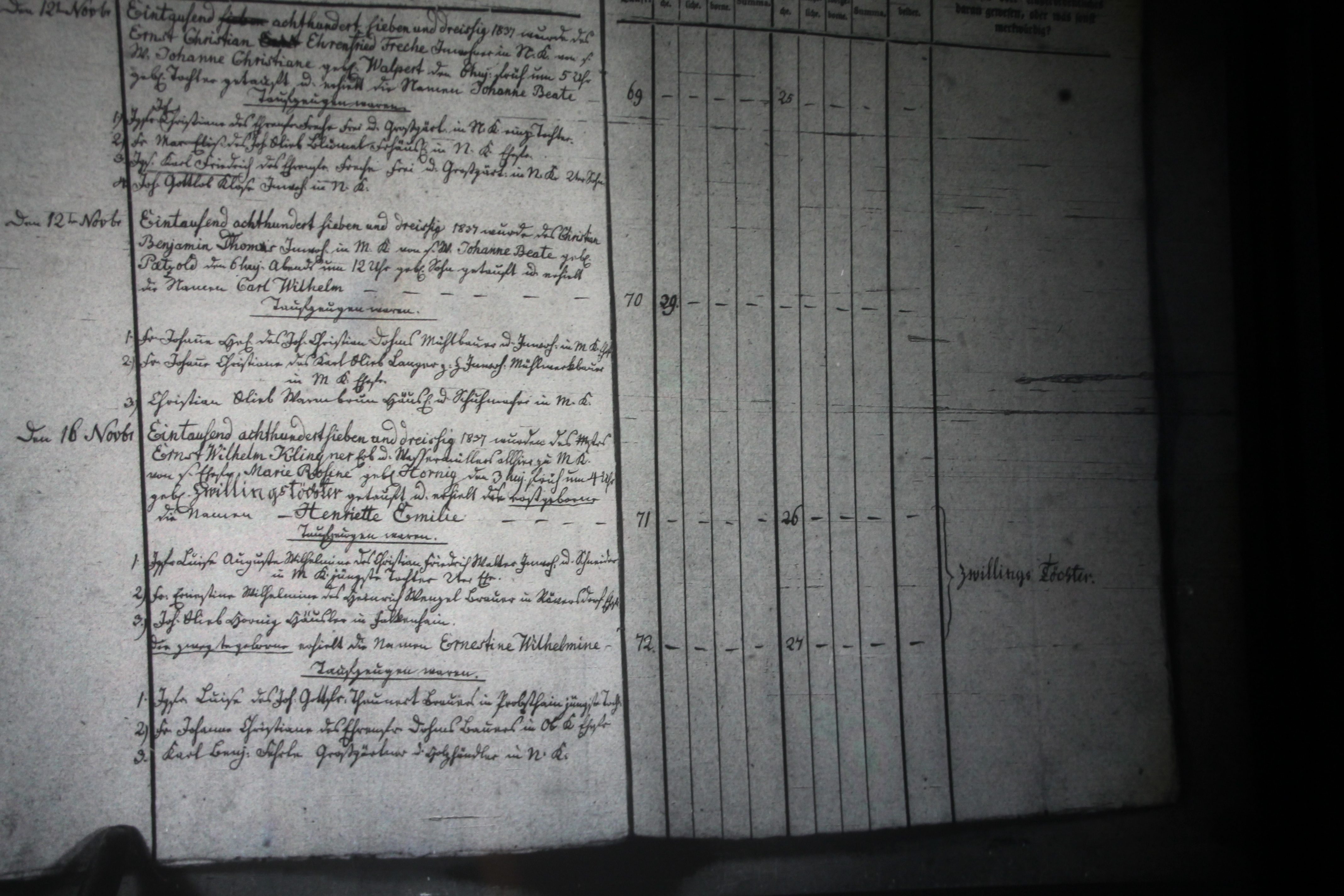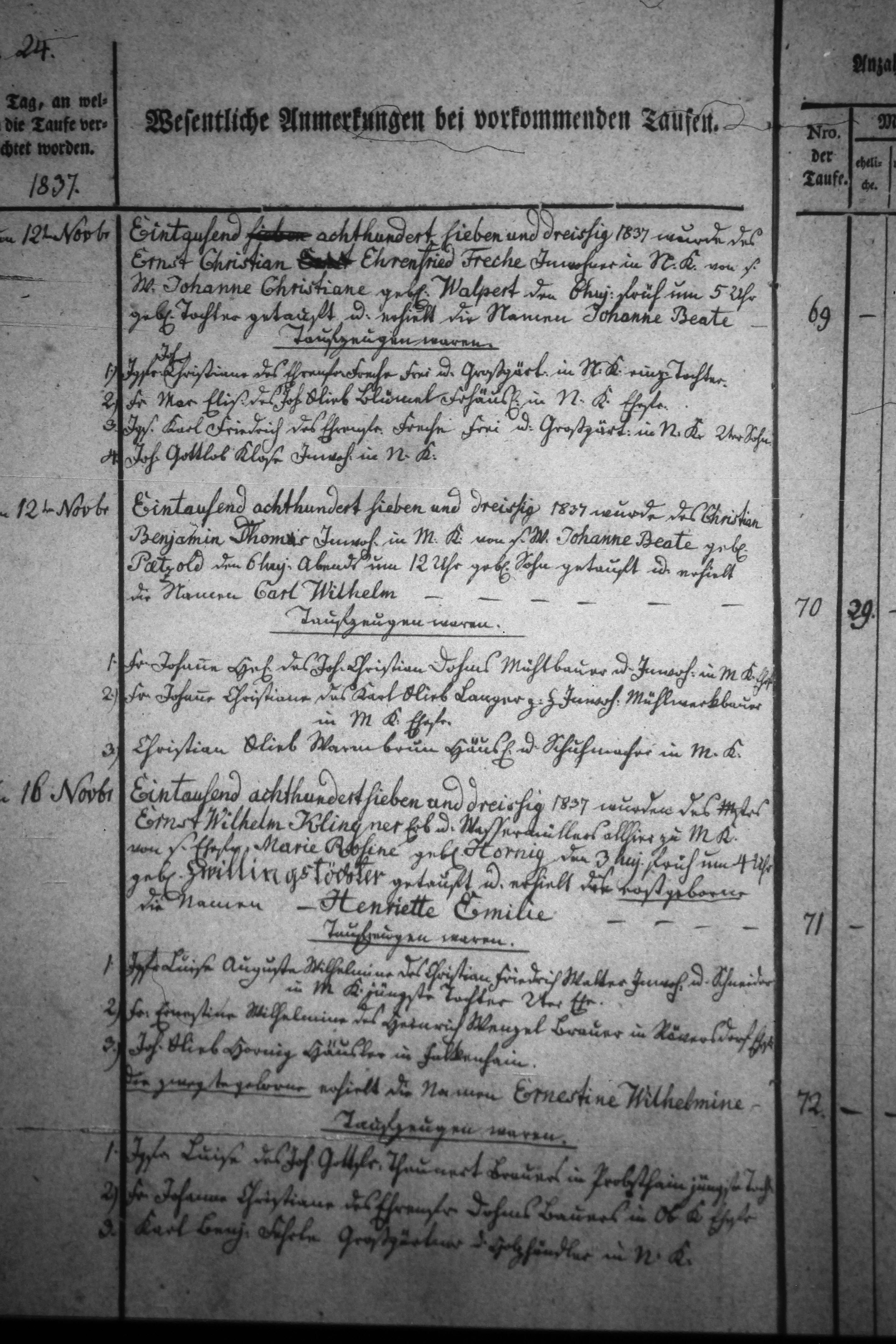 Text | Quellenscan: http://bilder.goldberg-haynau.de/Kauffung/Taufen/Taufen%201837-1839%20zweitesmal/IMG_5142.JPG http://bilder.goldberg-haynau.de/Kauffung/Taufen/Taufen%201837-1839/ersatzbilder/mom_1372.JPG [color=#FF0000]Quelle S705, [/color] Taufen Kauffung 1837-24 Pag 24 Nr. 69 den 12. November 1837 Wurde des Ernst Christian Ehrenfried Freche, Inwohner in Nieder Kauffung, von seinem Weibe Johanne Christiane geborene Walpert den 6. des Monats früh um 5:00 Uhr geborene Tochter getauft, und erhielt die Namen Johanne Beate. Taufzeugen waren: 1. Jungfer Johanne Christiane, des Ehrenfried Freche, Frey-und Großgärtner in Nieder Kauffung einzige Tochter. 2. Frau Maria Elisabeth, des Johann Gottlieb Blümel, Freihäusler in Nieder Kauffung Ehefrau. 3. Junggesell Karl Friedrich, des Ehrenfried Freche, Frey-und Großgärtner in Nieder Kauffung 2. Sohn. 4. Johann Gottlob Klose, Inwohner in Nieder Kauffung. Nr. 70 den 12. November 1837 Wurde des Christian Benjamin Thoms, Inwohner in Mittel Kauffung, von seinem Weibe Johanne Beate geborene Pätzold den 6. des Monats abends um 12:00 Uhr geborene Sohn getauft, und erhielt die Namen Carl Wilhelm. Taufzeugen waren: 1. Frau Johanne Helene, des Johann Christian Dohm (Thom, Tham?) , Mühlbauer und Inwohner in Mittel Kauffung Ehefrau. 2. Frau Johanne Christiane, des Karl Gottlieb Langer, zur Zeit Inwohner und Mühlwerkbauer in Mittel Kauffung Ehefrau. 3. Christian Gottlieb Warmbrunn, Häusler und Schumacher in Mittel Kauffung. Nr. 71 den 16. November 1837 Wurde des Meisters Ernst Wilhelm Klinger, Erb-und Wassermüller allhier zu Mittel Kauffung, von seiner Ehefrau Marie Rosine geborene Horn ich den 3. des Monats früh um 4:00 Uhr geborene Zwillingstöchter getauft, und erhielt die erst geborene die Namen Henriette Emilie. Taufzeugen waren: 1. Jungfer Luise Auguste Wilhelmine, des Christian Friedrich Walter, Inwohner und Schneider in Mittel Kauffung jüngste Tochter 2. Ehe. 2. Frau Ernestine Wilhelmine, des Heinrich Wenzel, Brauer in Röversdorf Ehefrau. 3. Johann Gottlieb Hornig, Häusler in Falkenhain. Nr. 72 die zweitgeborene erhielt die Namen Ernestine Wilhelmine. Taufzeugen waren: 1. Jungfer Luise, des Johann Gottfried Theunert, Brauer Probsthain jüngste Tochter. 2. Frau Johanne Christiane, des Ehrenfried Dohm (Thom?), Bauer in Ober Kauffung Ehefrau. 3. Karl Benjamin Fehrle, Gärtner und Holzhändler in Nieder Kauffung. | |