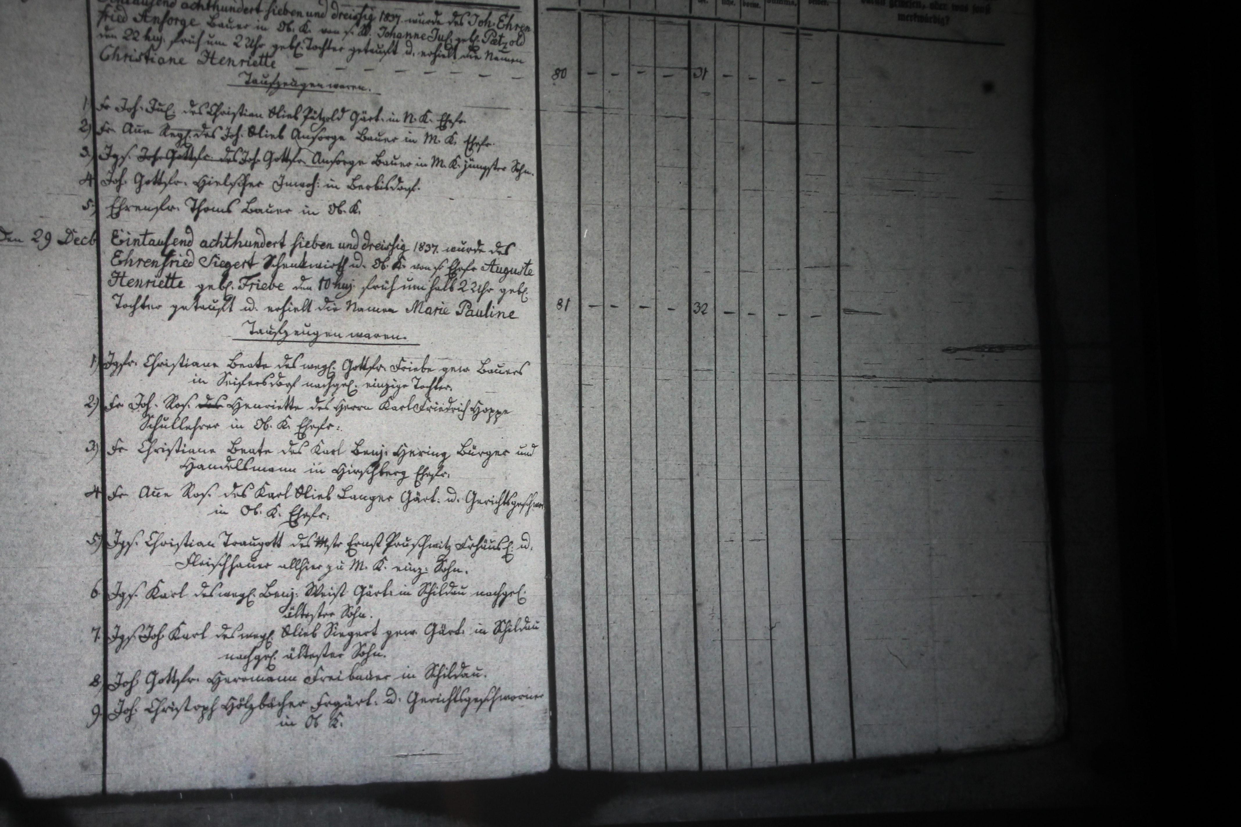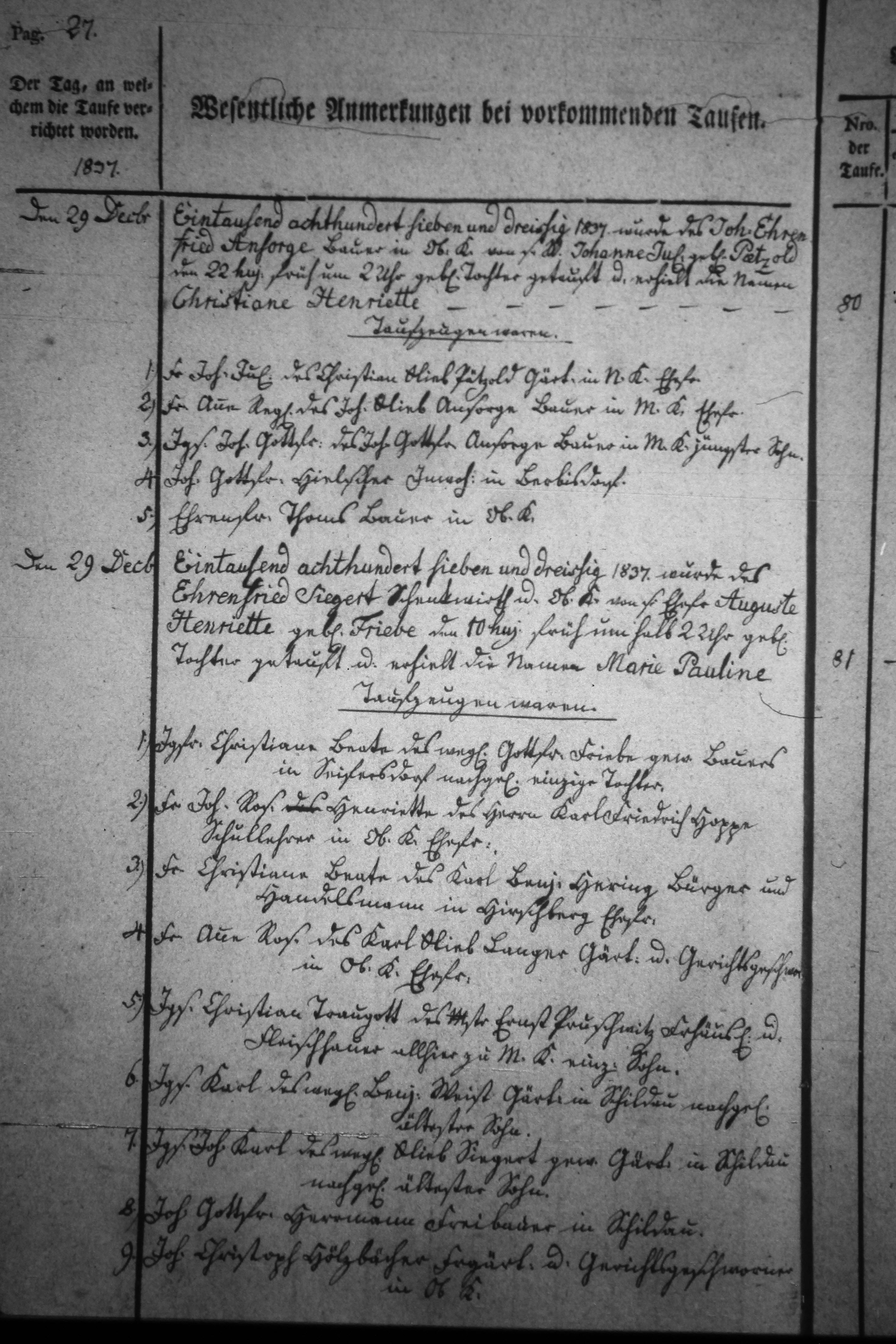 Text | Quellenscan: http://bilder.goldberg-haynau.de/Kauffung/Taufen/Taufen%201837-1839%20zweitesmal/IMG_5145.JPG http://bilder.goldberg-haynau.de/Kauffung/Taufen/Taufen%201837-1839/ersatzbilder/mom_1377.JPG [color=#FF0000]Quelle S708, [/color] Taufen Kauffung 1837-27 Pag 27 Nr. 80 den 29. Dezember 1837 Wurde des Johann Ehrenfried Ansorge, Bauer in Ober Kauffung, von seinem Weibe Johanne Juliane geborene Pätzold den 22. des Monats früh um 2:00 Uhr geborene Tochter getauft, und erhielt die Namen Christiane Henriette Taufzeugen waren: 1. Frau Johanne Juliane, des Christian Gottlieb Pätzold, Gärtner in Nieder Kauffung Ehefrau. 2. Frau Anne Regine, des Johann Gottlieb Ansorge, Bauer in Mittel Kauffung Ehefrau. 3. Junggesell Johann Gottfried, des Johann Gottfried Ansorge, Bauer in Mittel Kauffung jüngster Sohn. 4. Johann Gottfried Hielscher, Inwohner in Berbisdorf. 5. Ehrenfried Thoms, (Dohms?) Bauer in Ober Kauffung. Nr. 81 den 29. Dezember 1837 Wurde des Ehrenfried Siegert, Schenkwirth in Ober Kauffung, von seiner Ehefrau Auguste Henriette geborene Friebe, den 10. des Monats früh um 1:30 Uhr geborene Tochter getauft, und erhielt die Namen Marie Pauline Taufzeugen waren: 1. Jungfer Christiane Beate, des weiland Gottfried Friebe, gewesener Bauer in Seiffersdorf nachgelassener einzige Tochter. 2. Frau Johanne Rosine Henriette, des Herrn Karl Friedrich Hoppe, Schullehrer in Ober Kauffung Ehefrau. 3. Frau Christiane Beate, des Karl Benjamin Hering, Bürger und Handelsmann in Hirschberg Ehefrau. 4. Frau Anne Rosine, des Carl Gottlieb Langer, Gärtner und Gerichtsgeschworener in Ober Kauffung Ehefrau. 5. Junggesell Christian Traugott, des Meisters Ernst Pruschwitz, Freihäusler und Fleischhauer allhier zu Mittel Kauffung einziger Sohn. 6. Junggesell Karl, des weiland Benjamin Weist, Gärtner in Schildau nachgelassener ältester Sohn. 7. Junggesell Johann Karl, des weiland Gottlieb Siegert, gewesener Gärtner in Schildau nachgelassener ältester Sohn. 8. Johann Gottfried Herrmann, Freibauer in Schildau. 9. Johann Christoph Hölzbächer (Hölzbecher, Holzbecher), Freigärtner und Gerichtsgeschworener in Ober Kauffung. | |