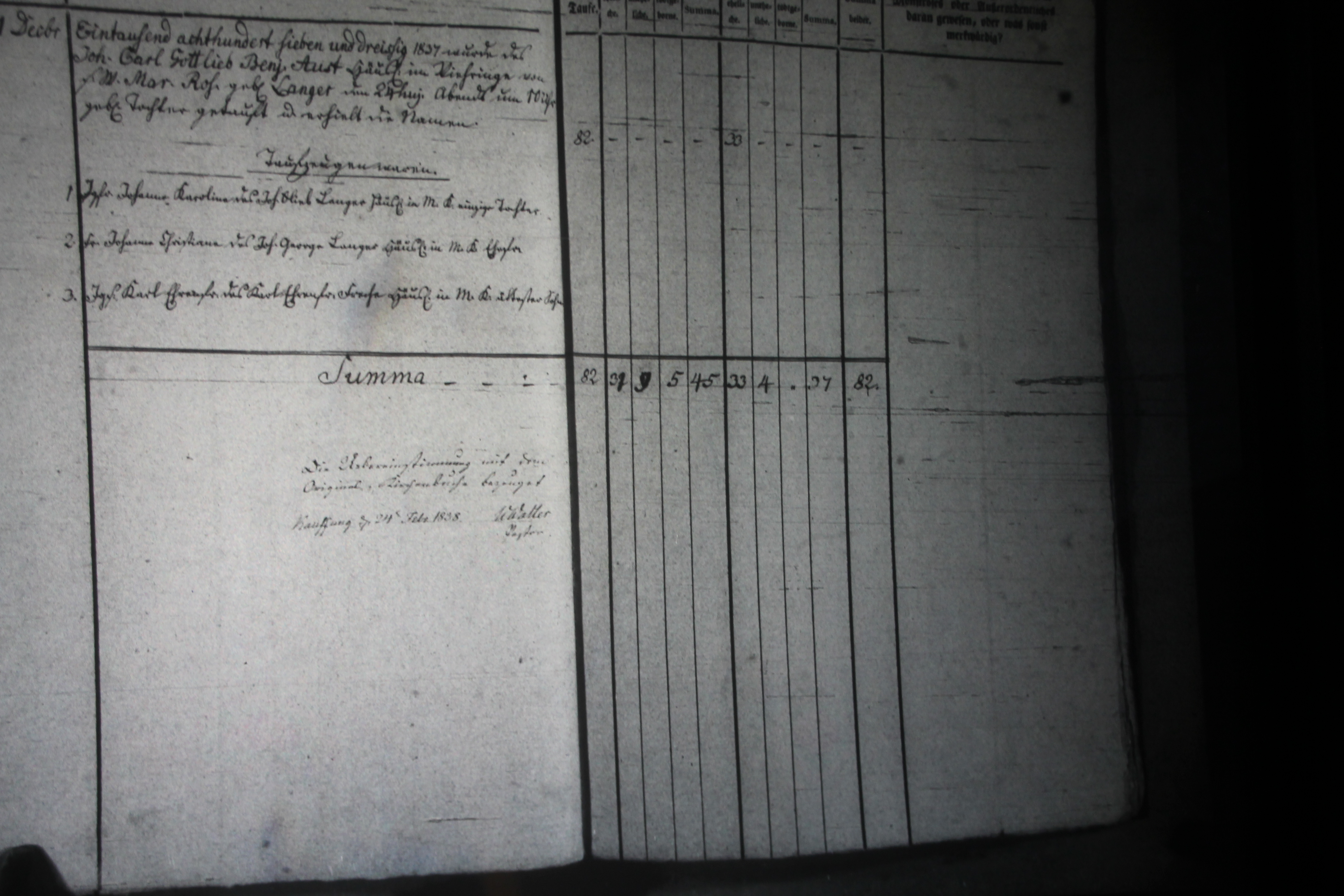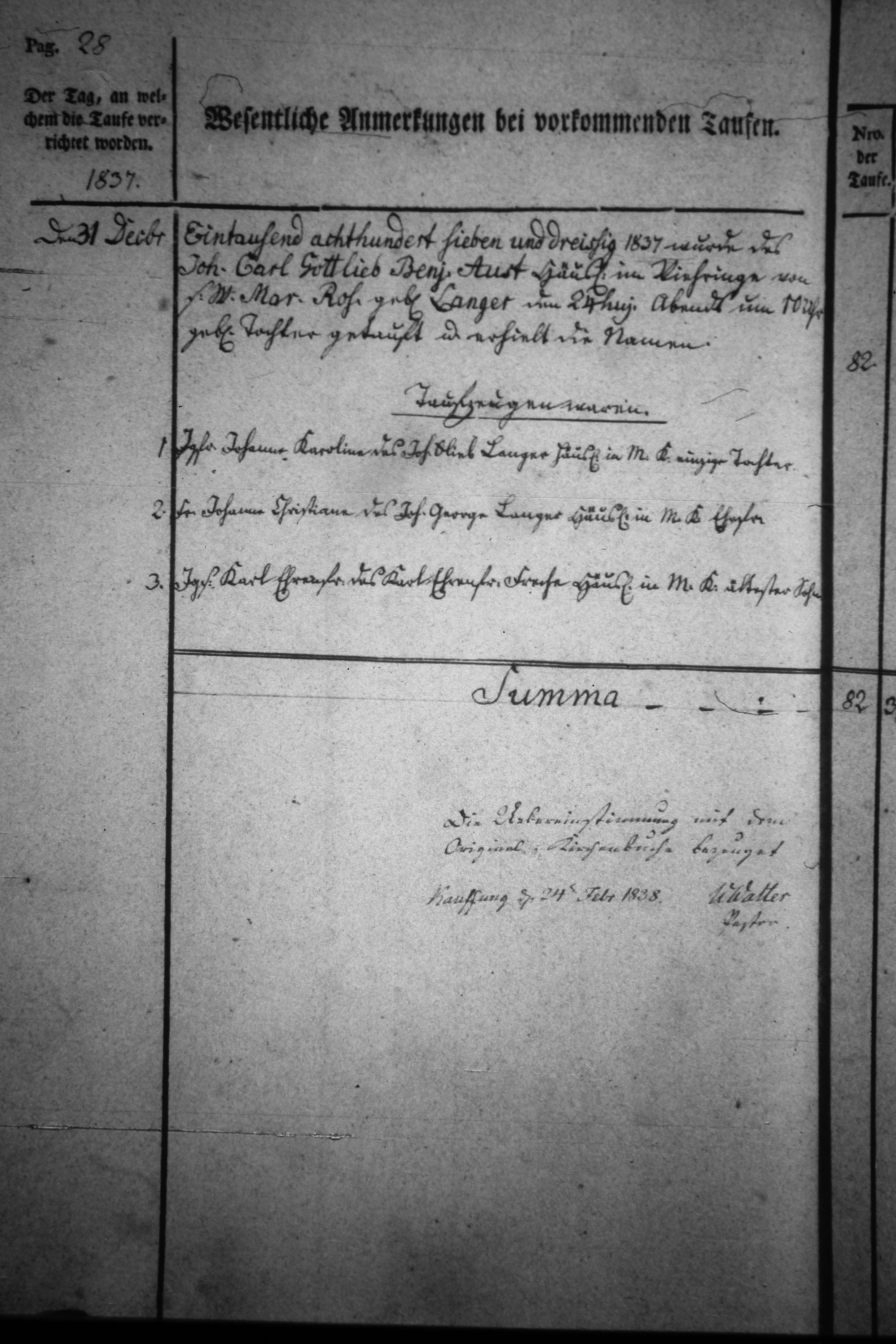 Text | Quellenscan: http://bilder.goldberg-haynau.de/Kauffung/Taufen/Taufen%201837-1839%20zweitesmal/IMG_5146.JPG http://bilder.goldberg-haynau.de/Kauffung/Taufen/Taufen%201837-1839/ersatzbilder/mom_1378.JPG [color=#FF0000]Quelle S709, [/color] Taufen Kauffung 1837-28 Pag 28 Nr. 82 den 31. Dezember 1837 Wurde des Johann Carl Gottlieb Benjamin Aust, Häusler in Viehring-Mittel Kauffung, von seinem Weibe Marie Rosine geborene Langer den 24. des Monats abends um 10:00 Uhr geborene Tochter getauft, und erhielt die Namen Taufzeugen waren: 1. Jungfer Johanne Karoline, des Johann Gottlieb Langer, Häusler in Mittel Kauffung einzige Tochter. 2. Frau Johanne Christiane, des Johann George Langer, Häusler in Mittel Kauffung Ehefrau. 3. Junggesell Karl Ehrenfried, des Karl Ehrenfried Freche, Häusler in Mittel Kauffung ältester Sohn. Anmerkung von Rainer Minnerop: bei diesem Eintrag fehlt der Name des getauften Kindes Ende 1837 | |