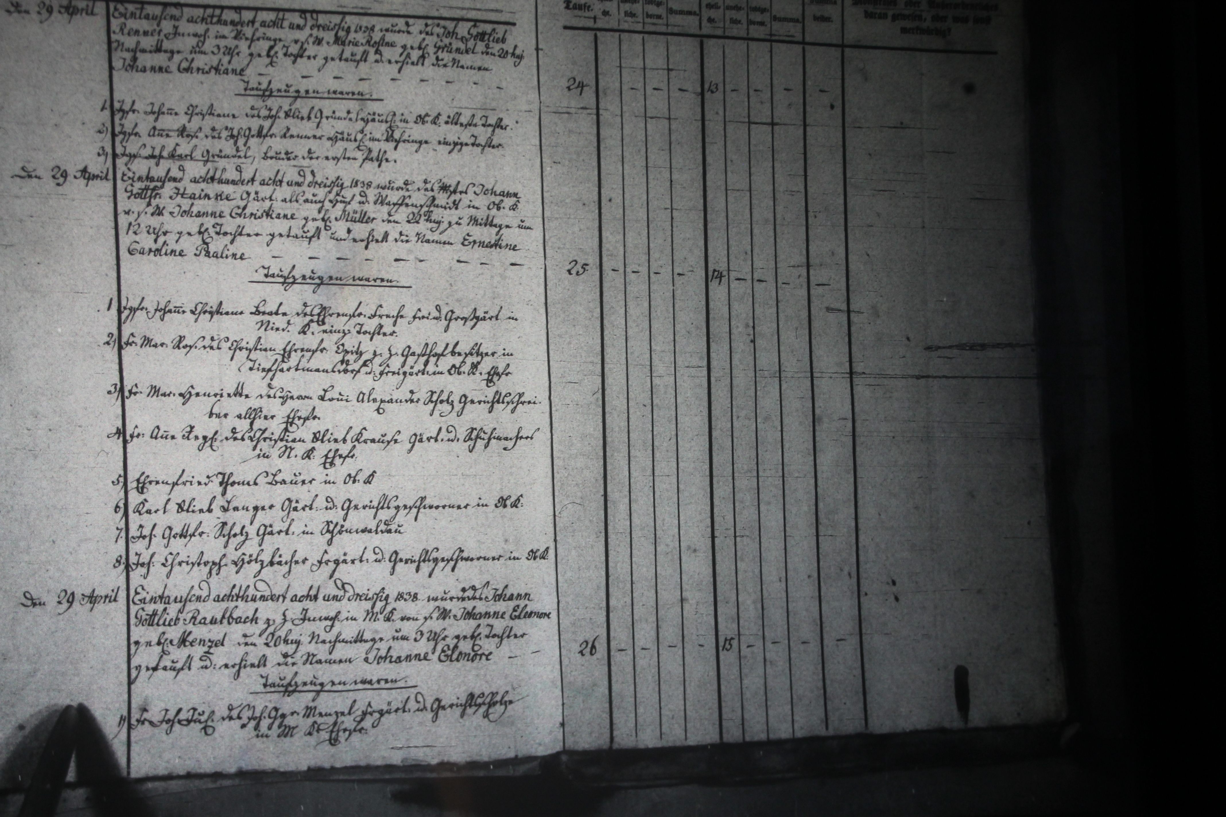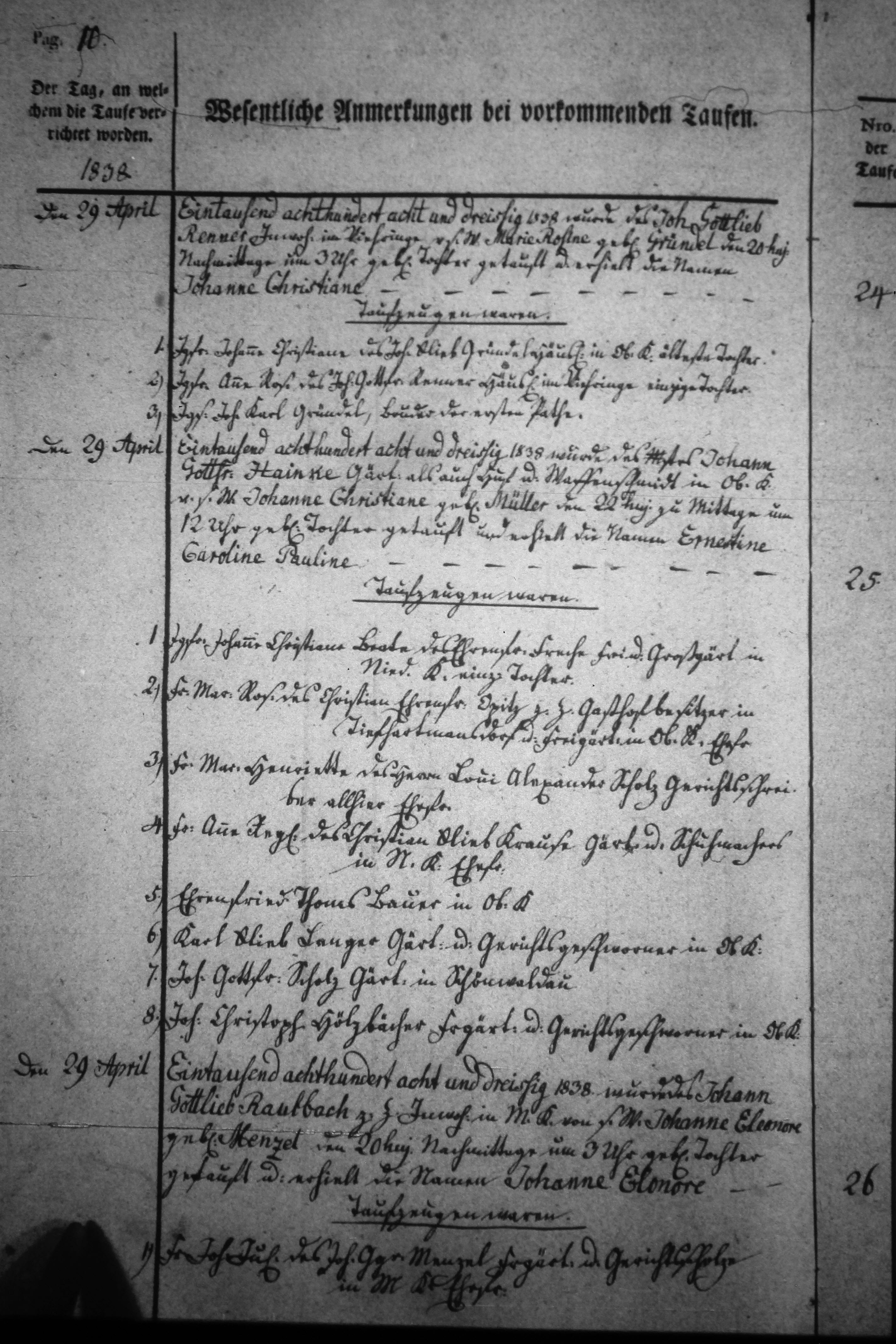 Text | Quellenscan: http://bilder.goldberg-haynau.de/Kauffung/Taufen/Taufen%201837-1839%20zweitesmal/IMG_5159.JPG http://bilder.goldberg-haynau.de/Kauffung/Taufen/Taufen%201837-1839/ersatzbilder/mom_1387.JPG [color=#FF0000]Quelle S710, [/color] Taufen Kauffung 1838-10 Pag 10 Nr. 24 den 29. April 1838 Wurde des Johann Gottlieb Renner, Inwohner in Viehring-Mittel Kauffung, von seinem Weibe Marie Rosine geborene Gründel den 20. des Monats nachmittags um 3:00 Uhr geborene Tochter getauft, und erhielt die Namen Johanne Christiane. Taufzeugen waren: 1. Jungfer Johanne Christiane, des Johann Gottlieb Gründel, Häusler in Ober Kauffung älteste Tochter. 2. Jungfer Anne Rosine, des Johann Gottfried Renner, Häusler in Viehring-Mittel Kauffung einzige Tochter. 3. Junggesell Johann Karl Gründel, Bruder der 1. Patin. Nr. 25 den 29. April 1838 Wurde des Meisters Johann Gottfried Hainke, Gärtner als auch Huf-und Waffenschmidt in Ober Kauffung, von seinem Weibe Johanne Christiane geborene Müller den 22. des Monats zu Mittag um 12:00 Uhr geborene Tochter getauft, und erhielt die Namen Ernestine Caroline Pauline. Taufzeugen waren: 1. Jungfer Johanne Christiane Beate, des Ehrenfried Freche, Frei- und Großgärtner in Nieder Kauffung einzige Tochter. 2. Frau Marianne Rosine, des Christian Ehrenfried Opitz, zur Zeit Gasthofbesitzer in Tiefhartmansdorf und Freigärtner in Ober Kauffung Ehefrau. 3. Frau Marie Henriette, des Herrn Loui Alexander Scholz, Gerichtsschreiber allhier Ehefrau. 4. Frau Anne Regine, des Christian Gottlieb Krause, Gärtner und Schumacher in Nieder Kauffung Ehefrau. 5. Ehrenfried Thoms, Bauer in Ober Kauffung. 6. Karl Gottlieb Langer, Gärtner und Gerichtsgeschworener in Ober Kauffung. 7. Johann Gottfried Scholz, Gärtner in Schönwald Dau. 8. Johann Christoph Hölzbächer (Hölzbecher), Freigärtner und Gerichtsgeschworener in Ober Kauffung. Nr. 26 den 29. April 1838 Wurde des Johann Gottlieb Raubbach, zur Zeit Inwohner in Mittel Kauffung, von seinem Weibe Johanne Eleonore geborene Menzel den 20. des Monats nachmittags um 3:00 Uhr geborene Tochter getauft, und erhielt die Namen Johanne Eleonore. Taufzeugen waren: 1. Frau Johanne Juliane, des Johann George Menzel, Freigärtner und Gerichtsgeschworener in Mittel Kauffung Ehefrau. (Fortsetzung nächste Seite) Pag 11 (Fortsetzung von Pag 10) 2. Frau Johanne Juliane, des Ehrenfried Langer, Bauer in Nieder Kauffung Ehefrau. 3. Johann Gottlieb Geisler, Häusler in Nieder Kauffung. | |