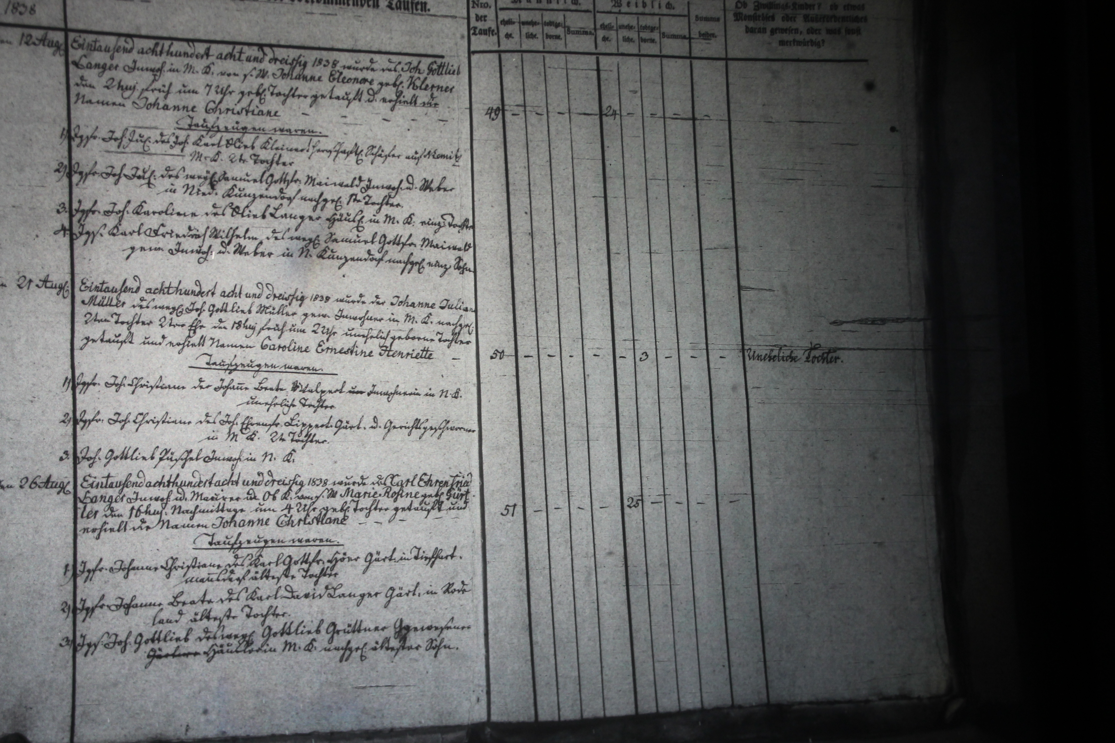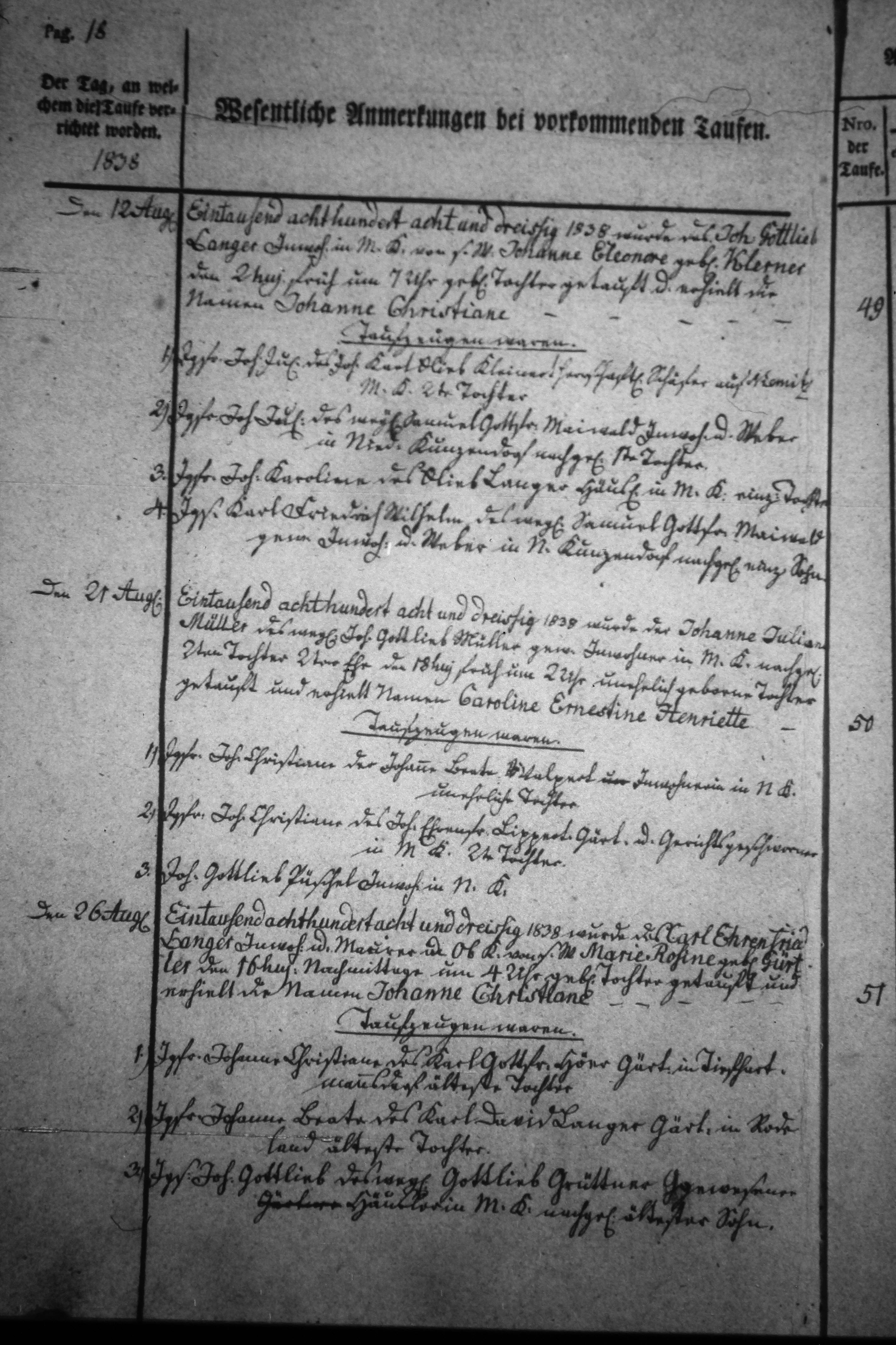 Text | Quellenscan: http://bilder.goldberg-haynau.de/Kauffung/Taufen/Taufen%201837-1839%20zweitesmal/IMG_5167.JPG http://bilder.goldberg-haynau.de/Kauffung/Taufen/Taufen%201837-1839/ersatzbilder/mom_1395.JPG [color=#FF0000]Quelle S726, [/color] Taufen Kauffung 1838-18 Pag 18 Nr. 49 den 12. August 1838 Wurde des Johann Gottlieb Langer, Inwohner in Mittel Kauffung, von seinem Weibe Johanne Eleonore geborene Klerner?, den 2. des Monats früh um 7 geborene Tochter getauft, und erhielt die Namen Johanne Christiane. Taufzeugen waren: 1. Jungfer Johanne Juliane, des Johann Karl Gottlieb Kleinert, herrschaftlicher Schäfer auf Niemitz-Mittel Kauffung 2. Tochter. 2. Jungfer Johanne Juliane, des weiland Samuel Gottfried Maiwald, Inwohner in Nieder Dorf nachgelassene 1. Tochter. 3. Jungfer Johanne Karoline, des Gottlieb Langer, Häusler in Mittel Kauffung einzige Tochter. 4. Junggesell Karl Friedrich Wilhelm, des weiland Samuel Gottfried Maiwald, gewesener Inwohner und Weber in Nieder Kunzendorf nachgelassener einziger Sohn. Nr. 50 den 21. August 1838 Wurde der Johanne Juliane Müller, des weiland Johann Gottlieb Müller, gewesener Inwohner in Mittel Kauffung nachgelassene 2. Tochter 2. Ehe, den 18. des Monats früh um 2 Uhr unehelich geborene Tochter getauft, und erhielt die Namen Caroline Ernestine Henriette. Taufzeugen waren: 1. Jungfer Johanne Christiane, der Johanne Beate Walpert, Inwohner in Nieder Kauffung uneheliche Tochter. 2. Jungfer Johanne Christiane, des Johann Ehrenfried Lippert, Gärtner und Gerichtsgeschworener in Mittel Kauffung 2. Tochter. 3. Johann Gottlieb Püschel, Inwohner in Nieder Kauffung. Nr. 51 den 26. August 1838 Wurde des Carl Ehrenfried Langer, Inwohner und Maurer in Ober Kauffung, von seinem Weibe Marie Rosine geborene Gürtler den 16. des Monats nachmittags um 4 Uhr geborene Tochter getauft, und erhielt die Namen Johanne Christiane. Taufzeugen waren: 1. Jungfer Johanne Christiane, des Karl Gottfried Hönr? (Höhner?), Gärtner in Tiefhartmansdorf älteste Tochter. 2. Jungfer Johanne Beate, des Karl David Langer, Gärtner in Kauffung-Rodeland älteste Tochter. 3. Junggesell Johann Gottlieb, des weiland Gottlieb Grüttner, gewesener Häusler in Mittel Kauffung nachgelassener ältester Sohn. | |