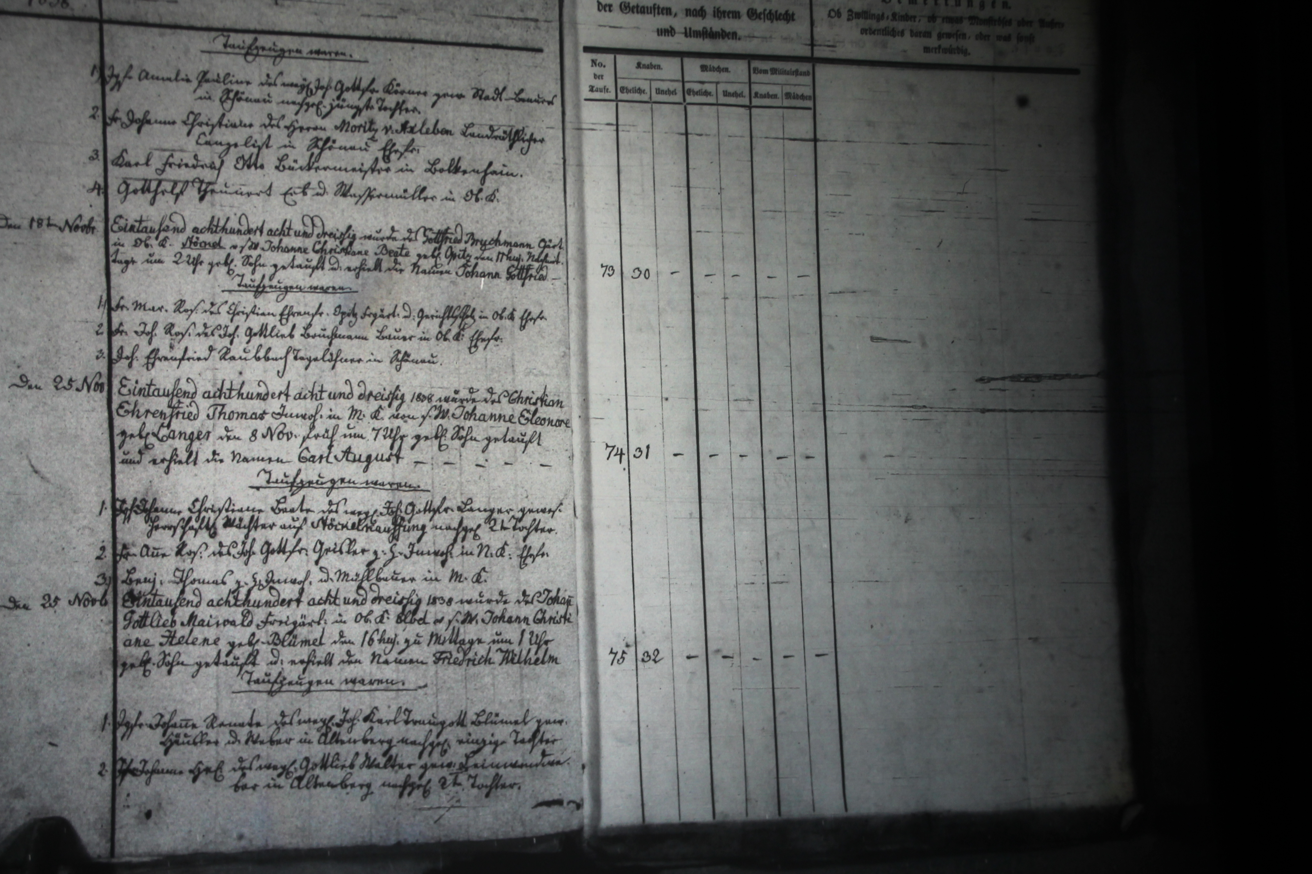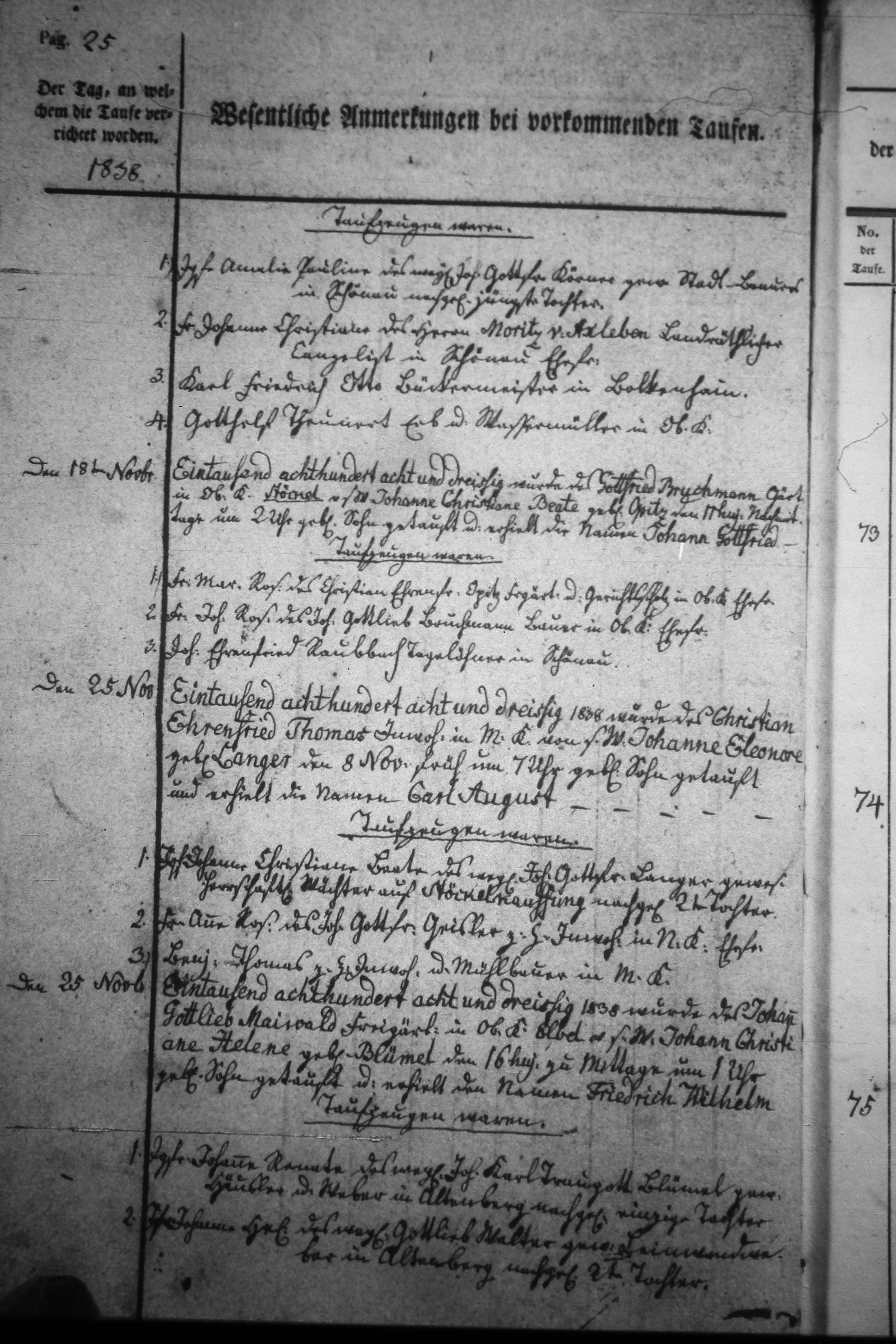 Text | Quellenschan: http://bilder.goldberg-haynau.de/Kauffung/Taufen/Taufen%201837-1839%20zweitesmal/IMG_5174.JPG http://bilder.goldberg-haynau.de/Kauffung/Taufen/Taufen%201837-1839/ersatzbilder/mom_1402.JPG [color=#FF0000]Quelle S733, [/color] Taufen Kauffung 1838-25 Pag 25 (Fortsetzung von Pag 24) Taufzeugen waren: 1. Jungfer Amalie Pauline, des weiland Johann Gottfried Körner, gewesener Stadt Brauer in Schönau nachgelassene jüngste Tochter. 2. Frau Johanne Christiane, des Herrn Moritz von Axleben, Landräthlicher Evangelist? In Schönau Ehefrau. 3. Karl Friedrich Otto, Bäckermeister in Bolkenhain. 4. Gotthelf Theunert, Erb-und Wassermüller in Ober Kauffung. Nr. 73 den 18. November 1838 Wurde des Gottfried Bruchmann, Gärtner in Ober Kauffung-Stöckel, von seinem Weibe Johanne Christiane Beate geborene Opitz den 11. November 1838 nachmittags um 2 Uhr geborene Sohn getauft, und erhielt die Namen Johann Gottfried. Taufzeugen waren: 1. Frau Maria Rosine, des Christian Ehrenfried Opitz, Freigärtner und Gerichtsscholz in Ober Kauffung Ehefrau. 2. Frau Johanne Rosine, des Johann Gottlieb Bruchmann, Bauer in Ober Kauffung Ehefrau. 3. Johann Ehrenfried Raubbach, Tagelöhner in Schönau. Nr. 74 den 25. November 1838 Wurde des Christian Ehrenfried Thomas, Inwohner in Mittel Kauffung, von seinem Weibe Johanne Eleonore geborene Langer den 8. November früh um 7 Uhr geborene Sohn getauft, und erhielt die Namen Carl August. Taufzeugen waren: 1. Jungfer Johanne Christiane Beate, des weiland Johann Gottfried Langer, gewesener herrschaftlicher Wächter auf Stöckel-Kauffung nachgelassene 2. Tochter. 2. Frau Anne Rosine, des Johann Gottfried Geisler, zur Zeit Inwohner in Nieder Kauffung Ehefrau. 3. Benjamin Thomas, zur Zeit Inwohner und Mühlbauer in Mittel Kauffung. Nr. 75 den 25. November 1838 wurde des Johann Gottlieb Maiwald, Freigärtner in Ober Kauffung-Elbel, von seinem Weibe Johanne Christiane Helene geborene Blümel den 16. des Monats zu Mittage um ein Uhr geborene Sohn getauft, und erhielt die Namen Friedrich Wilhelm. Taufzeugen waren: 1. Jungfer Johanne Renate, des weiland Johann Karl Traugott Blümel, gewesener Häusler und Weber in Altenberg nachgelassene einzige Tochter. 2. Jungfer Johanne Helene, des weiland Gottlieb Walter, gewesener Leinwand Weber in Altenberg nachgelassene 2. Tochter. (Fortsetzung nächste Seite) Pag 26 (Fortsetzung vom Pag 25) 2. Wilhelm Blümel, Häusler und Kramer in Ober Kauffung. 3. Johann Gottlieb Scharf, Freistellenbesitzer in Altenberg. | |