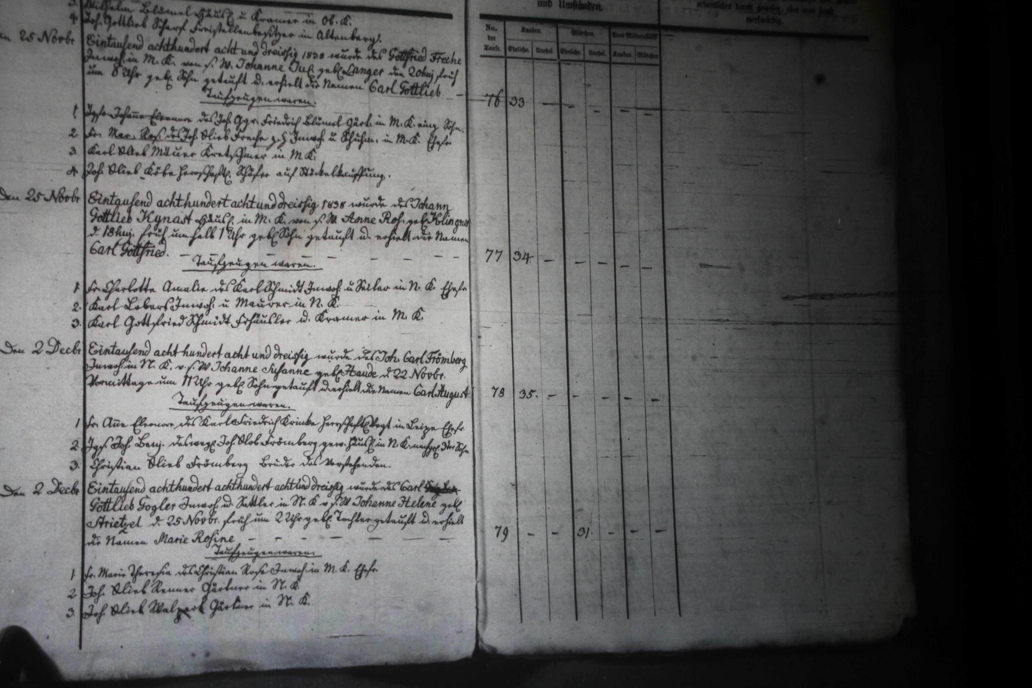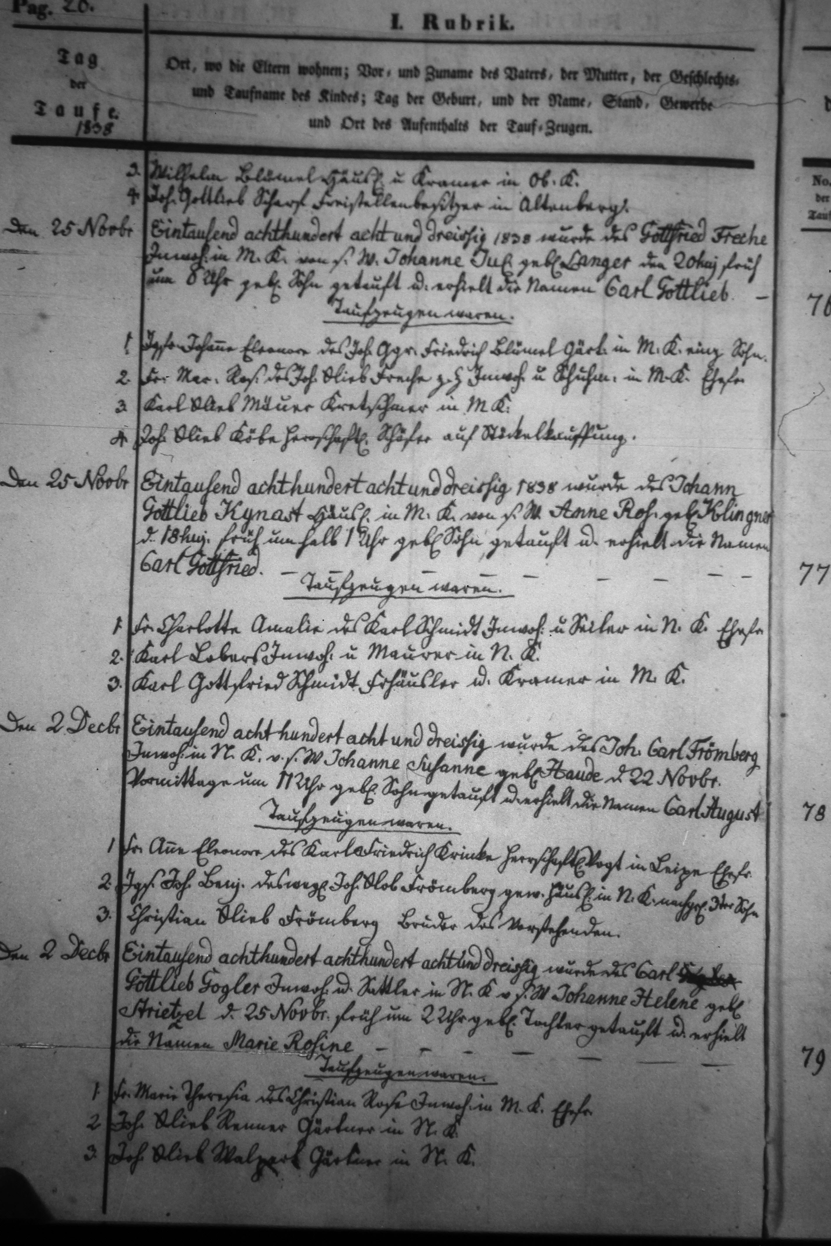 Text | Quellenscan: http://bilder.goldberg-haynau.de/Kauffung/Taufen/Taufen%201837-1839%20zweitesmal/IMG_5175.JPG http://bilder.goldberg-haynau.de/Kauffung/Taufen/Taufen%201837-1839/ersatzbilder/mom_1403.JPG [color=#FF0000]Quelle S734, [/color] Taufen Kauffung 1838-26 Pag 26 (Fortsetzung vom Pag 25) 2. Wilhelm Blümel, Häusler und Kramer in Ober Kauffung. 3. Johann Gottlieb Scharf, Freistellenbesitzer in Altenberg. Nr. 76 den 25. November 1838 Wurde des Gottfried Freche, Inwohner in Mittel Kauffung, von seinem Weibe Johanne Juliane geborene Langer den 20. des Monats früh um 8 Uhr geborene Sohn getauft, und erhielt die Namen Carl Gottlieb. Taufzeugen waren: 1. Jungfer Johanne Eleonore, des Johann George Friedrich Blümel, Gärtner in Mittel Kauffung einziger Sohn? (Schreibfehler im Kirchenbuch?). 2. Frau Maria Rosine, des Johann Gottlieb Freche, zur Zeit Inwohner und Schumacher in Mittel Kauffung Ehefrau. 3. Karl Gottlieb Mäuer (Meuer), Kretschmer in Mittel Kauffung. 4. Johann Gottlieb Köbe, herrschaftlicher Schäfer auf Stöckel-Kauffung. Nr. 77 den 25. November 1838 Wurde des Johann Gottlieb Künast,(Kynast) Häusler in Mittel Kauffung, von seinem Weibe Anne Rosine geborene Klingner den 18. des Monats früh um halb ein Uhr geborene Sohn getauft, und erhielt die Namen Carl Gottfried. Taufzeugen waren: 1. Frau Charlotte Amalie, des Karl Schmidt, Inwohner und Seiler in Nieder Kauffung Ehefrau. 2. Karl Lober(s), Inwohner und Maurer in Nieder Kauffung. 3. Karl Gottfried Schmidt, Freihäusler und Kramer in Mittel Kauffung. Nr. 78 den 2. Dezember 1838 wurde des Johann Carl Frömberg, Inwohner in Nieder Kauffung, von seinem Weibe Johanne Susanne geborene Haude den 22. November vormittags um 11 Uhr geborene Sohn getauft, und erhielt die Namen Carl August. Taufzeugen waren: 1. Frau Anne Eleonore, des Karl Friedrich Krinke, herrschaftlicher Vogt in Leipe Ehefrau. 2. Junggesell Johann Benjamin, des weiland Johann Gottlob Frömberg, gewesener Häusler in Nieder Kauffung nachgelassener 3. Sohn. 3. Christian Gottlieb Frömberg, Bruder des vorstehenden. Nr. 79 den 2. Dezember 1838 Wurde des Carl Gottlieb Gogler, Inwohner und Sattler in Nieder Kauffung, von seinem Weibe Johanne Helene geborene Strietzel den 25. November früh um 2 Uhr geborene Tochter getauft, und erhielt die Namen Marie Rosine. Taufzeugen waren: 1. Frau Maria Theresia, des Christian Rose, Inwohner in Mittel Kauffung Ehefrau. 2. Johann Gottlieb Renner, Gärtner in Nieder Kauffung. 3. Johann Gottlieb Walpert, Gärtner in Nieder Kauffung. | |