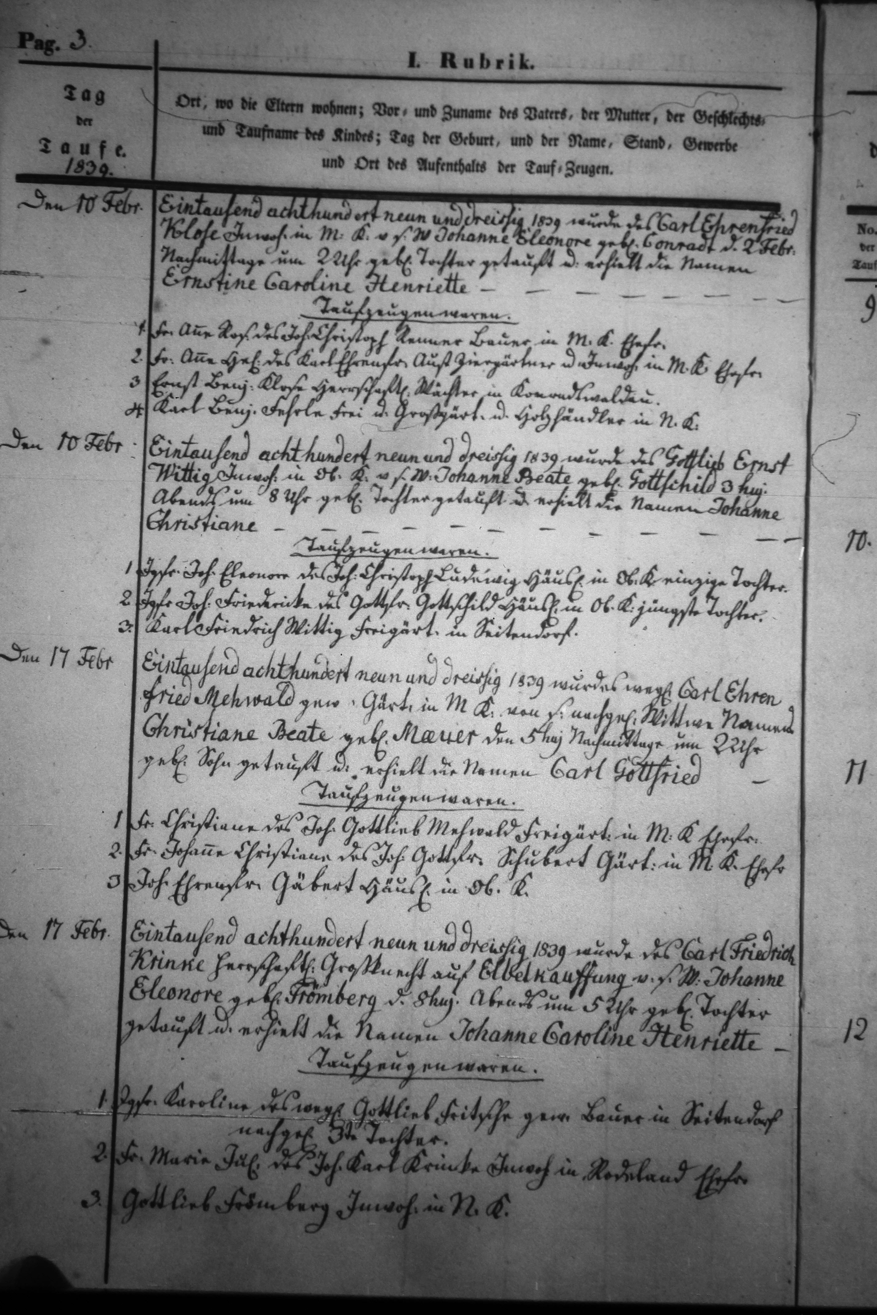 | Text | Quellenscan: http://bilder.goldberg-haynau.de/Kauffung/Taufen/Taufen%201837-1839%20zweitesmal/IMG_5184.JPG http://bilder.goldberg-haynau.de/Kauffung/Taufen/Taufen%201837-1839/ersatzbilder/mom_1408.JPG [color=#FF0000]Quelle S739, [/color] Taufen Kauffung 1839-03 Pag 3 Nr. 9 den 10. Februar 1839 Wurde des Carl Ehrenfried Klose, Inwohner in Mittel Kauffung, von seinem Weibe Johanne Eleonore geborene Conradt (Konrad), den 2. Februar nachmittags um 2 Uhr geborene Tochter getauft, und erhielt die Namen Ernestine Caroline Henriette. Taufzeugen waren: 1. Frau Anne Rosine, des Johann Christoph Renner, Bauer in Mittel Kauffung Ehefrau. 2. Frau Anne Helene, des Karl Ehrenfried Aust, Ziergärtner und Inwohner in Mittel Kauffung Ehefrau. 3. Ernst Benjamin Klose, herrschaftlicher Wächter in Konradswaldau. 4. Carl Benjamin Fehrle, Frei- und Großgärtner und Holzhändler in Nieder Kauffung. Nr. 10 den 10. Februar 1839 Wurde des Gottlieb Ernst Wittig, Inwohner in Ober Kauffung, von seinem Weibe Johanne Beate geborene Gottschild,den 3 Feb abends um 8 Uhr geborene Tochter getauft, und erhielt die Namen Johanne Christiane. Taufzeugen waren: 1. Jungfer Johanne Eleonore, des Johann Christoph Ludewig, Häusler in Ober Kauffung einzige Tochter. 2. Jungfer Johanne Friedericke, des Gottfried Gottschild, Häusler in Ober Kauffung jüngste Tochter. 3. Karl Friedrich Wittig, Freigärtner in Seitendorf. Nr. 11 den 17. Februar 1839 Wurde des weiland Karl Ehrenfried Mehwald, gewesener Gärtner in Mittel Kauffung, von seiner nachgelassenen Witwe namens Christiane Beate geborene Mäuer (Meuer), den 5. des Monats nachmittags um 2 Uhr geborene Sohn getauft, und erhielt die Namen Carl Gottfried. Taufzeugen waren: 1. Frau Christiane, des Johann Gottlieb Mehwald, Freigärtner in Mittel Kauffung Ehefrau. 2. Frau Johanne Christiane, des Johann Gottfried Schubert, Gärtner in Mittel Kauffung Ehefrau. 3. Johann Ehrenfried Gäbert (Gebert), Häusler in Ober Kauffung. Nr. 12 den 17. Februar 1839 wurde des Karl Friedrich Krinke, herrschaftlicher Großknecht auf Elbel-Kauffung, von seinem Weibe Johanne Eleonore geborene Frömberg den 8. des Monats abends um 5 Uhr geborene Tochter getauft, und erhielt die Namen Johanne Caroline Henriette. Taufzeugen waren: 1. Jungfer Karoline, des weiland Gottlieb Fritsche, gewesener Bauer in Seitendorf nachgelassene 3. Tochter. 2. Frau Maria Juliane, des Johann Karl Krinke, Inwohner in Kauffung-Rodeland Ehefrau. 3. Gottlieb Frömberg, Inwohner in Nieder Kauffung. | |