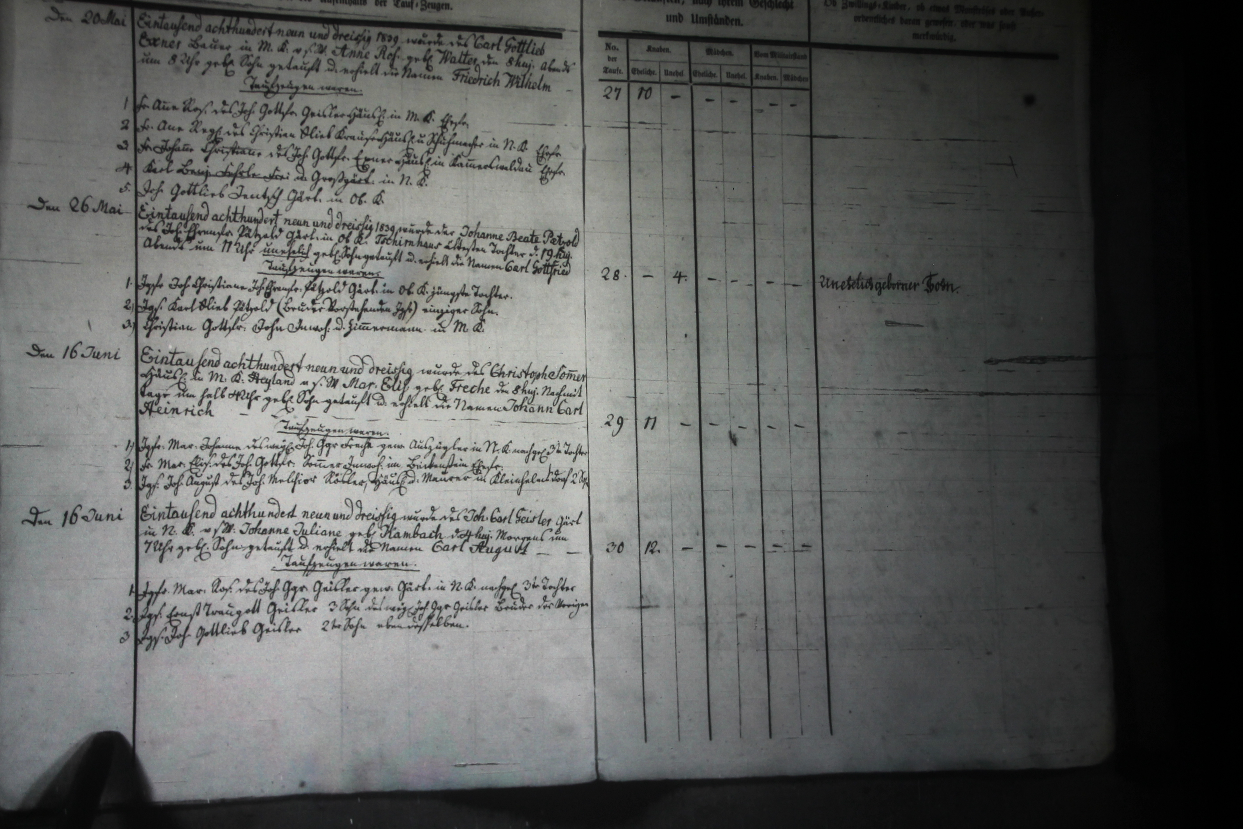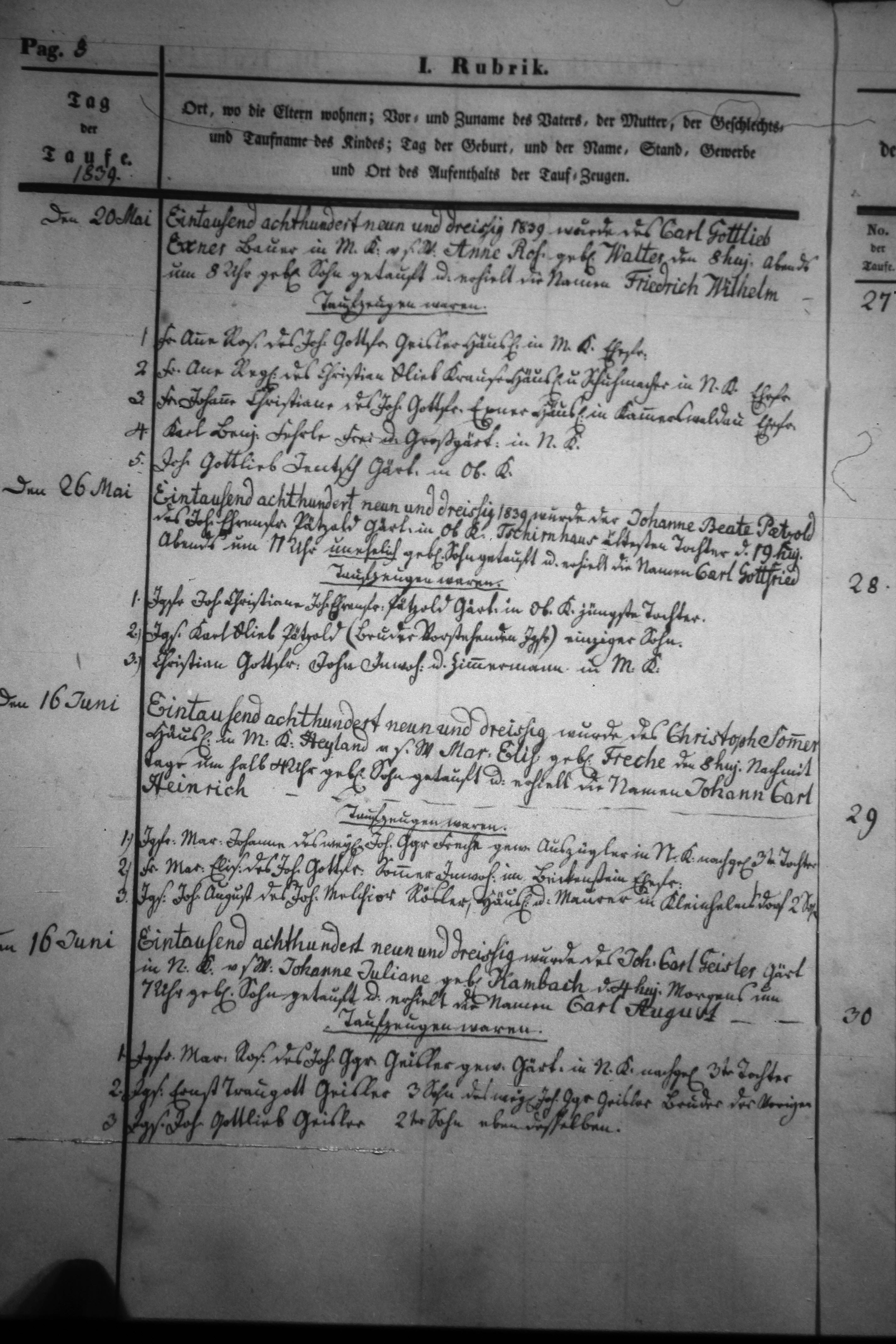 Text | Quellenscan: http://bilder.goldberg-haynau.de/Kauffung/Taufen/Taufen%201837-1839%20zweitesmal/IMG_5189.JPG http://bilder.goldberg-haynau.de/Kauffung/Taufen/Taufen%201837-1839/ersatzbilder/mom_1413.JPG [color=#FF0040]Quelle: S744, [/color] Taufen Kauffung 1839-08 Pag 8 Nr. 27 den 20. Mai 1839 Wurde des Carl Gottlieb Exner, Bauer in Mittel Kauffung, von seinem Weibe Anne Rosine geborene Walter den 8. des Monats abends um 8 Uhr geborene Sohn getauft, und erhielt die Namen Friedrich Wilhelm. Taufzeugen waren: 1. Frau Anne Rosine, des Johann Gottfried Geisler, Häusler in Mittel Kauffung Ehefrau. 2. Frau Anne Regine, des Christian Gottlieb Krause, Häusler und Schumacher in Nieder Kauffung Ehefrau. 3. Frau Johanne Christiane, des Johann Gottfried Exner, Häusler in Kammerswaldau Ehefrau. 4. Karl Benjamin Fehrle, Frei- und Großgärtner in Nieder Kauffung. 5. Johann Gottlieb Jentsch, Gärtner in Ober Kauffung. Nr. 28 den 26. Mai 1839 Wurde der Johanne Beate Pätzold, des Johann Ehrenfried Pätzold, Gärtner in Ober Kauffung-Tschirnhaus ältesten Tochter den 19. des Monats abends um 11 Uhr unehelich geborene Sohn getauft, und erhielt die Namen Carl Gottfried. Taufzeugen waren: 1. Jungfer Johanne Christiane, des Johann Ehrenfried Pätzold, Gärtner in Ober Kauffung jüngste Tochter. 2. Junggesell Karl Gottlieb Pätzold, (Bruder vorstehender Jungfer) einziger Sohn. 3. Christian Gottfried John, Inwohner und Zimmermann in Mittel Kauffung. Nr. 29 den 16. Juni 1839 Des Christoph Sommer, Häusler in Mittel Kauffung-Heiland, von seinem Weibe Marie Elisabeth geborene Freche, den 8. des Monats nachmittags um halb 4 Uhr geborene Sohn getauft, und erhielt die Namen Johann Carl Heinrich. Taufzeugen waren: 1. Jungfer Maria Johanne, des weiland Johann George Freche, gewesener Auszügler in Nieder Kauffung nachgelassene 3. Tochter. 2. Frau Maria Elisabeth, des Johann Gottfried Sommer, Inwohner in Beckenstein? Ehefrau. 3. Junggesell Johann August, des Johann Melchior Rösler, Häusler und Maurer in Kleinhelmsdorf 2. Sohn. Nr. 30 den 16. Juni 1839 Wurde des Johann Carl Geisler, Gärtner in Nieder Kauffung, von seinem Weibe Johanne Juliane geborene Kambach den 4. des Monats morgens um 7 Uhr geborene Sohn getauft, und erhielt die Namen Carl August. Taufzeugen waren: 1. Jungfer Marie Rosine, des Johann George Geisler, gewesener Gärtner in Nieder Kauffung nachgelassene 3. Tochter. 2. Junggesell Ernst Traugott Geisler, 3. Sohn des weiland Johann George Geisler, Bruder der vorigen. 3. Junggesell Johann Gottlieb Geisler, 2. Sohn eben desselben. | |