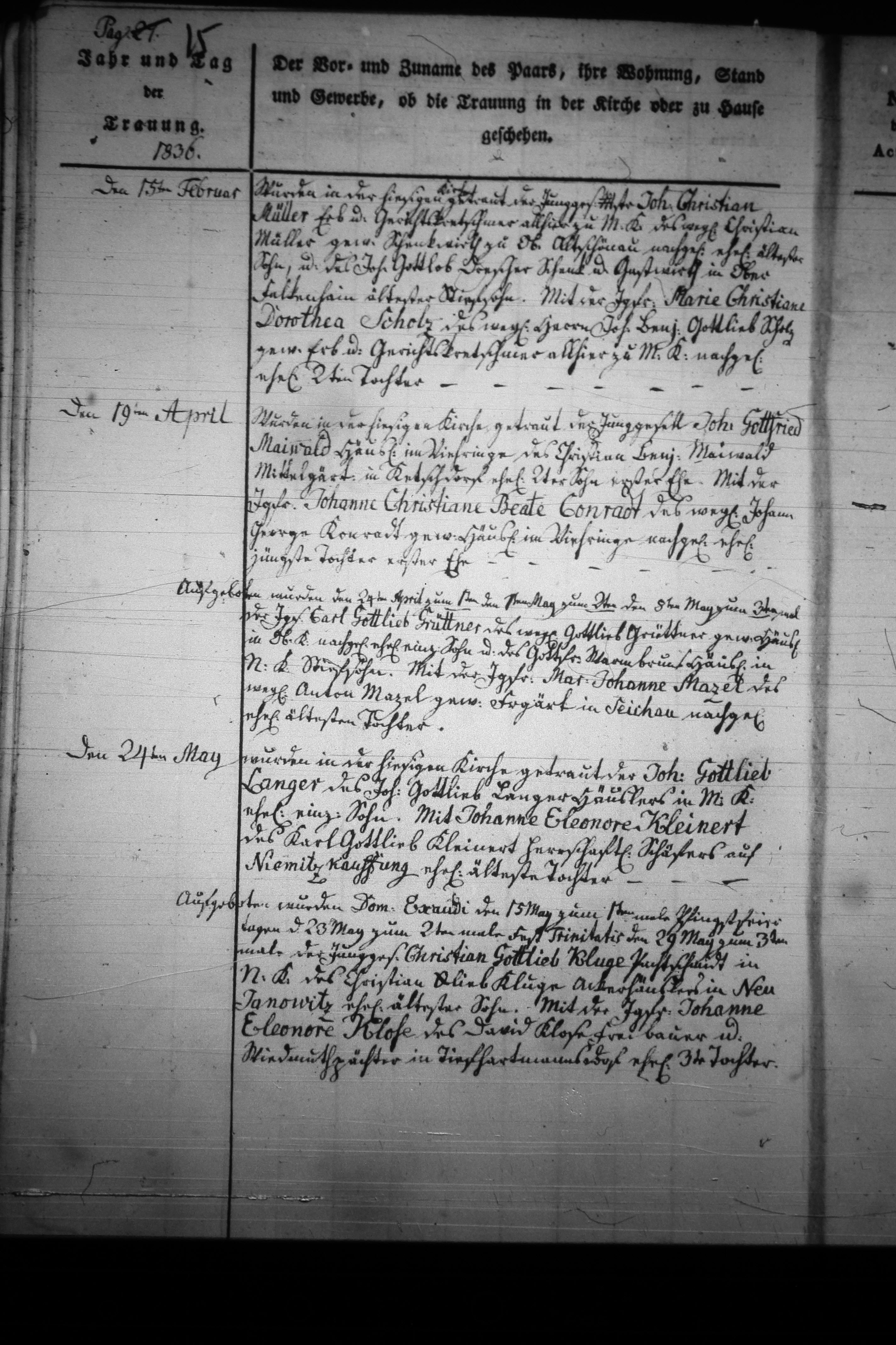 Text | Quellenscan: http://bilder.goldberg-haynau.de/Kauffung/Eheschliessungen/Ehen%201836/mom_1191.JPG http://bilder.goldberg-haynau.de/Kauffung/Eheschliessungen/Ehen%201836/mom_1192.JPG Ehen Kauffung 1836 [color=#FF0000]Quelle SE109, [/color] Pag 15 Nr. 5 den 15. Februar 1836 wurden in der hiesigen Kirche getraut der Junggesell Meister Johann Christian Müller, Erb-und Gerichts Kretschmer allhier zu Mittel Kauffung, des weiland Christian Müller, gewesener Schenkwirth zu Ober Altschönau nachgelassener ehelicher ältester Sohn, und des Johann Gottlob Drescher, Schenk-und Gastwirt Ober Falkenhain ältester Stiefsohn. Mit der Jungfer Marie Christiane Dorothea Scholz, des weiland Herrn Johann Benjamin Gottlieb Scholz, gewesener Erb-und Gerichts Kretschmer allhier zu Mittel Kauffung nachgelassene eheliche 2. Tochter. Der Bräutigam war 27 Jahre, die Braut 38 Jahre alt. Nr 6 den 19. April 1836 Wurden in der hiesigen Kirche getraut der Junggesell Johann Gottfried Maiwald, Häusler in Viehring (Mittel Kauffung), des Christian Benjamin Maiwald, Mittelgärtner in Ketschdorf ehelicher 2. Sohn 1. Ehe. Mit der Jungfer Johanne Christiane Beate Conrad, des weiland Johann George Konradt, gewesener Häusler in Viehring (Mittel Kauffung) nachgelassene eheliche jüngste Tochter 1. Ehe. Der Bräutigam war 27 Jahre, die Braut 22 ein halb Jahre alt. aufgeboten: Wurden den 24. April zum 1., den 1. Mai zum 2., den 8. Mai zum 3. Mal der Junggesell Carl Gottlieb Grüttner, des weiland Gottlieb Grüttner, gewesener Häusler in Ober Kauffung nachgelassener ehelicher einziger Sohn, und des Gottfried Warmbrunn, Häusler in Nieder Kauffung Stiefsohn. Mit der Jungfer Maria Johanne Mazel, des weiland Anton Mazel, gewesener Freigärtner in Seichau nachgelassene eheliche älteste Tochter. Nr. 7 den 24. Mai 1836 Wurden in der hiesigen Kirche getraut der Johann Gottlieb Langer, des Johann Gottlieb Langer, Häusler in Mittel Kauffung ehelicher einziger Sohn. Mit Johanne Eleonore Kleinert, des Karl Gottlieb Kleinert, herrschaftlicher Schäfer auf Niemitz-Kauffung eheliche älteste Tochter. Der Bräutigam war 29 Jahre, die Braut 27 Jahre alt. Aufgeboten: Wurden Domini Exaudi den 15. Mai zum 1. Male, Pfingstfeiertage den 23. Mai zum 2. Male, Fest Trinitates den 29. Mai zum 3. Male der Junggesell Christian Gottlieb Kluge, Pachtschmied in Nieder Kauffung, des Christian Gottlieb Kluge, Ackeräusler in Neu Jänowitz ehelicher ältester Sohn. mit der Jungfer Johanne Eleonore Klose, des David Klose, Freibauer und Wiedmuthspächer in Tiefhartmansdorf eheliche 3. Tochter. | |