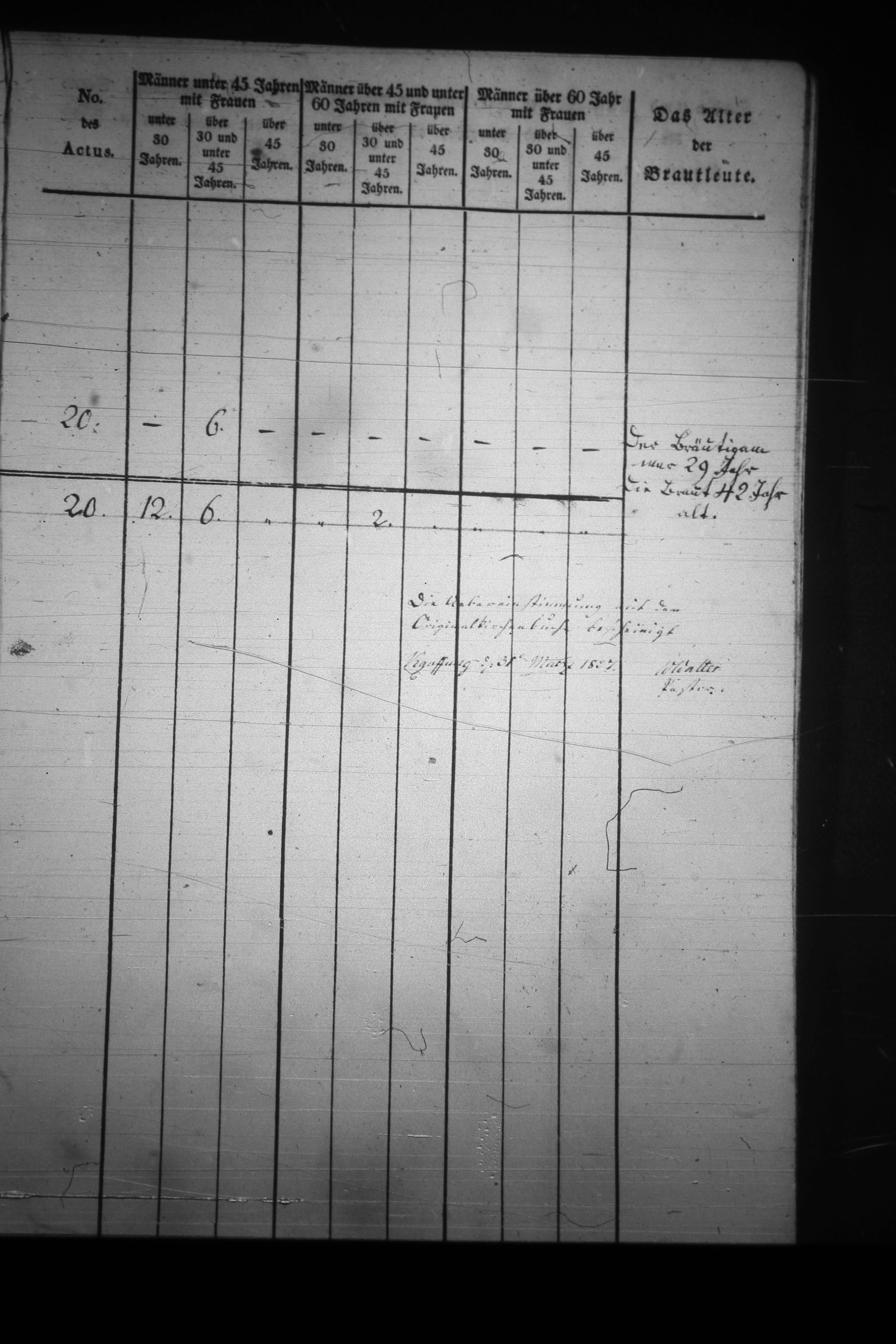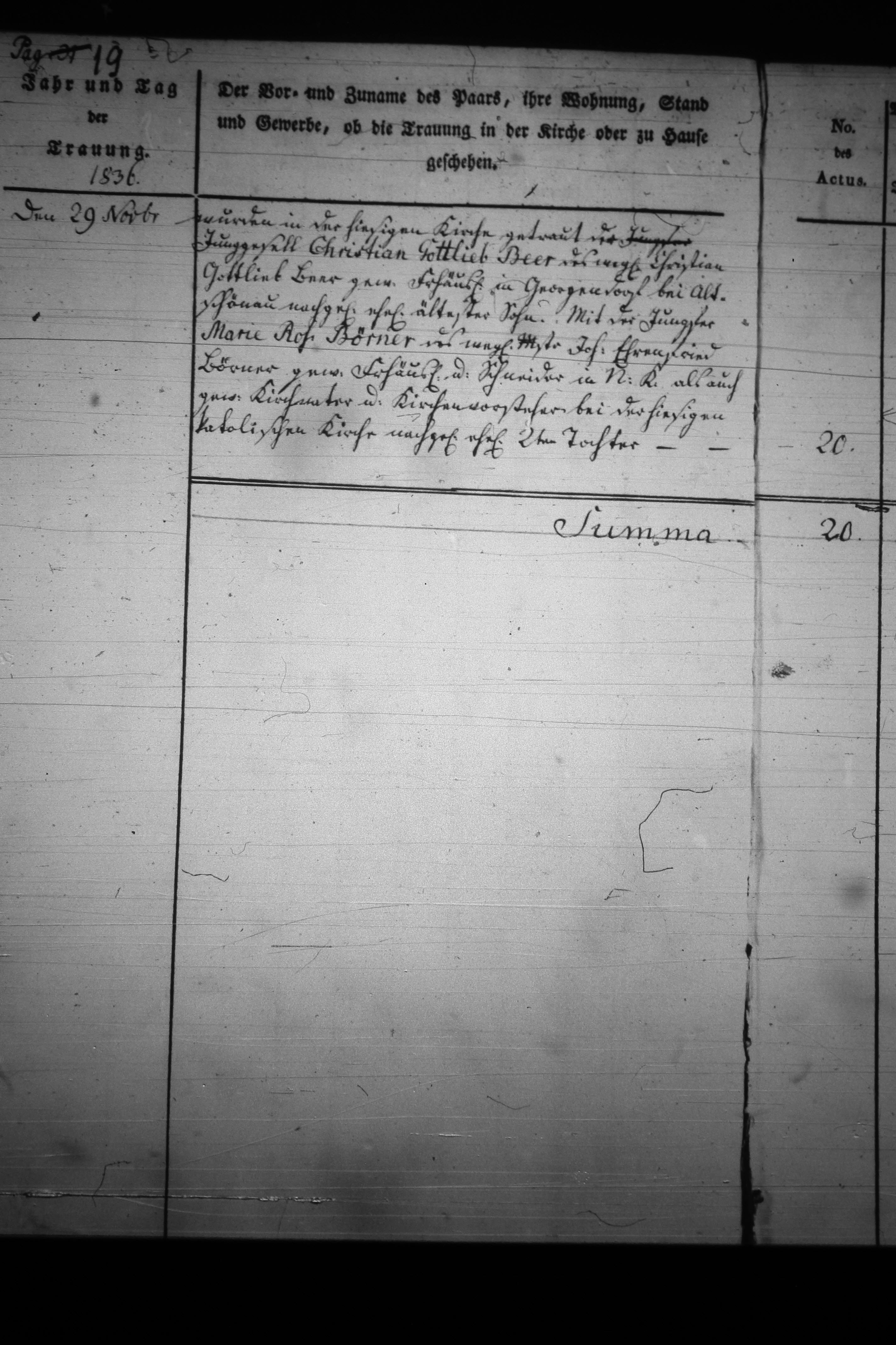 Text | Quellenscan: http://bilder.goldberg-haynau.de/Kauffung/Eheschliessungen/Ehen%201836/mom_1199.JPG http://bilder.goldberg-haynau.de/Kauffung/Eheschliessungen/Ehen%201836/mom_1200.JPG [color=#FF0000]Quelle SE113, [/color] Ehen Kauffung 1836 Pag 19 Nr.20 den 29. November 1836 wurden in der hiesigen Kirche getraut der Junggesell Christian Gottlieb Beer, des weiland Christian Gottlieb Beer, gewesener Freihäusler in Georgendorf bei Altschönau nachgelassener ehelicher ältester Sohn. Mit der Jungfer Marie Rosine Börner, des weiland Meister Johann Ehrenfried Börner, gewesener Freihäusler und Schneider in Nieder Kauffung, als auch gewesener Kirchvater und Kirchenvorsteher bei der hiesigen katholischen Kirche nachgelassene eheliche 2. Tochter. Ende 1836 | |