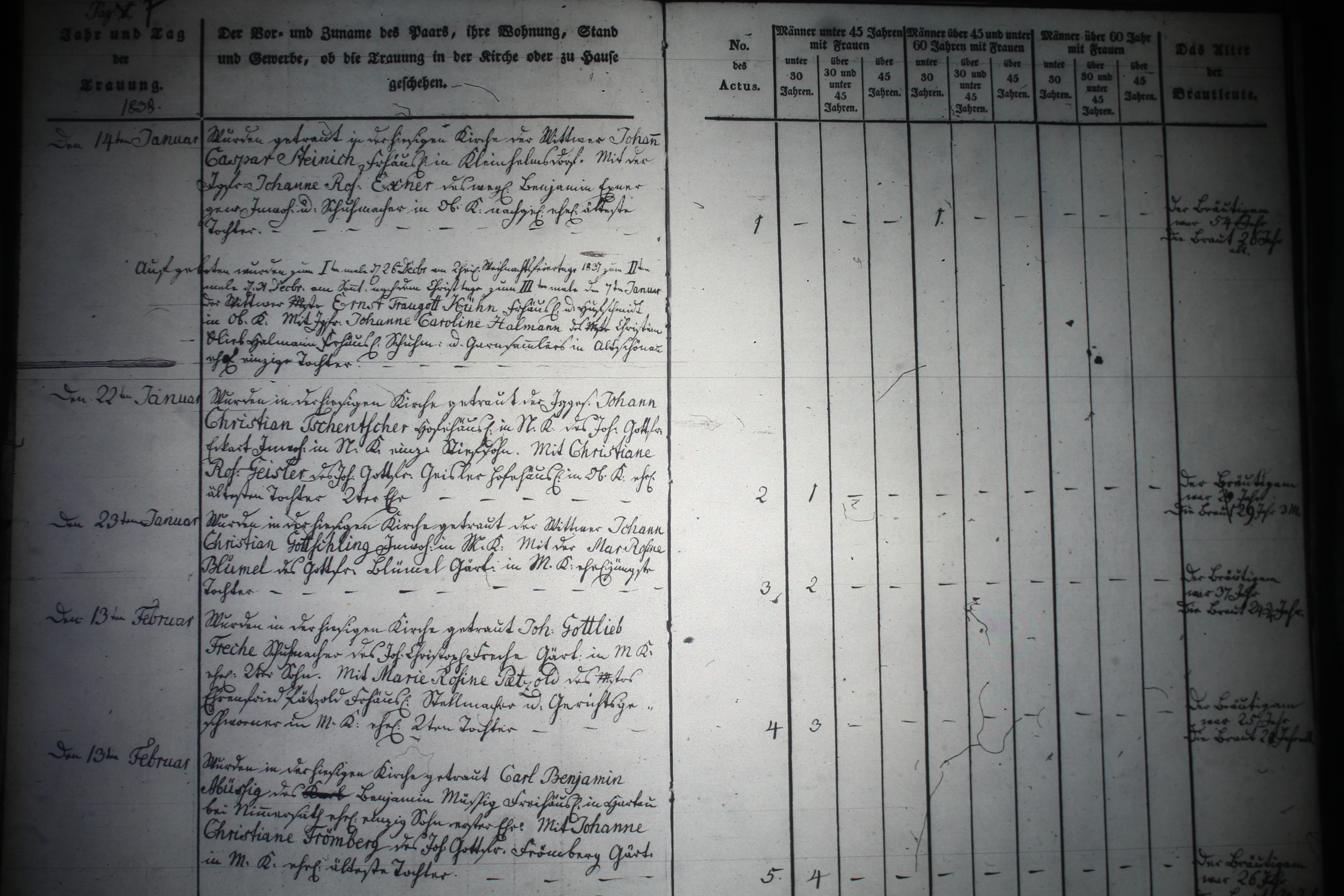 Text | Quellenscan: http://bilder.goldberg-haynau.de/Kauffung/Eheschliessungen/Ehen%201837-1841/mormon%20240.JPG [color=#FF0000]Quelle SE119, [/color] Ehen Kauffung 1838-01 Pag 7 Nr. 1 den 14. Januar 1838 Wurde in der hiesigen Kirche der Wittwer Johann Caspar Steinig,Freihäusler in Kleinhelmsdorf. Mit der Jungfer Johanne Rosine Exner, des weiland Benjamin Exner, gewesener Inwohner und Schumacher in Ober Kauffung nachgelassene eheliche älteste Tochter. Der Bräutigam war 54 Jahre die Braut 26 Jahre alt. Aufgeboten wurden zum 1. Male den 26. Dezember am 2. heiligen Weihnachtsfeiertage 1837, zum 2. Male den 31. Dezember am Sonntag nach dem Christtage, zum 3. Male den 7. Januar der Wittwer Meister Ernst Traugott Kühn, Freihäusler und Hufschmidt in Ober Kauffung. Mit der Jungfer Johanne Caroline Hallmann, des Meister Christian Gottlieb Heilmann, Freihäusler, Schumacher und Garnsammler in Altschönau eheliche einzige Tochter. Nr. 2 den 22. Januar 1838 wurde in der hiesigen Kirche getraut der Junggesell Johann Christian Tschentscher, Hofehäusler in Nieder Kauffung, des Johann Gottfried Eckart, Inwohner in Nieder Kauffung einziger Stiefsohn. mit Christiane Rosine Geisler, des Johann Gottfried Geisler, Hofehäusler in Ober Kauffung eheliche älteste Tochter 2. Ehe. Der Bräutigam war 28 Jahre, die Braut 29 Jahre und 3 Monate alt. Nr. 3 den 23. Januar 1838 wurde in der hiesigen Kirche getraut der Wittwer Johann Christian Gottschling, Inwohner in Mittel Kauffung. Mit der Maria Rosine Blümel, des Gottfried Blümel, Gärtner in Mittel Kauffung eheliche jüngste Tochter. Der Bräutigam war 37 Jahre, die Braut 24 3/4 Jahre alt. Nr 4 den 13. Februar 1838 wurde in der hiesigen Kirche getraut Johann Gottlieb Freche, Schumacher, des Johann Christoph Freche, Gärtner in Mittel Kauffung ehelicher 2. Sohn. Mit Maria Rosine Pätzold, des Meister Ehrenfried Pätzold, Freihäusler, Stellmacher und Gerichtsgeschworener in Mittel Kauffung eheliche 2. Tochter. der Bräutigam war 25, die Braut 28 Jahre alt. Nr. 5 den 13. Februar 1838 Wurde in der hiesigen Kirche getraut Carl Benjamin Müßig, des Carl Benjamin Müßig, Freihäusler in Hartau bei Nimmersatt ehelicher einziger Sohn 1. Ehe. Mit Johanne Christiane Frömberg, des Johann Gottfried Frömberg, Gärtner in Mittel Kauffung eheliche älteste Tochter. der Bräutigam war 26 die Braut 24 Jahre alt. | |
