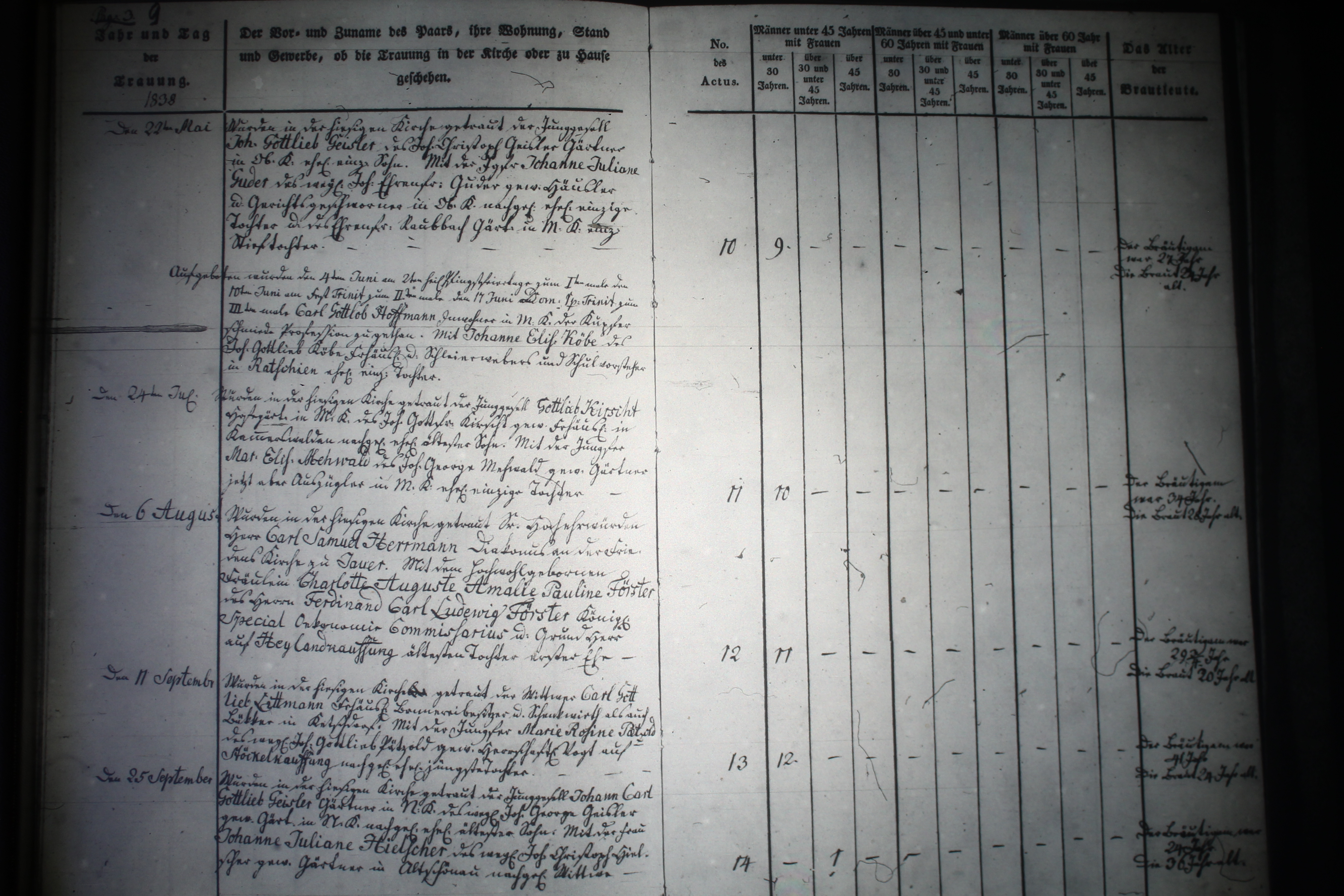 Text | Quellenscan: http://bilder.goldberg-haynau.de/Kauffung/Eheschliessungen/Ehen%201837-1841/mormon%20250.JPG [color=#FF0000]Quelle SE121, [/color] Ehen Kauffung 1838-03 Pag 9 Nr. 10 den 23. Mai 1838 wurde in der hiesigen Kirche getraut der Junggesell Johann Gottlieb Geisler, des Johann Christoph Geisler, Gärtner in Ober Kauffung ehelicher einziger Sohn mit der Jungfer Johanne Juliane Guder, des weiland Johann Ehrenfried Guder, gewesener Häusler und Gerichtsgeschworener in Ober Kauffung nachgelassene eheliche einzige Tochter, und des Ehrenfried Raubbach, Gärtner in Mittel Kauffung einzige Stieftochter. der Bräutigam war 27 Jahre, die Braut 24 Jahre alt. Aufgeboten: wurde den 4. Juni am 2. heiligen Pfingstfeiertage zum 1. Male, den 10. Juni am Fest Trinitates zum 2. Male, den 17. Juni Dom 1 nach Trinitates zum 3. Male Carl Gottlob Hoffmann, Inwohner in Mittel Kauffung, der Kupferschmiedeprofession zugetan. Mit Johanne Elisabeth Köbe, des Johann Gottlieb Köbe, Freihäusler und Schleierweber und Schulvorsteher in Ratschin (Tiefhartmansdorf) eheliche einzige Tochter. Nr. 11 den 24. Juli 1838 Wurde in der hiesigen Kirche getraut der Junggesell Gottlieb Kirscht, Hofegärtner in Mittel Kauffung, des Johann Gottfried Kirst, gewesener Freihäusler in Kammerswaldau nachgelassener ehelicher ältester Sohn. Mit der Jungfer Marie Elisabeth Mehwald, des Johann George Mehwald, gewesener Gärtner jetzt aber Auszügler in Mittel Kauffung eheliche einzige Tochter. der Bräutigam war 34 Jahre, die Braut 28 Jahre alt. Nr. 12 den 6. August 1838 Wurde in der hiesigen Kirche getraut Sr. Hochwürden Herr Carl Samuel Hermann, Diakonus der Friedenskirche zu Jauer. Mit dem hochwohlgeborenen Fräulein Charlotte Auguste Amalie Pauline Förster, des Herrn Ferdinand Carl Ludwig Förster, königlicher Special Oekonomier, Commißarius und Grundherr auf Heiland Kauffung älteste Tochter 1. Ehe. Der Bräutigam war 29 3/4 Jahre, die Braut 20 Jahre alt. Nr. 13 den 11. September 1838 Wurde in der hiesigen Kirche getraut der Wittwer Carl Gottlieb Littmann?, Freihäusler, Brauereibesitzer und Schenkwirth als auch Bäcker in Ketschdorf. Mit der Jungfer Marie Rosine Pätzold, des weiland Johann Gottlieb Pätzold, gewesener herrschaftlicher Vogt auf Stöckel Kauffung nachgelassene eheliche jüngste Tochter. Der Bräutigam war 41 Jahre, die Braut 24 Jahre alt. Nr. 14 den 25. September 1838 Wurde in der hiesigen Kirche getraut der Junggesell Johann Carl Gottlieb Geisler, Gärtner in Nieder Kauffung, des weiland Johann George Geisler, gewesener Gärtner in die nachgelassener ehelicher ältester Sohn. Mit der Frau Johanne Juliane Hielscher, des weiland Johann Christoph Hielscher, gewesener Gärtner in Altschönau nachgelassene Witwe. Der Bräutigam war 24 Jahre, die Braut 36 Jahre alt. | |