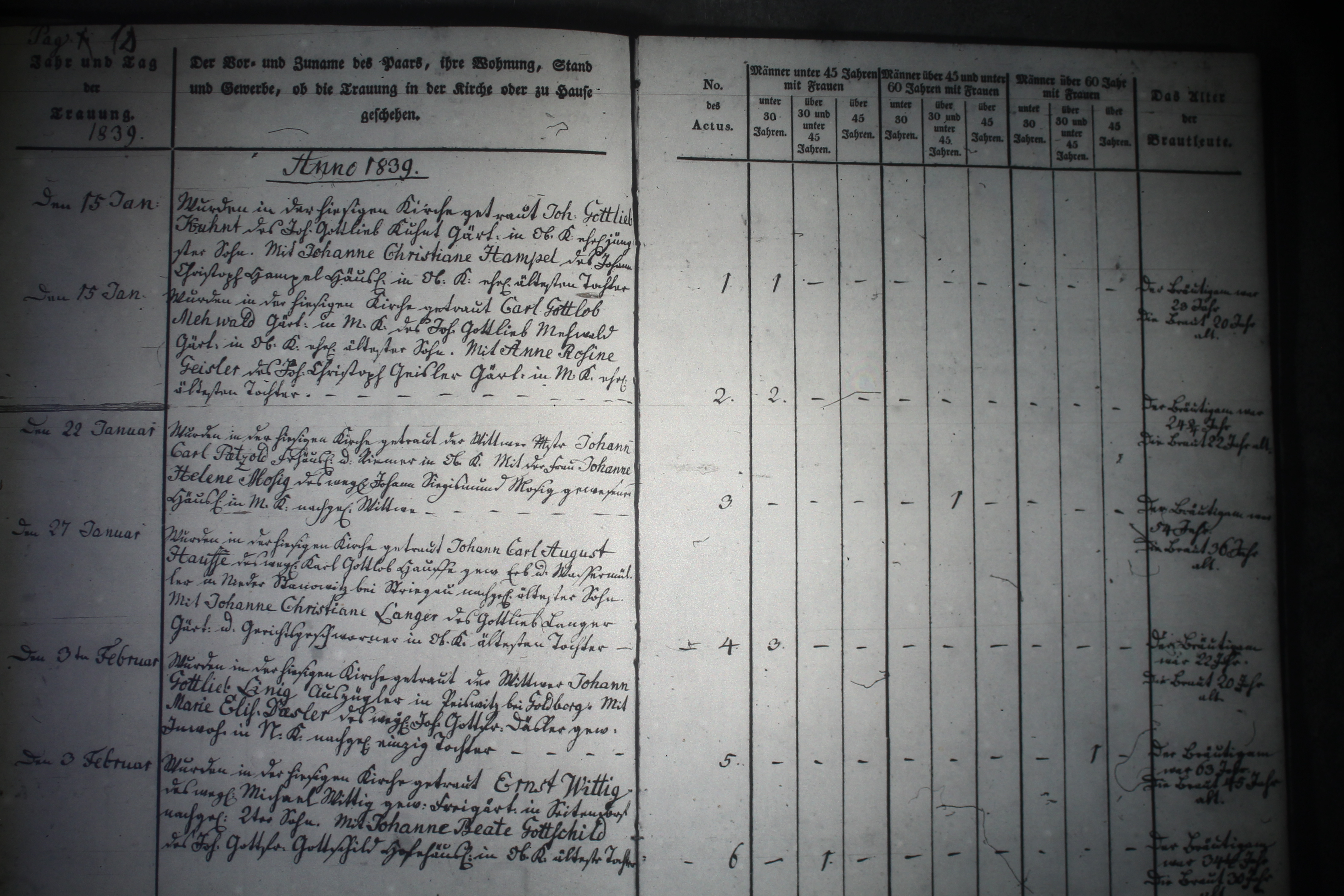 Text | Quellenscan: http://bilder.goldberg-haynau.de/Kauffung/Eheschliessungen/Ehen%201837-1841/mormon%20265.JPG [color=#FF0000]Quelle SE124, [/color] Ehen Kauffung 1839-01 Pag 12 Nr. 1 den 15. Januar 1839 Wurde in der hiesigen Kirche getraut Johann Gottlieb Kuhnt, des Johann Gottlieb Kuhnt, Gärtner in Ober Kauffung ehelicher jüngster Sohn. Mit Johanne Christiane Hampel, des Johann Christoph Hampel, Häusler in Ober Kauffung eheliche älteste Tochter. Der Bräutigam war 28 (23?), die Braut 20 Jahre alt. Nr. 2 am 15. Januar 1839 Wurde in der hiesigen Kirche getraut Carl Gottlob Mehwald, Gärtner in Mittel Kauffung, des Johann Gottlieb Mehwald, Gärtner in Ober Kauffung ehelicher ältester Sohn. Mit Anne Rosine Geisler, des Johann Christoph Geisler, Gärtner in Mittel Kauffung eheliche älteste Tochter der Bräutigam war 24 dreiviertel, die Braut 22 Jahre alt. Nr. 3 den 22. Januar 1839 wurden in der hiesigen Kirche getraut der Wittwer Meister Johann Carl Pätzold, Freihäusler und Riemer in Ober Kauffung. Mit der Frau Johanne Helene Mosig, des weiland Johann Sigismund Mosig, gewesener Häusler in Mittel Kauffung nachgelassene Witwe. der Bräutigam war 54 Jahre, die Braut 36 Jahre alt. Nr. 4 den 27. Januar 1839 Wurden in der hiesigen Kirche getraut Johann Carl August Hauffe, des weiland Karl Gottlob Hauffe, gewesener Erb-und Wassermüller in Nieder Stanowitz bei Stringau nachgelassener ehelicher ältester Sohn. Mit Johanne Christiane Langer, des Gottlieb Langer, Gärtner und Gerichtsgeschworener in Ober Kauffung älteste Tochter. Der Bräutigam war 22 Jahre, die Braut 20 Jahre alt. Nr. 5 den 3. Februar 1839 Wurden in der hiesigen Kirche getraut der Wittwer Johann Gottlieb Lienig, Auszügler in Priswitz? bei Goldberg. Mit Marie Elisabeth Dasler (Däsler), des weiland Johann Gottfried Däsler, gewesener Inwohner in Nieder Kauffung nachgelassene einzige Tochter. der Bräutigam war 63 Jahre, die Braut 45 Jahre alt. Nr. 6 den 3. Februar 1839 Wurden in der hiesigen Kirche getraut Ernst Wittig, des weiland Michael Wittig, gewesener Freigärtner in Seitendorf nachgelassener 2. Sohn. Mit Johanne Beate Gottschild, des Johann Gottfried Gottschild, Hofehäusler in Ober Kauffung älteste Tochter. Der Bräutigam war 34 ein halb Jahre, die Braut 30 Jahre alt. | |