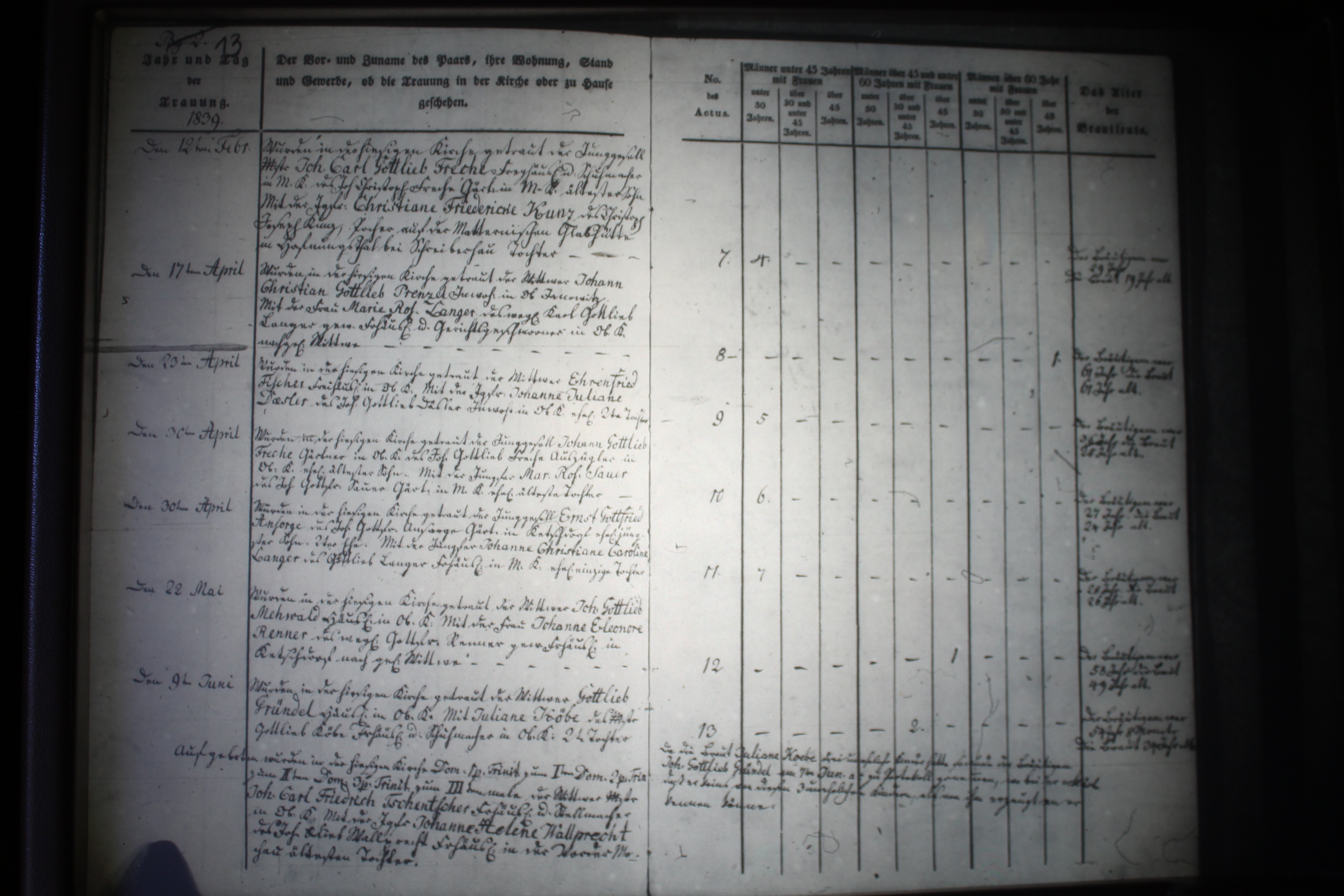 Text | Quellenscan: http://bilder.goldberg-haynau.de/Kauffung/Eheschliessungen/Ehen%201837-1841/mormon%20270.JPG [color=#FF0000]Quelle SE125, [/color] Ehen Kauffung 1839-02 Pag 13 Nr. 7 den 12. Februar 1839 Wurden in der hiesigen Kirche getraut der Junggesell Meister Johann Carl Gottlieb Freche, Freihäusler und Schumacher und Mittel Kauffung, des Johann Christoph Freche, Gärtner in Mittel Kauffung ältester Sohn. Mit der Jungfer Christiane Friederike Kunz, des Christoph Josef Kunz, Kocher? Auf der Matternischen Glashütte in Hoffnungsthal bei Schreiberhau Tochter. der Bräutigam war 29 Jahre, die Braut 19 Jahre alt. Nr. 8 den 17. April 1839 Wurden in der hiesigen Kirche getraut der Wittwer Johann Christian Gottlieb Prenzel, Inwohner in Ober Janowitz. mit der Frau Marie Rosine Langer, des weiland Carl Gottlieb Langer, gewesener Freihäusler und Gerichtsgeschworener in Ober Kauffung nachgelassene Witwe. Der Bräutigam war 61 Jahre die Braut 61 Jahre alt. Nr. 9 den 23. April 1839 Wurde in der hiesigen Kirche getraut der Wittwer Ehrenfried Fischer, Freihäusler in Ober Kauffung. Mit der Jungfer Johanne Juliane Däsler, des Johann Gottlieb Däsler, Inwohner in Ober Kauffung eheliche 2. Tochter Der Bräutigam war 36 Jahre, die Braut 25 Jahre alt. Nr. 10 den 30. April 1839 Wurde in der hiesigen Kirche getraut der Junggesell Johann Gottlieb Freche, Gärtner in Ober Kauffung, des Johann Gottlieb Freche, Auszügler in Ober Kauffung ehelicher ältester Sohn. Mit der Jungfer Marie Rosine Sauer, des Johann Gottfried Sauer, Gärtner in Mittel Kauffung eheliche älteste Tochter. Der Bräutigam war 27 Jahre, die Braut 24 Jahre alt. Nr. 11 den 30. April 1839 Wurden in der hiesigen Kirche getraut der Junggesell Ernst Gottfried Ansorge, des Johann Gottfried Ansorge, Gärtner in Ketschdorf ehelicher jüngster Sohn 2. Ehe. Mit der Jungfer Johanne Christiane Caroline Langer, des Gottlieb Langer, Freihäusler in Mittel Kauffung eheliche einzige Tochter. Der Bräutigam war 28 Jahre, die Braut 26 Jahre alt. Nr. 12 den 22. Mai 1839 Wurden in der hiesigen Kirche getraut der Wittwer Johann Gottlieb Mehwald, Häusler in Ober Kauffung. Mit der Frau Johanne Eleonore Renner, des weiland Gottfried Renner, gewesener Freihäusler in Ketschdorf nachgelassene Witwe. Der Bräutigam war 58 Jahre, die Braut 49 Jahre alt. Nr. 13 den 9. Juni 1839 In der hiesigen Kirche getraut der Wittwer Gottlieb Gründel, Häusler in Ober Kauffung. mit Juliane Köbe, des Meister Gottlieb Köbe, Freihäusler und Schumacher in Ober Kauffung 2. Tochter Der Bräutigam war 54 Jahre und 8 Monate alt, die Braut 34 Jahre alt. Anmerkung des Pastors: da die Braut Juliane Köbe 3 uneheliche Kinder hatte, so wurde der Bräutigam Johann Gottlieb Gründel am 7. Juni des Jahres zu Protokoll genommen, wobei er erklärte, dass er keins von diesen 3 unehelichen Kindern als von ihm erzeugt anerkennen könne. Aufgeboten: wurden in der hiesigen Kirche Dom 1 nach Trinitates zum 1., Dom 2 nach Trinitates zum 2., Dom 3 nach Trinitates zum 3. Male der Wittwer Meister Johann Carl Friedrich Tschentscher, Freihäusler und Stellmacher in Ober Kauffung. Mit der Jungfer Johanne Helene Wallprecht, des Johann Gottlieb Wallprecht, Freihäusler in der Vorder Mochau älteste Tochter. | |